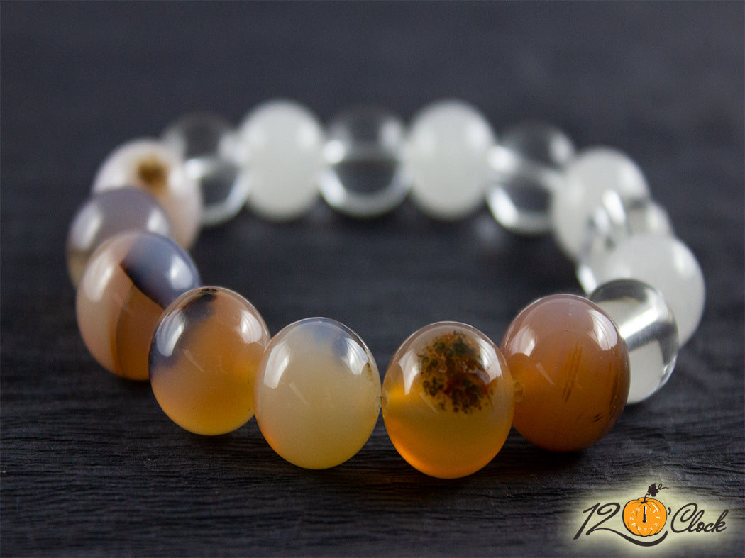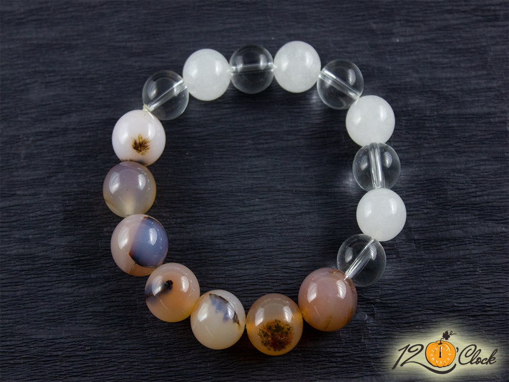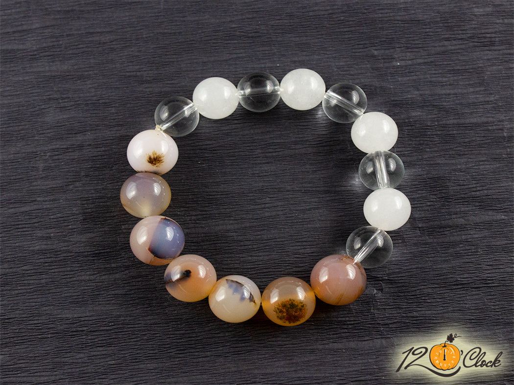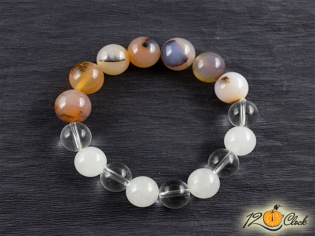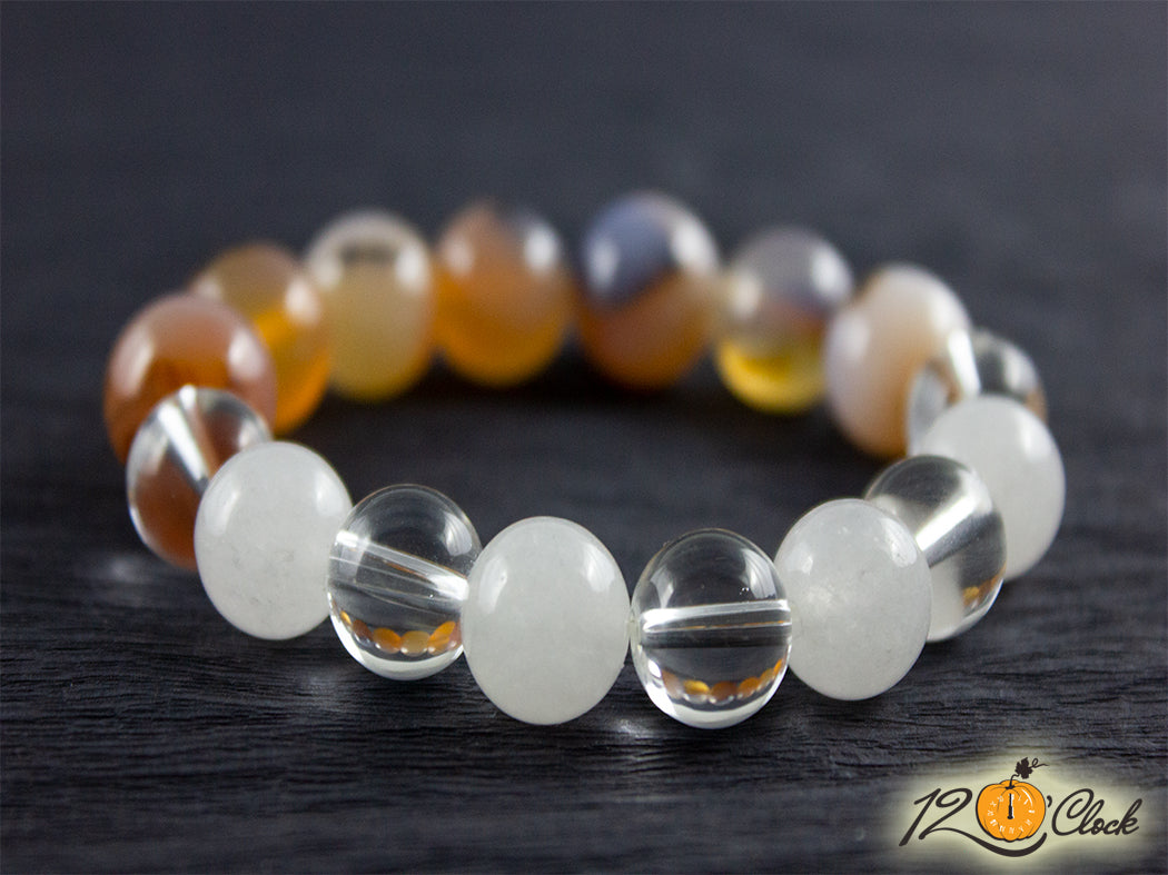 Ръчно изработена гривна с основа еластична корда и комбинация между млечно-бял кафяв ахат 14 мм, планински кристал 12 мм и халцедон 12 мм