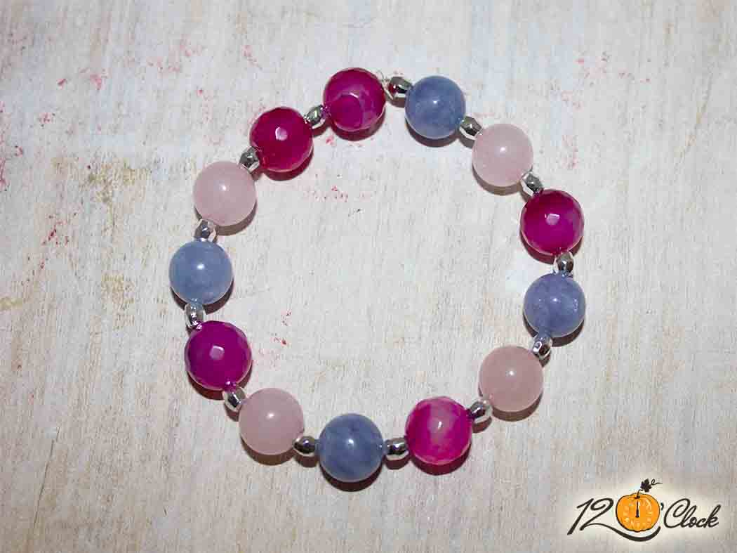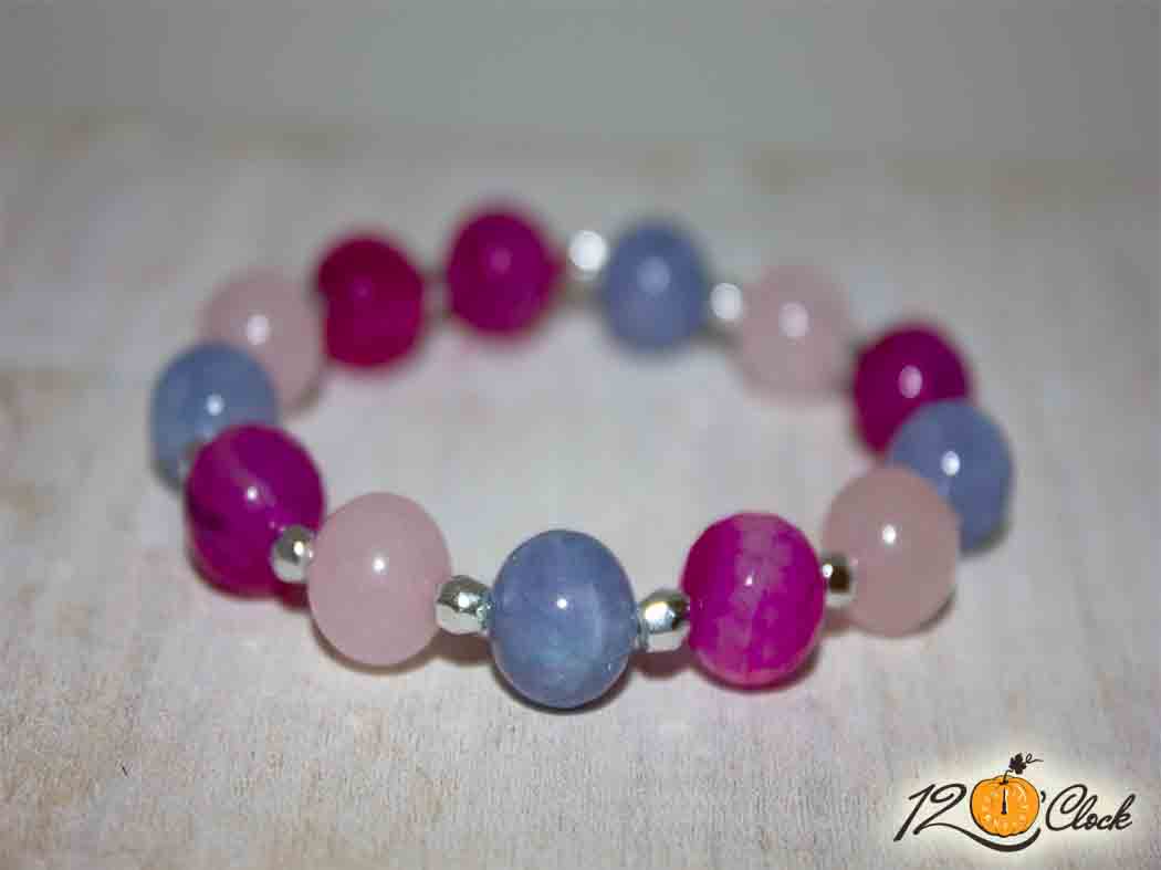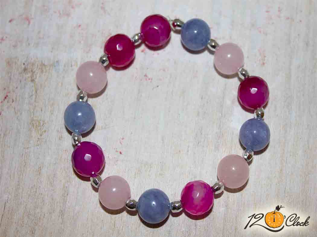 Ръчно изработена гривна от еластична корда и комбинация между розов ивчест ахат, кварц и аквамарин с размери 12 мм. Към камъните са добавени сребристи разделители