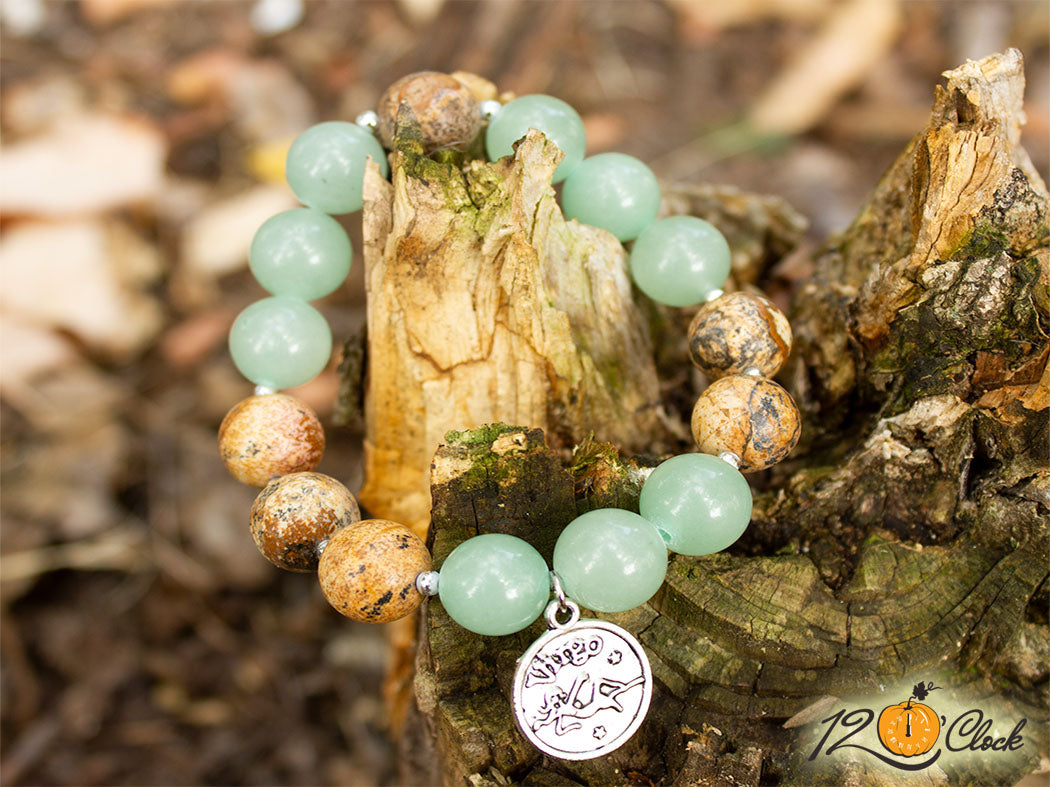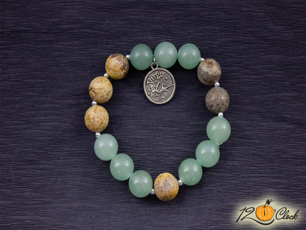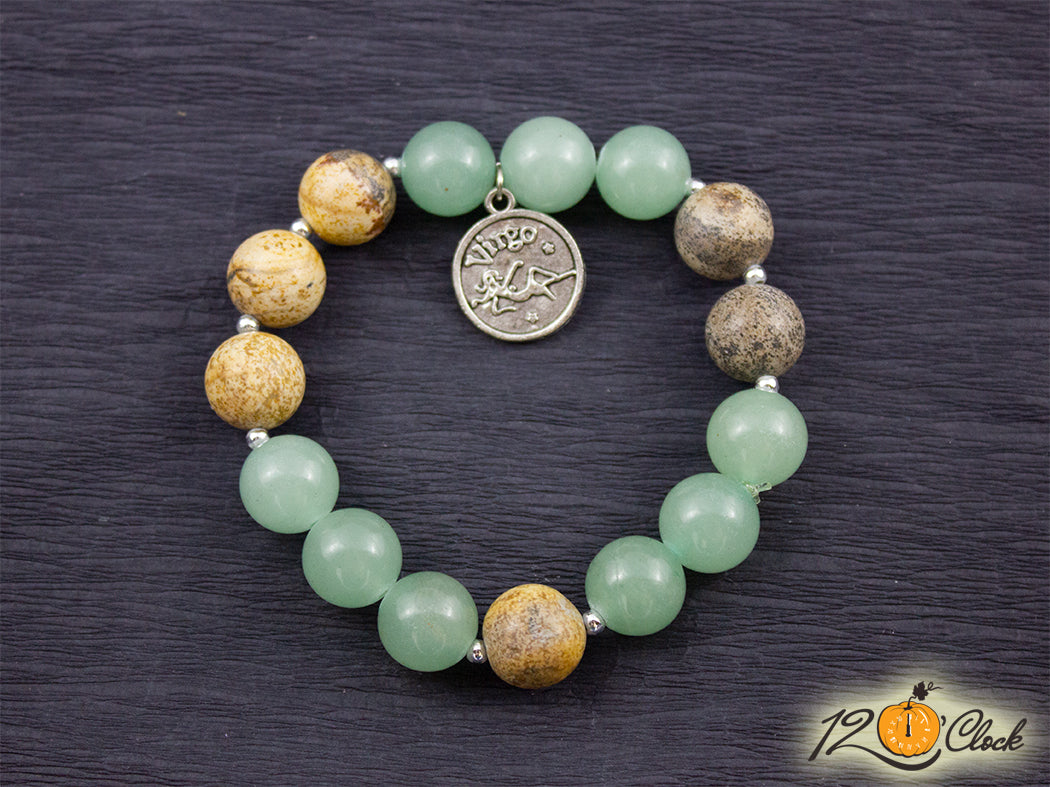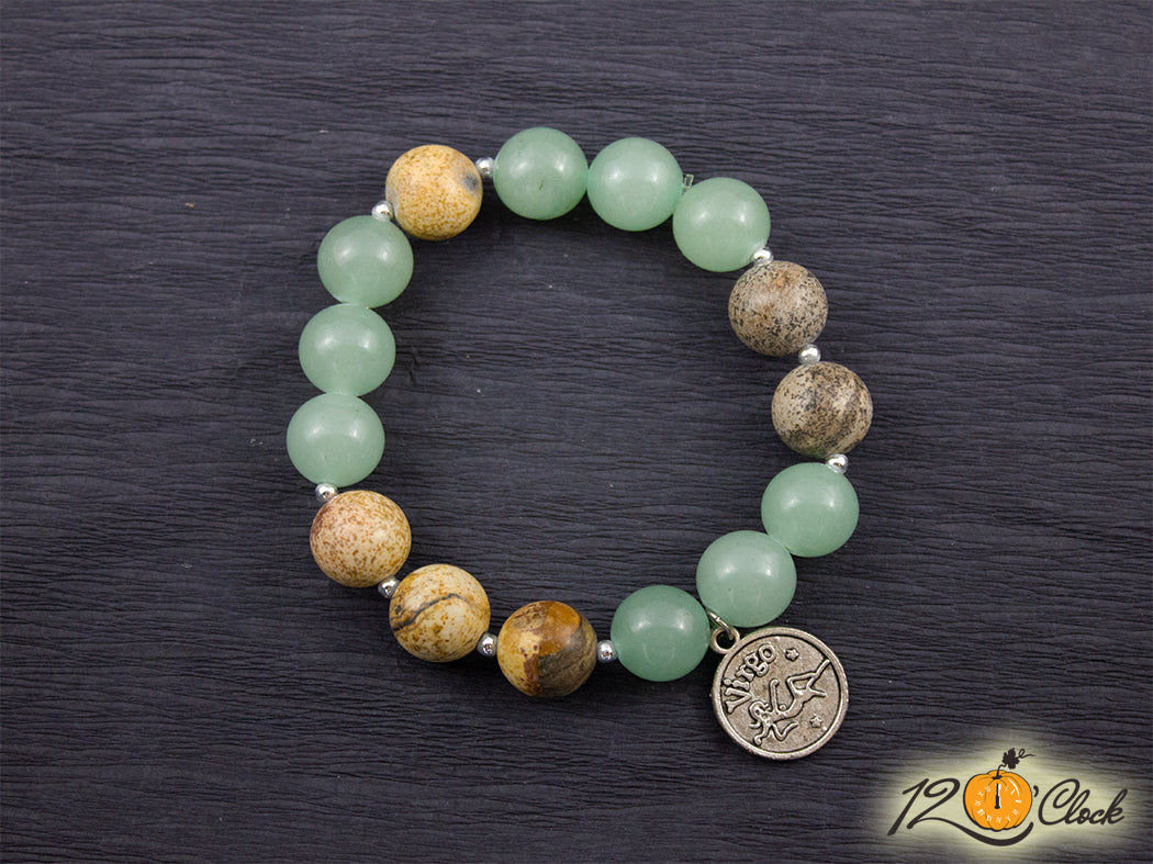 Ръчно изработена гривна с основа еластична корда и комбинация от авантюрин и яспис с размери 12 мм, декорирани със сребристи разделители тип топчета и сребриста висулка зодия