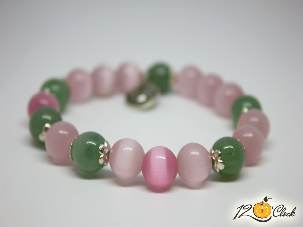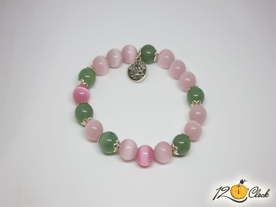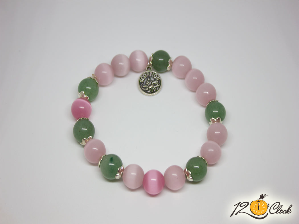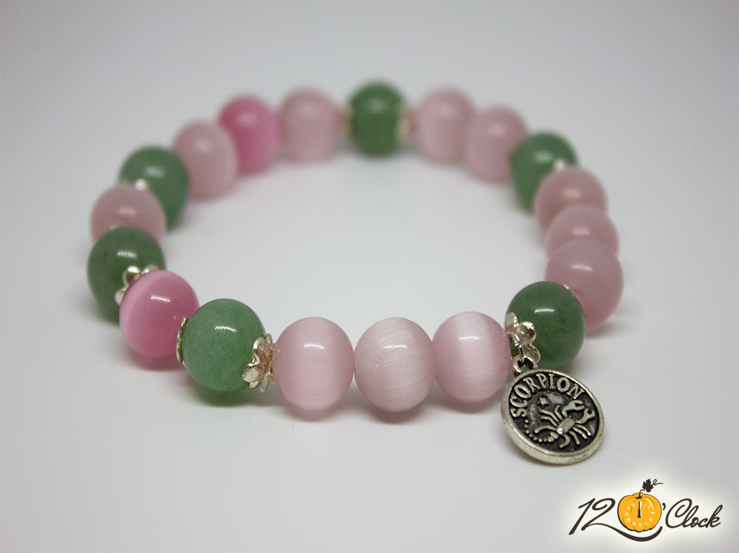 Ръчно изработена гривна с основа еластична корда и комбинация от авантюрин 10 мм и розово котешко око 10 мм, декорирани със сребристи разделители тип цветенца и зодиакална висулка