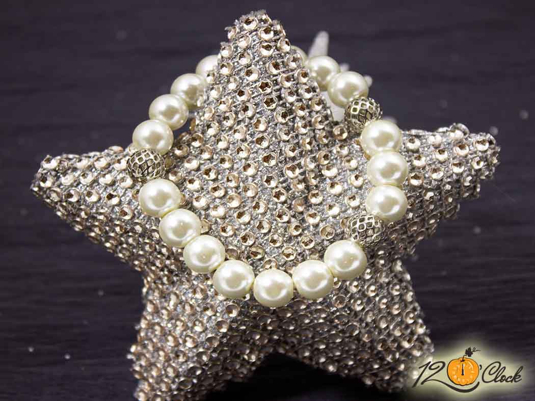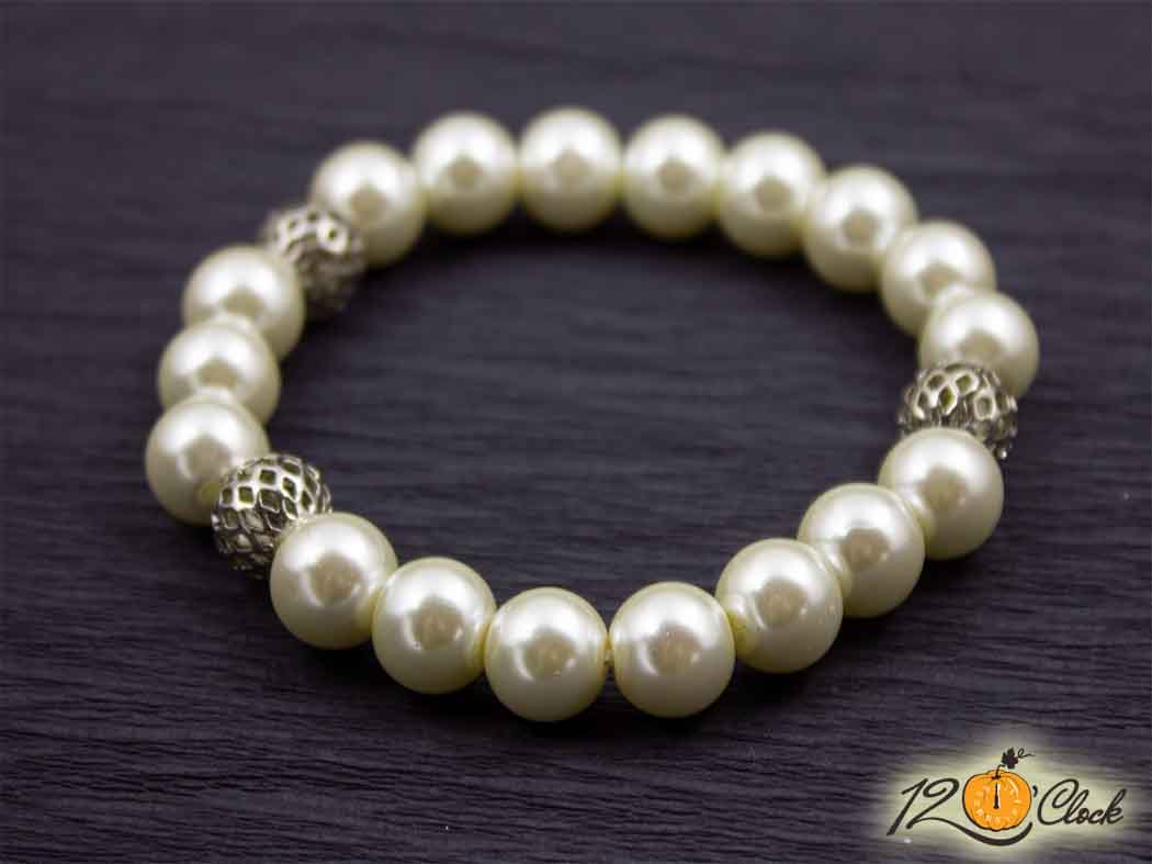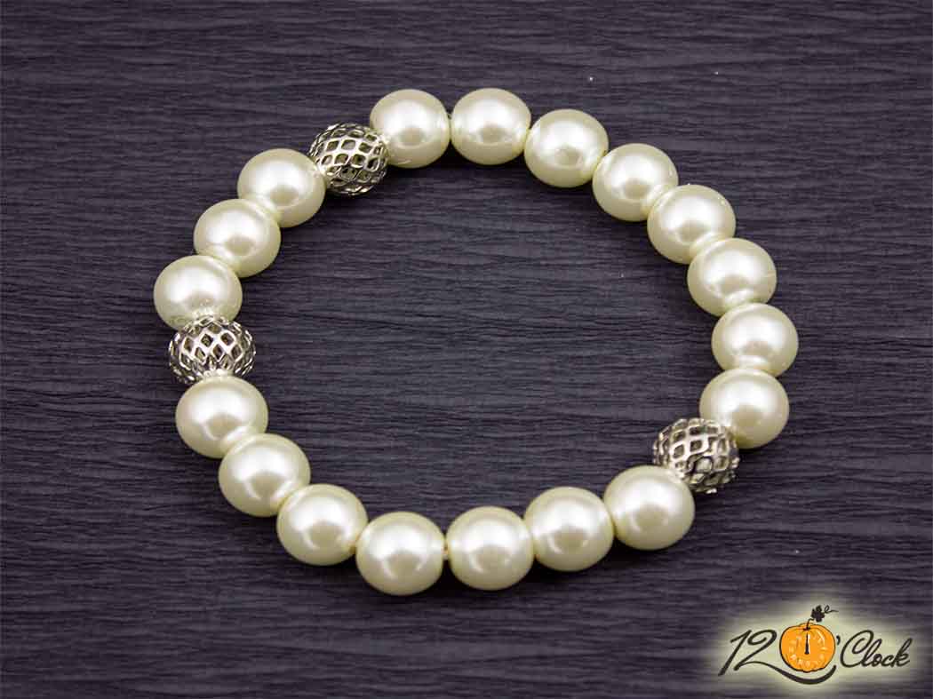 Елегантна гривна от бели стъклени перли 10 мм, декорирани със сребристи топчета