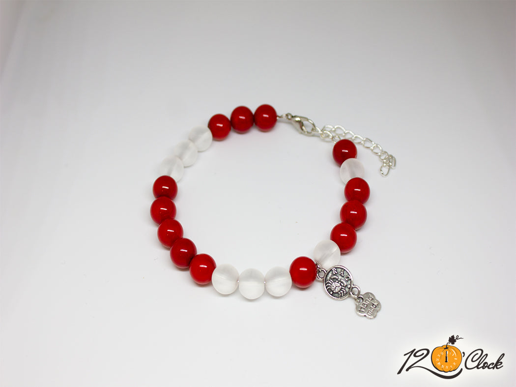 Ръчно изработена гривна с основа бижутерска тел, аранжирана със сребриста висулка и зодия, комбинирана с два вида камъни - червен корал 8 мм и планински кристал 6 мм.