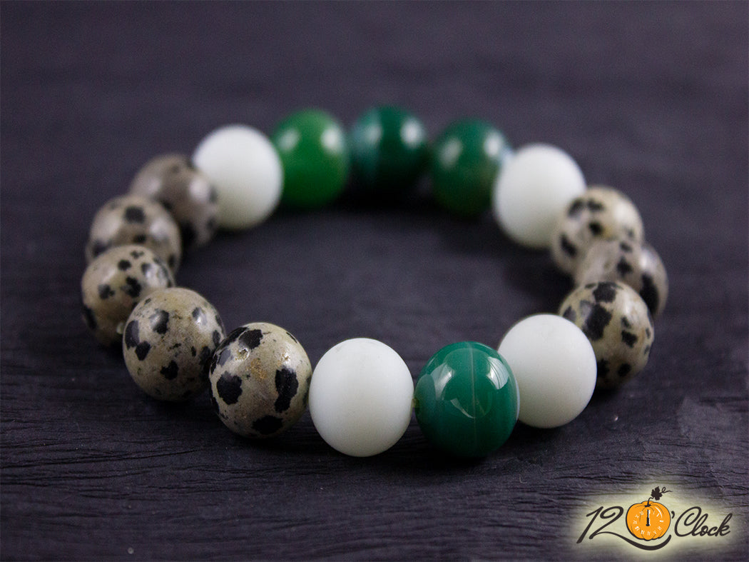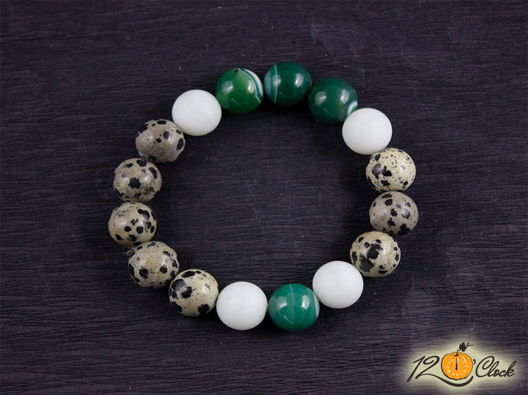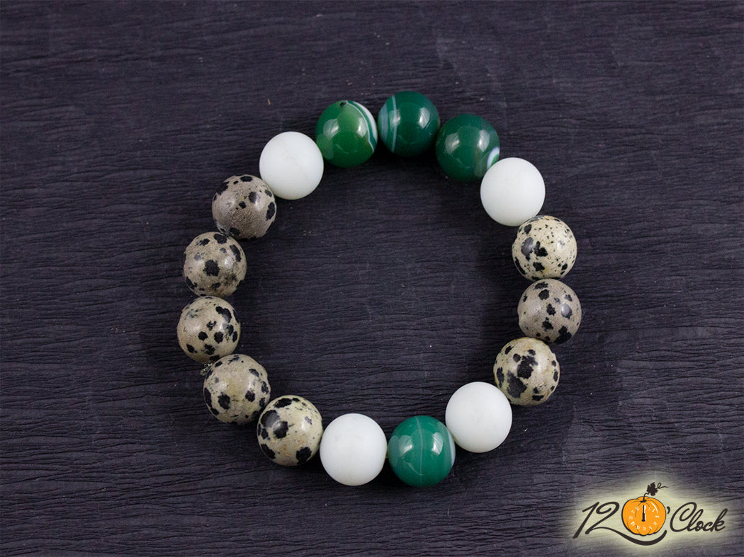 Ръчно изработена гривна с основа елестична корда комбинирана с три вида камъни - далматински яспис, зелен ивчест ахат и бял ахат мат с размер 12 мм