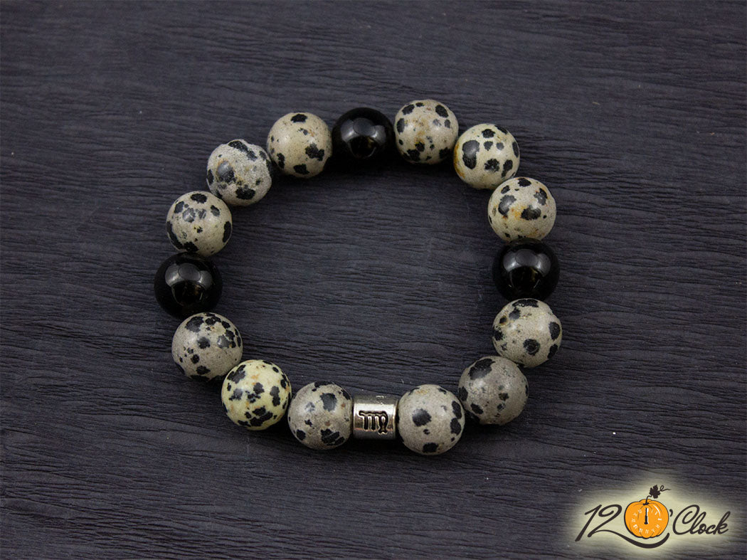 Гривна от далматински яспис и черен оникс 12 мм, в комбинация със сребриста зодия дева