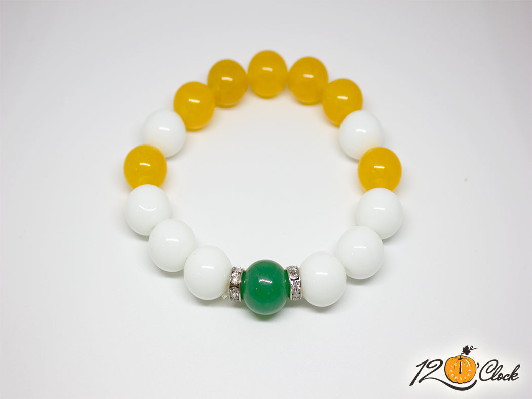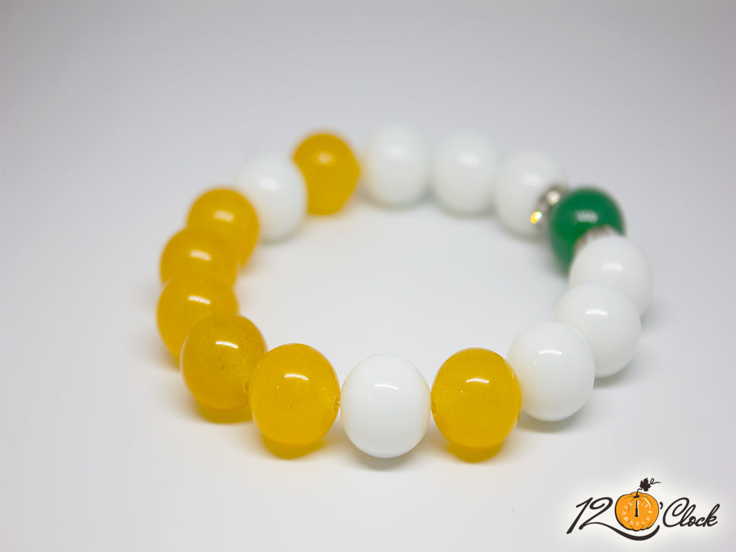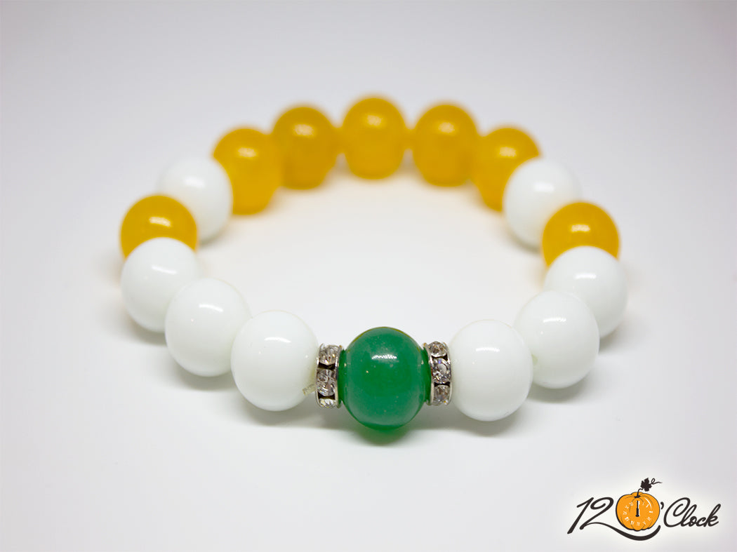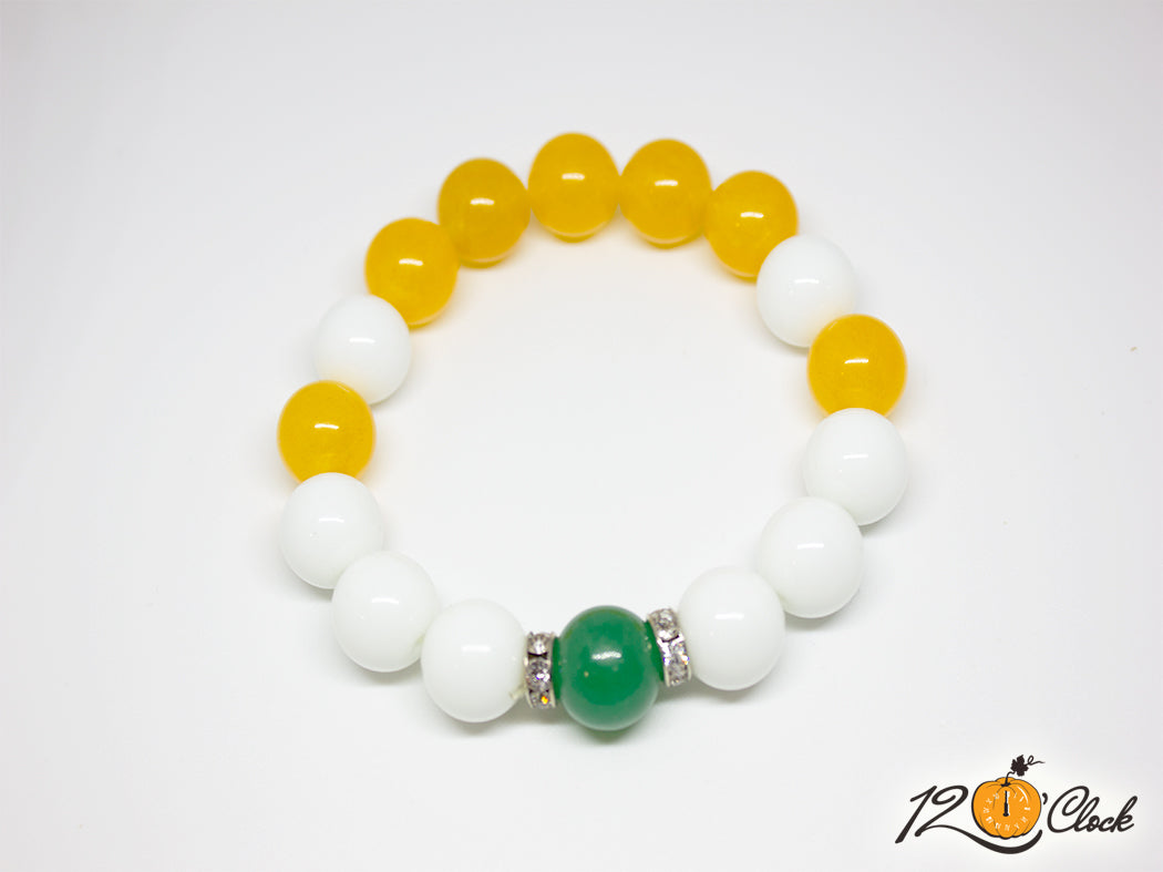 Цветна и свежа гривна с основа от еластична корда и комбинация между три вида камъни - жълт и зелен авантюрин 12 мм и бял ахат 12 мм. За повече блясък към тях са добавени и сребристи разделители с кристалчета