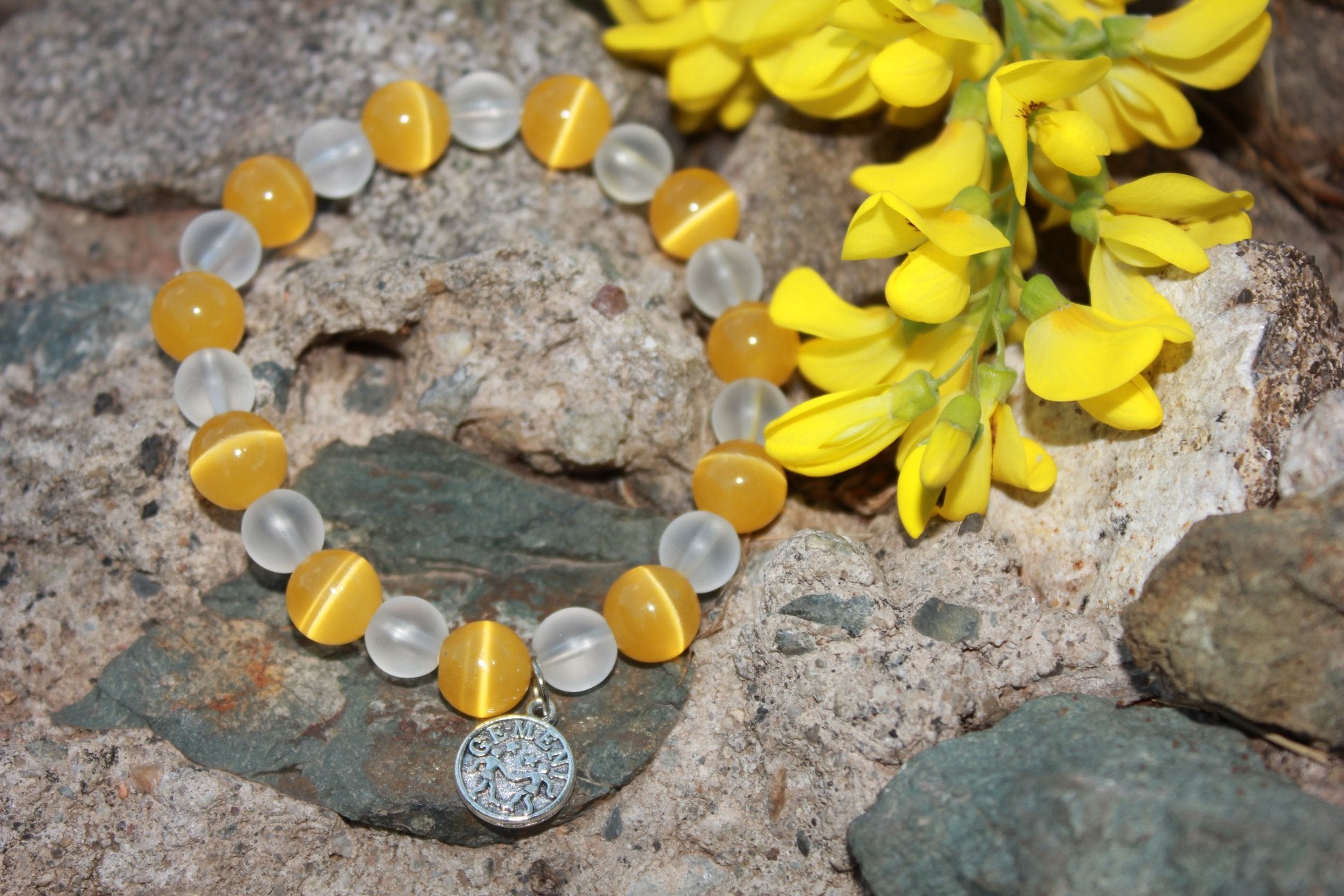 Ръчно изработена гривна с основа еластична корда и комбинация от два камъка - жълто котешко око 10 мм и планински кристал 8 мм в комбинация със сребриста зодия.