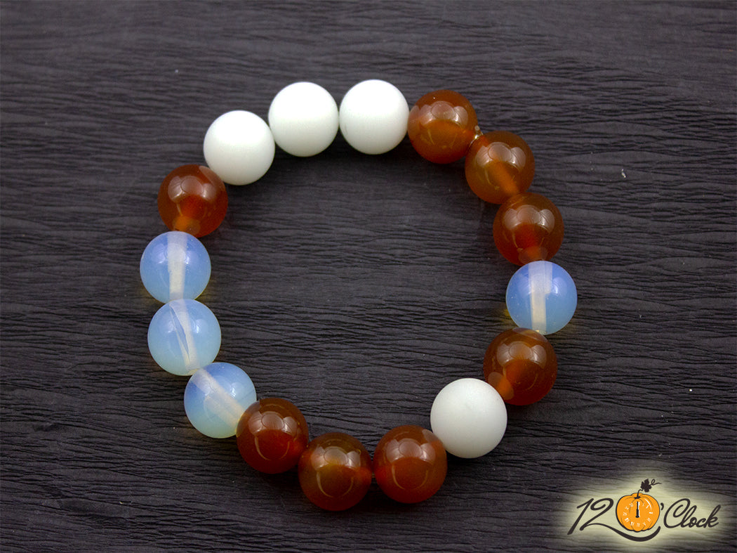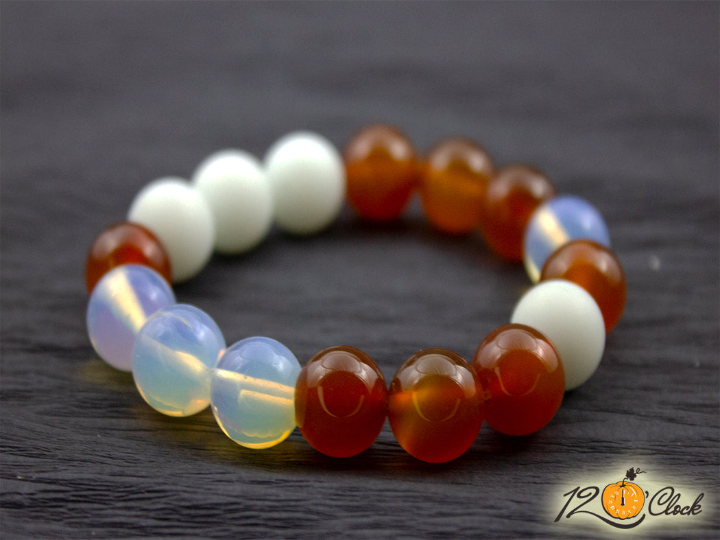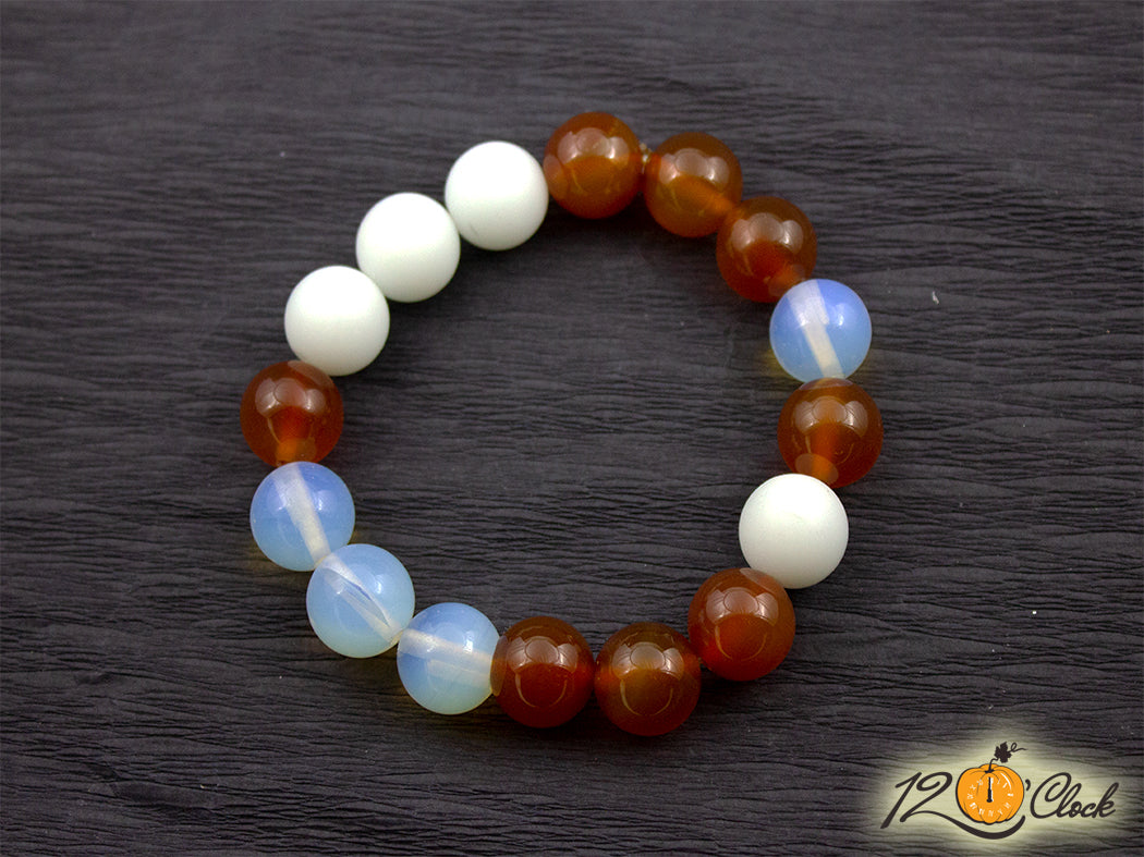 Ръчно изработена гривна с онова еластична корда, и камъни с големина 12 мм от карнеол, ахат и лунен камък.