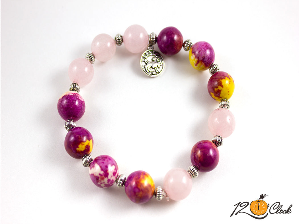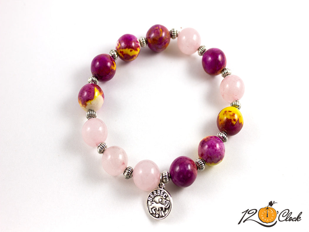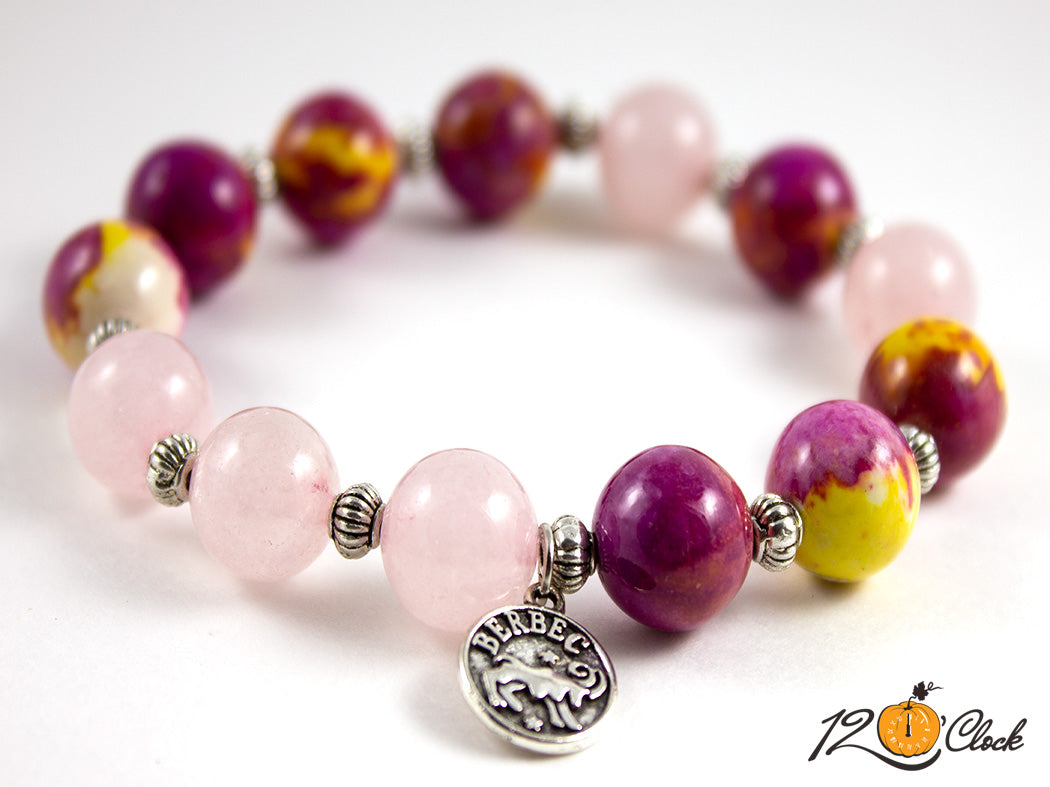 Ръчно изработена гривна с основа от еластична корда и комбинация между мукаит 12 мм и розов кварц 12 мм. Камъните са разнообразени със сребристи разделители и зодия