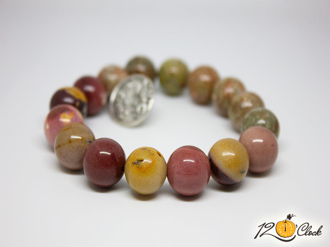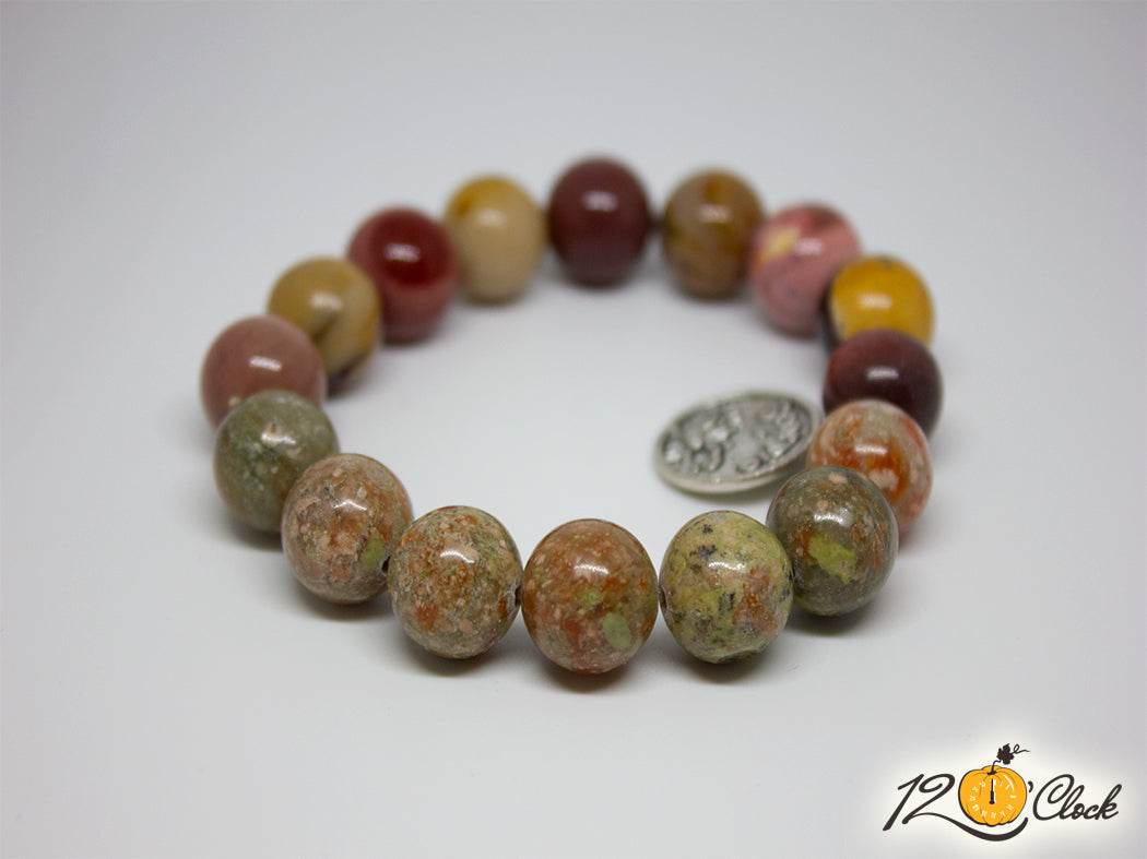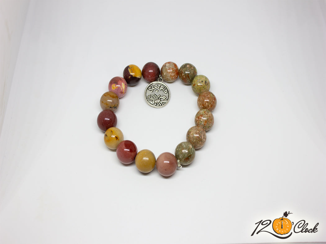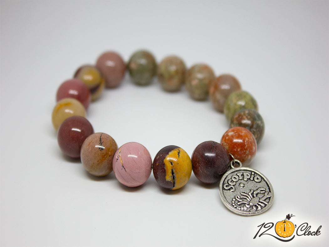 Ръчно изработена гривна с основа еластична корда и комбинация от мукаит 12 мм и унакит 12 мм, декорирани със сребриста висулка зодия