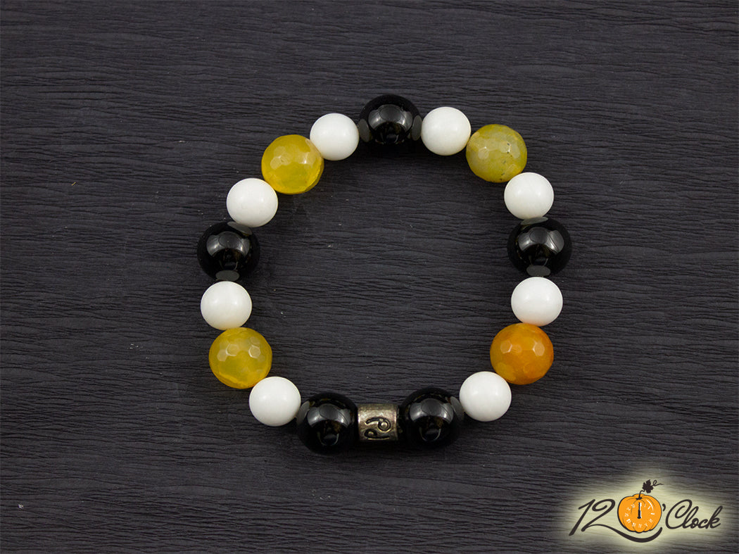 Ръчно изработена гривна с основа бижутерска корда и сребриста зодия, комбинирана с три вида камъни - оникс 12 мм, жълт ахат 12 мм и седеф 10 мм.