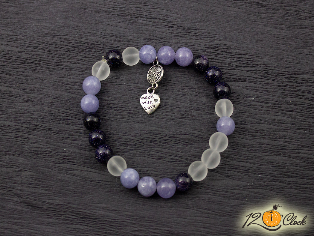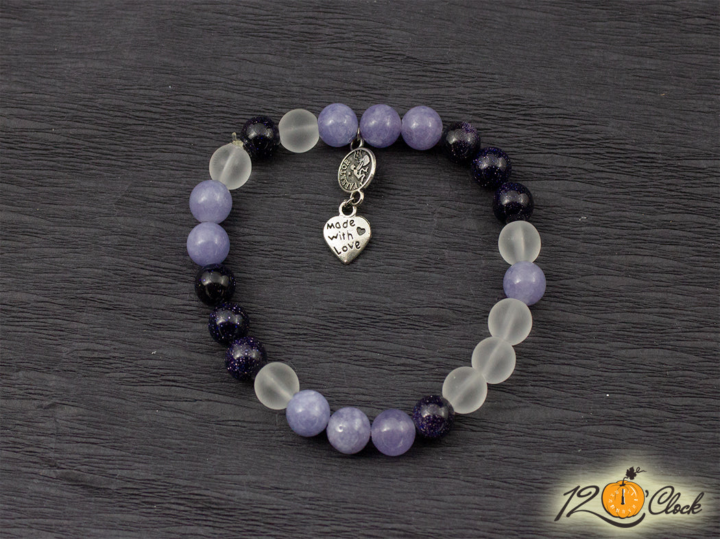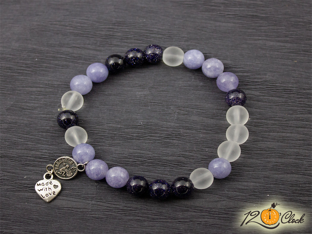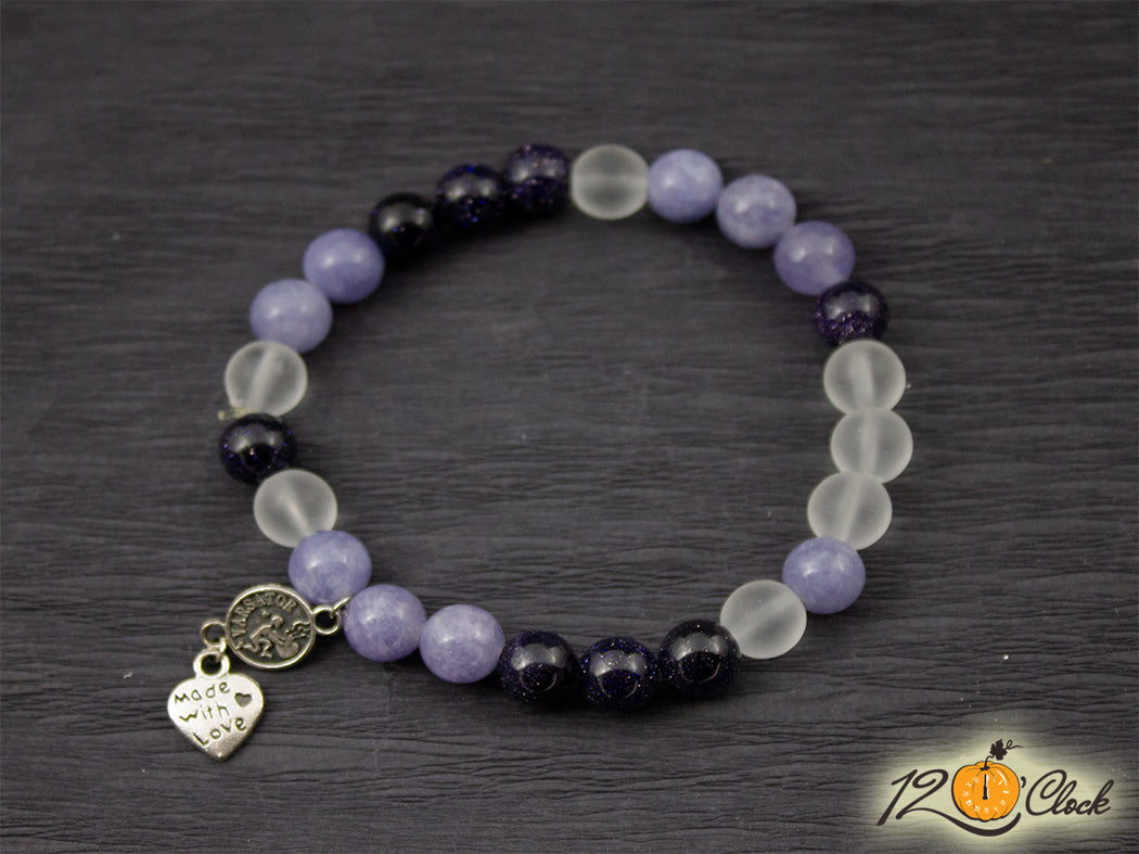 Ръчно изработена гривна с основа еластична корда и комбинация от три вида камъни - слънчев камък 8 мм, планински кристал мат 8 мм и аквамарин 8 мм. Към камъните са добавени метална халка, зодия и висулка сърце.
