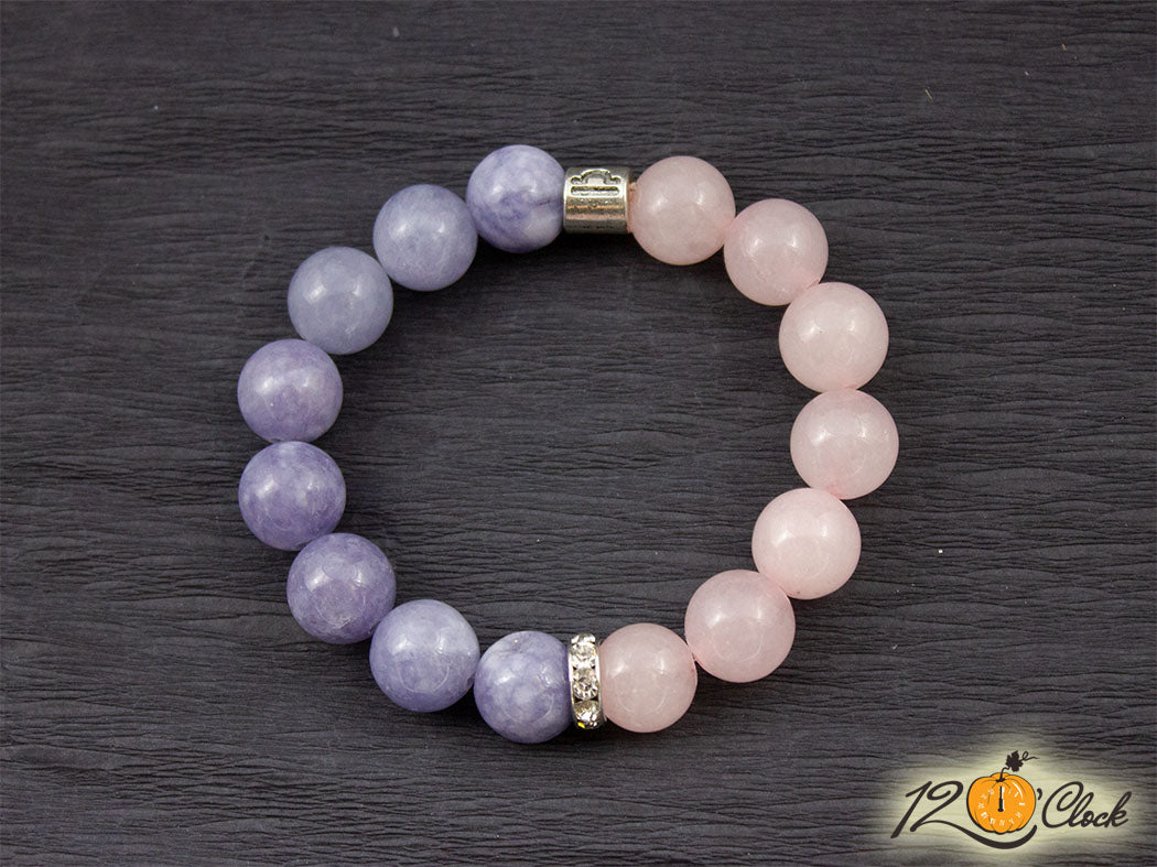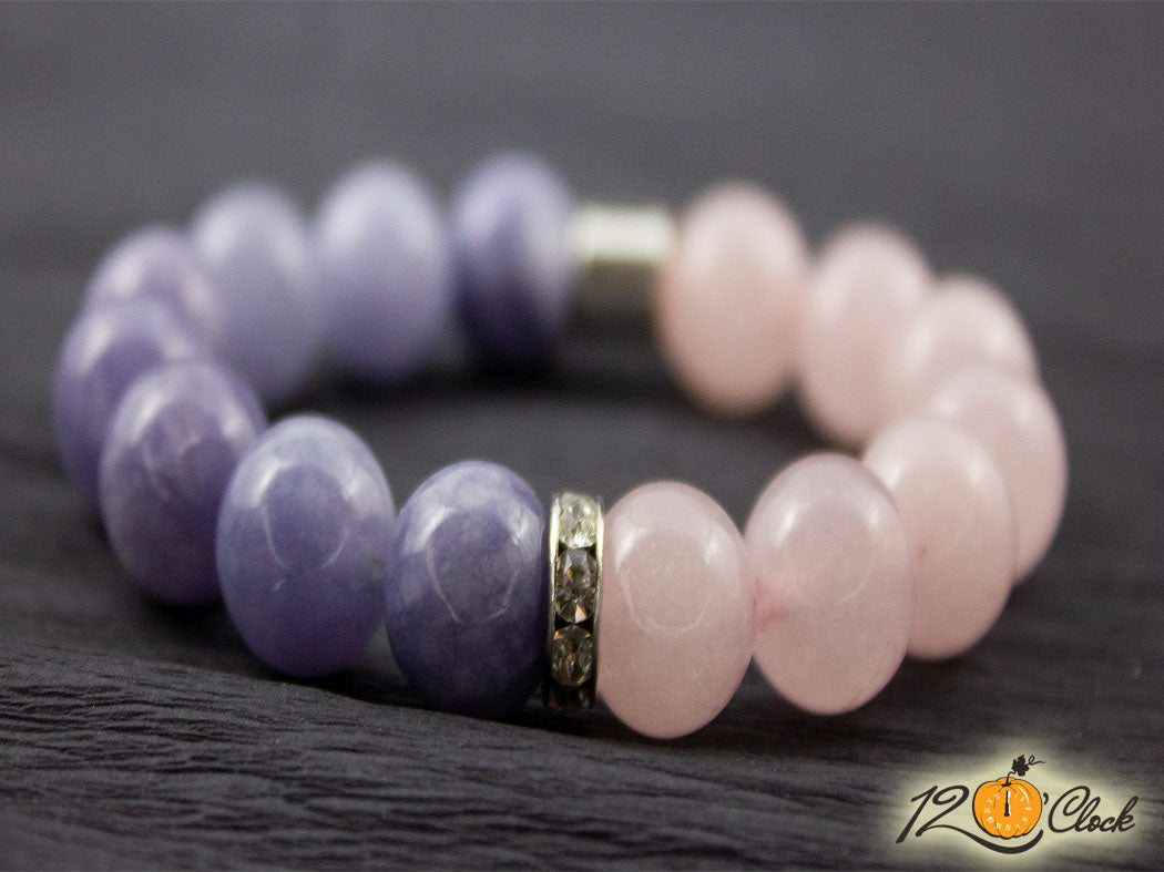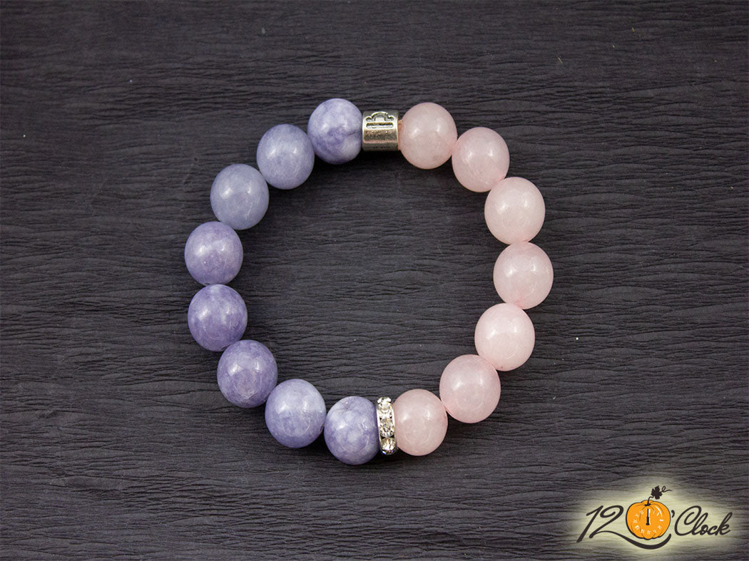Ръчно изработена гривна с основа еластична корда и комбинация между розов кварц 12мм и аквамарин 12мм, декорирани с блестящи ограничители