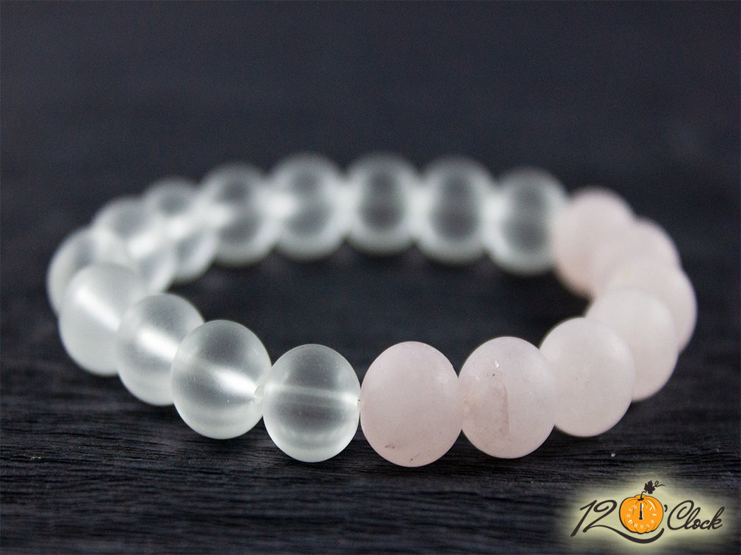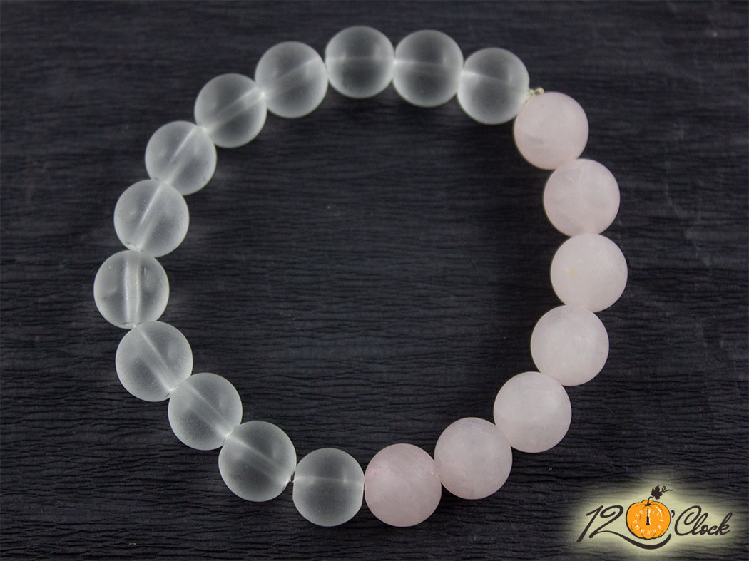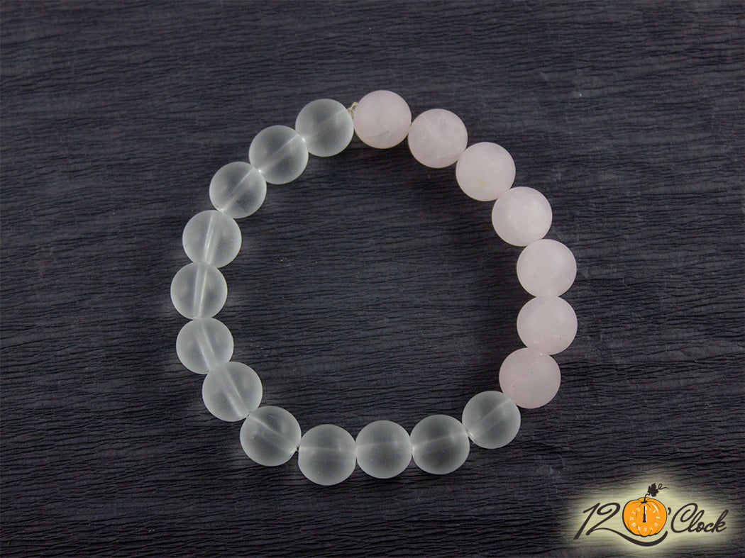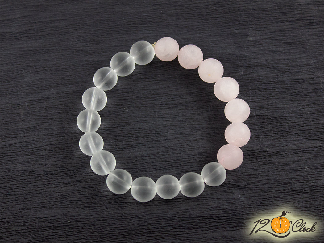 Ръчно изработена гривна с основа еластична корда и комбинация между розов кварц мат 10 мм и планински кристал мат 10 мм