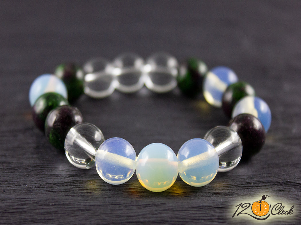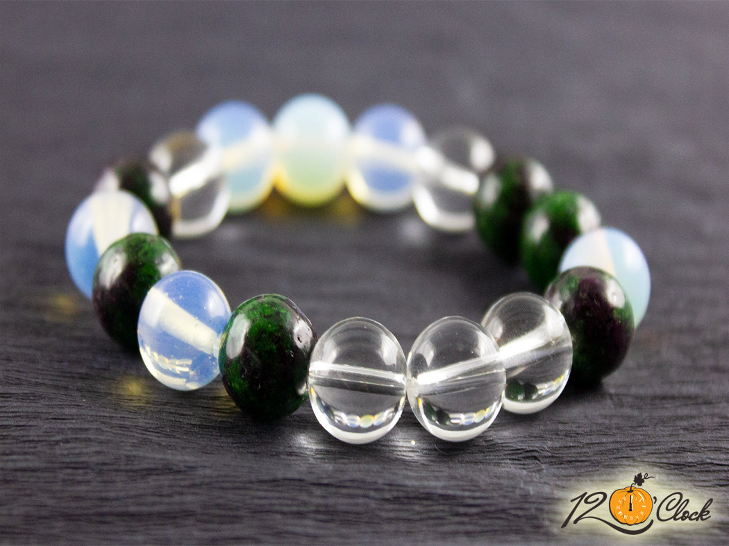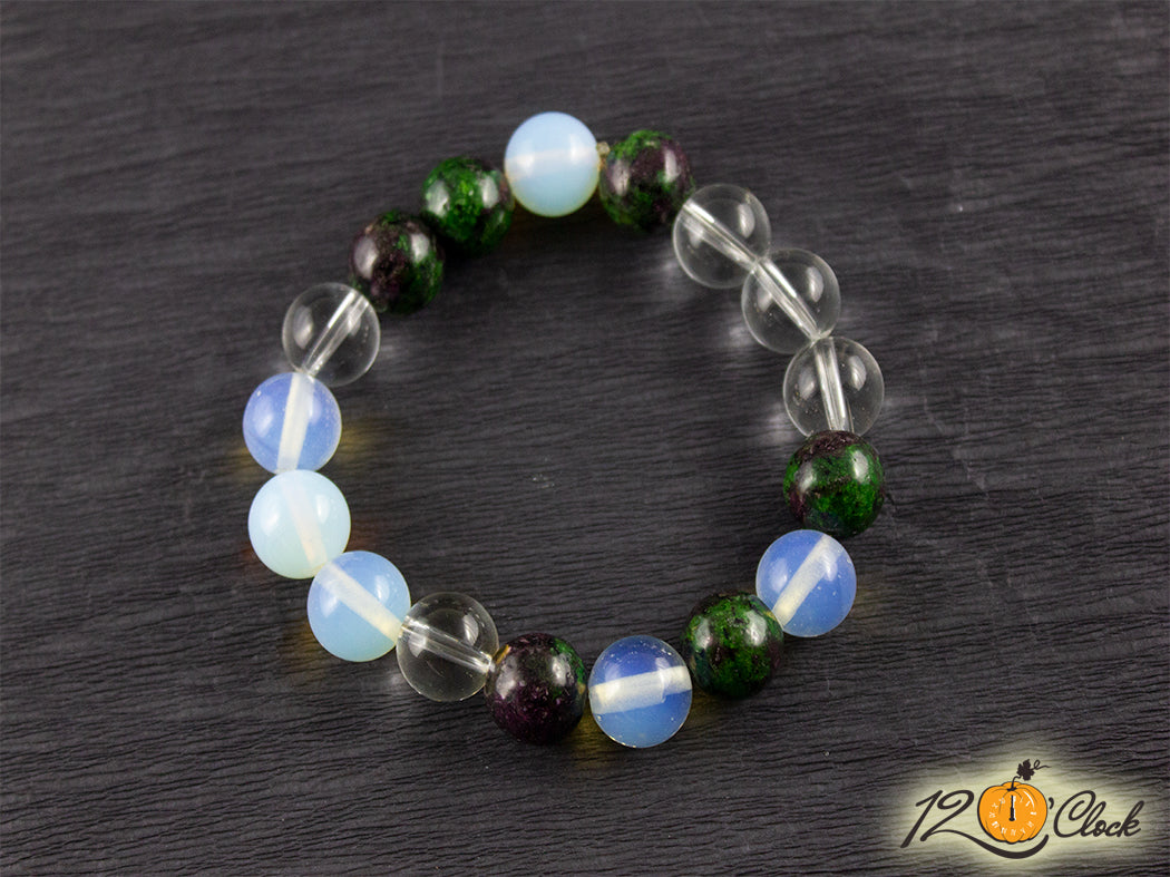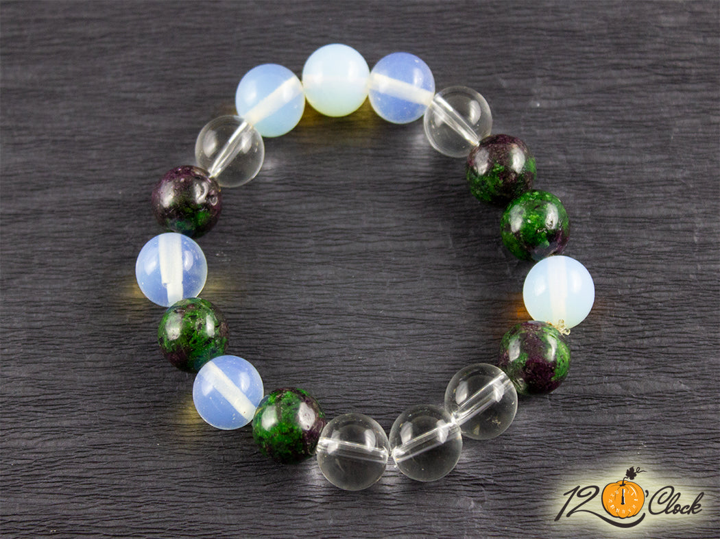Ръчно изработена гривна с основа еластична корда и комбинация между три вида камъни - рубин зоисит 12 мм, лунен камък 12 мм и планински кристал 12 мм