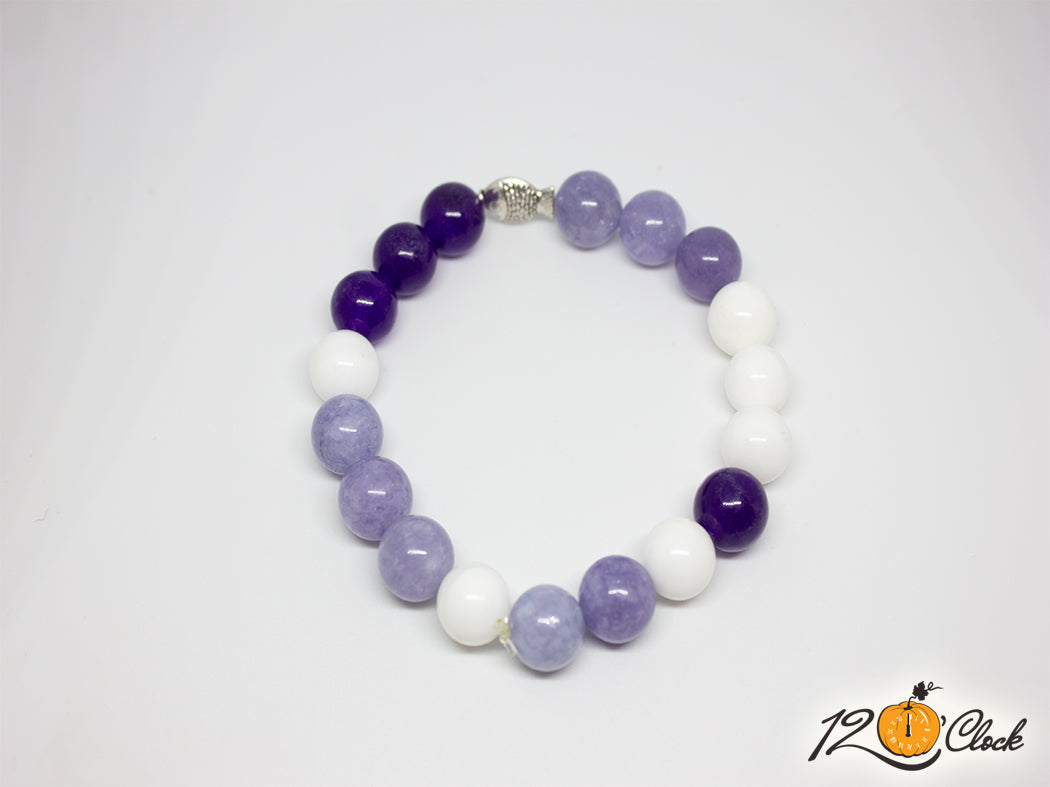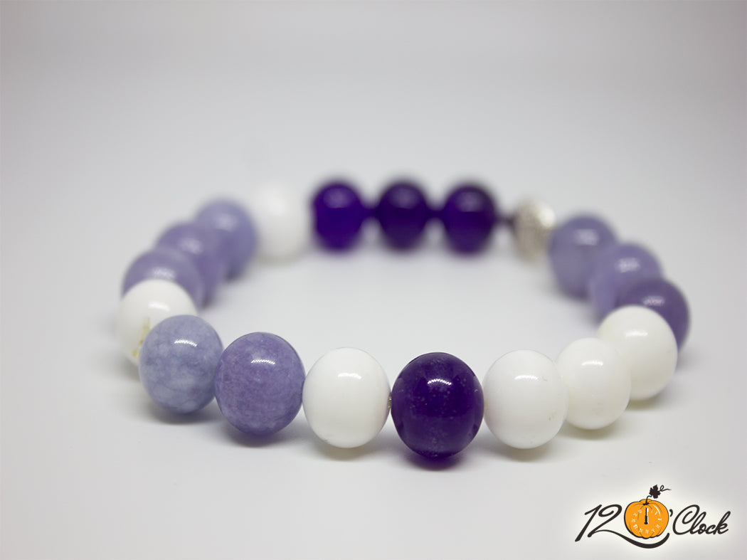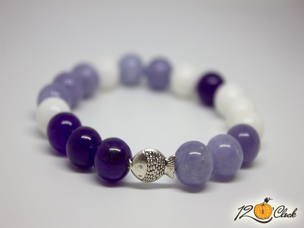 Ръчно изработена гривна с основа еластична корда и комбинация от три вида камъни - седеф 10 мм, аквамарин 10 мм и руски аметист 10 мм. Към камъните е добвена и сребриста зодия.