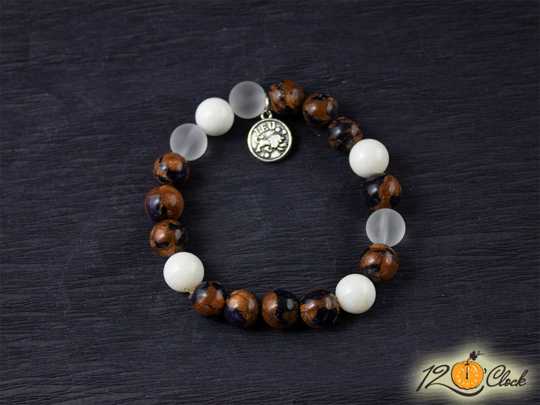 Ръчно изработена гривна с основа еластична корда и комбинация от три вида камъни - слънчев камък 10 мм, седеф 10 мм и планински кристал мат 10 мм, допълнени със сребриста зодия.