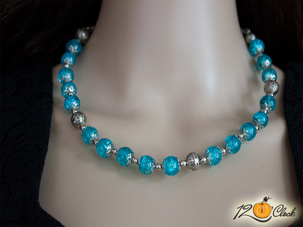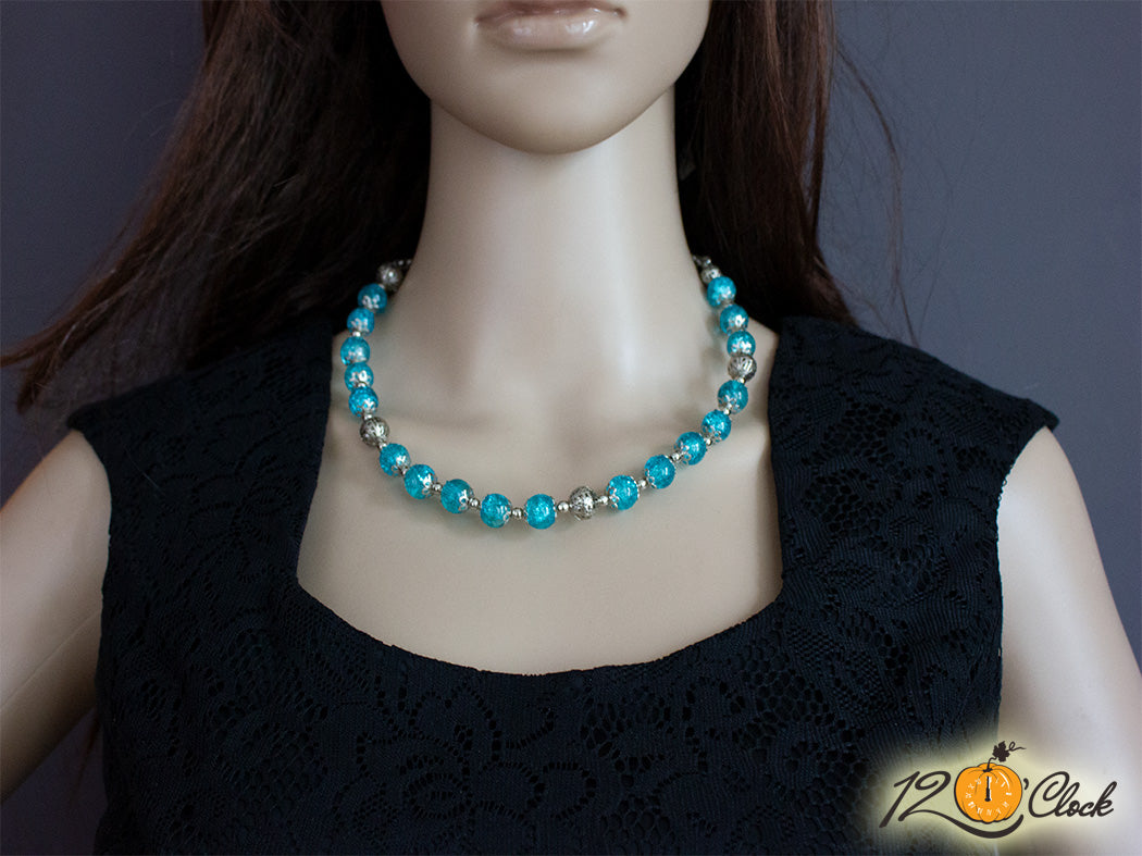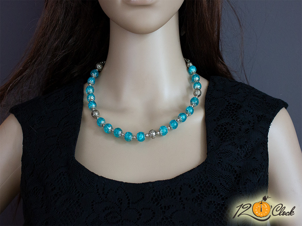 Твърдо метално колие със сини стъклени кракъл мъниста 10мм, сребристи топчета и закопчалки