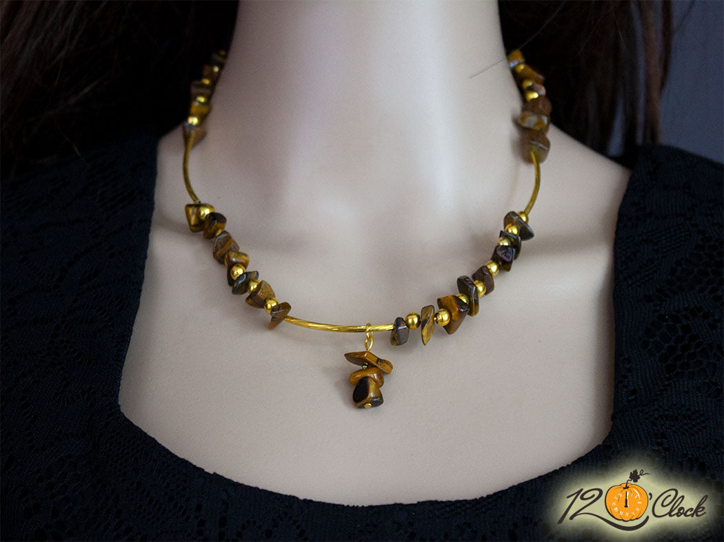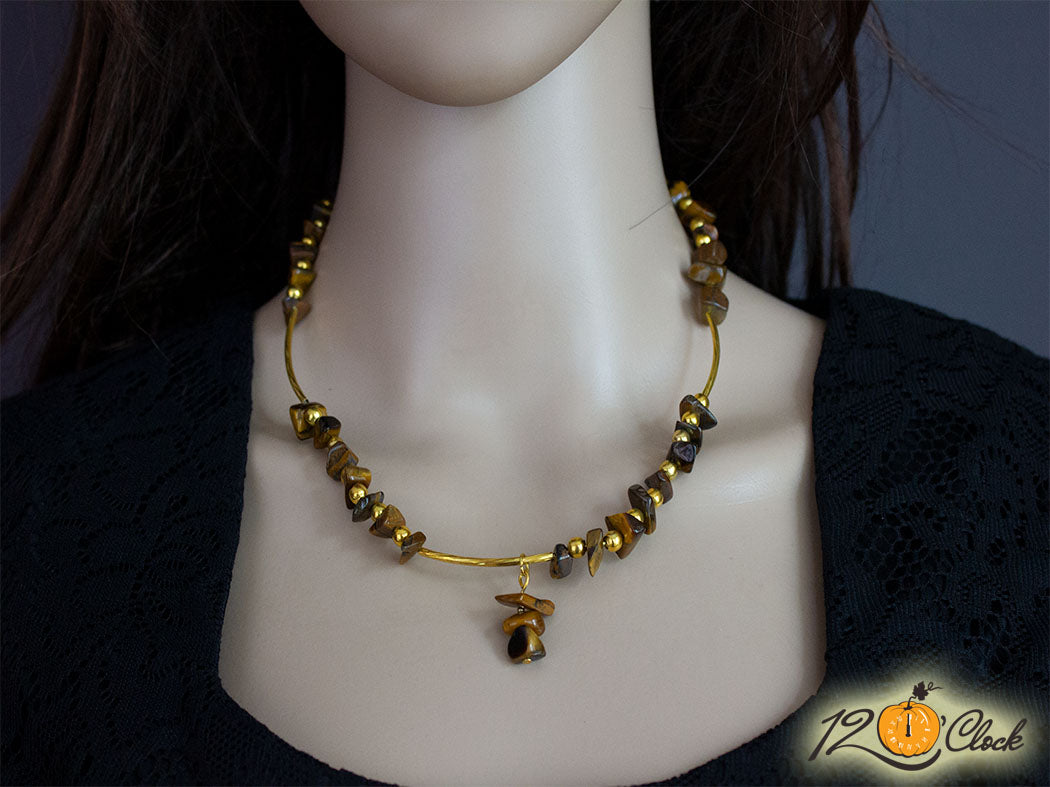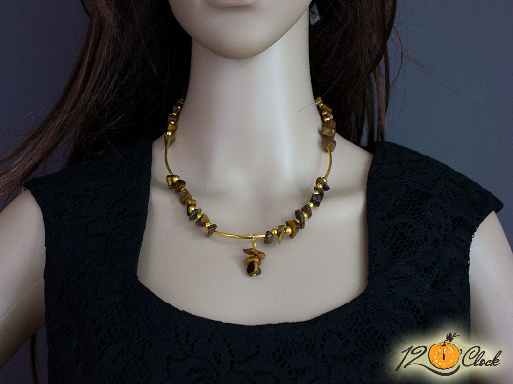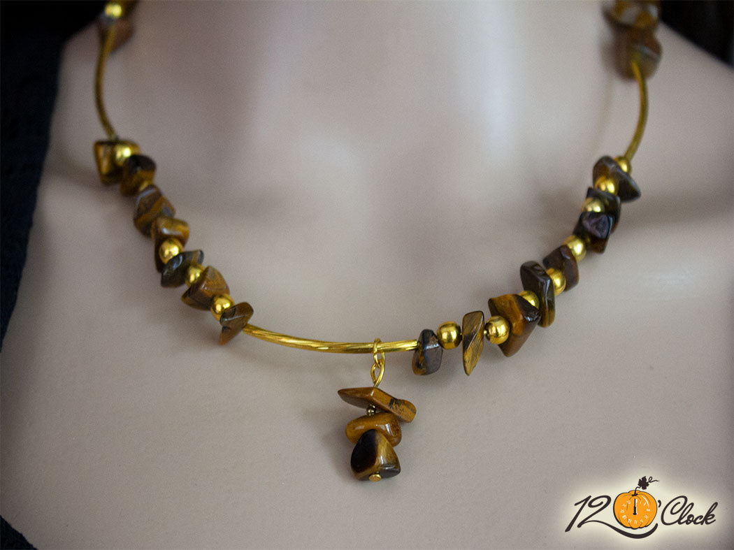 Твърдо метално колие с чипс от тигрово око, златисти топчета и декоративни елементи.