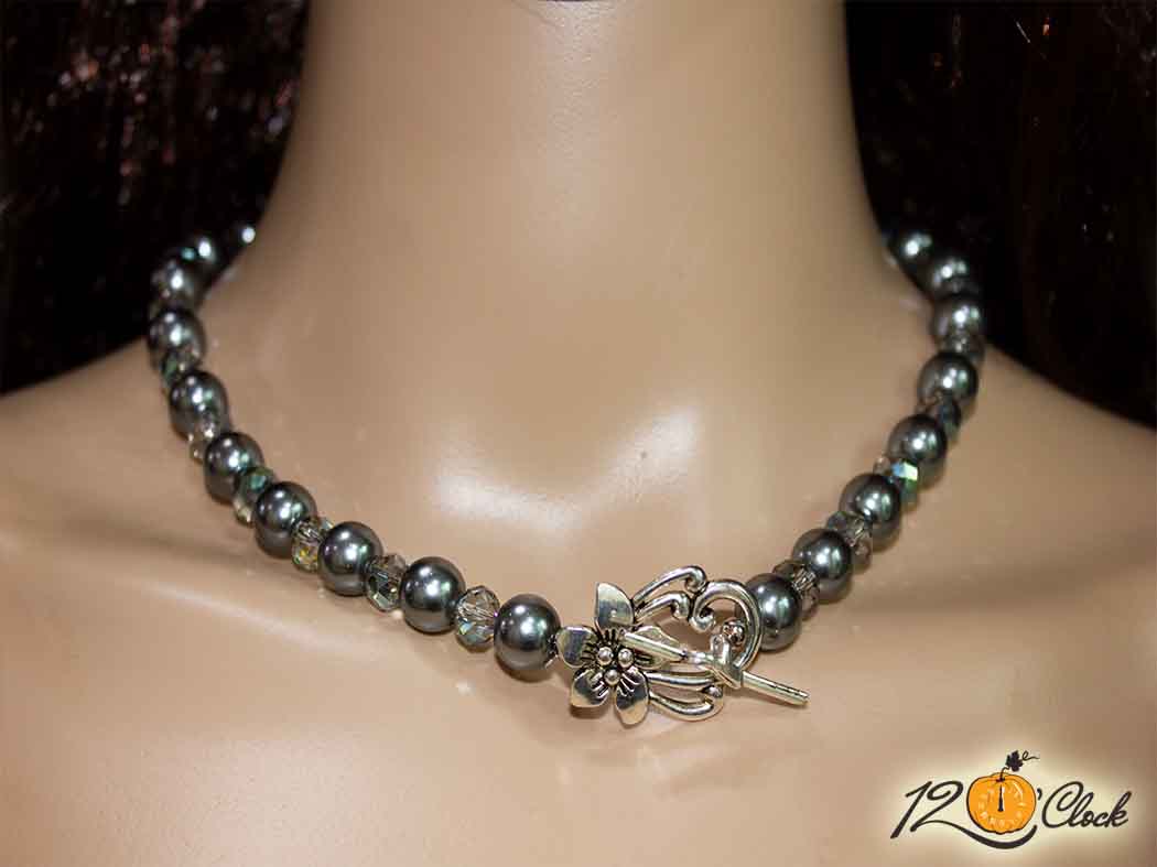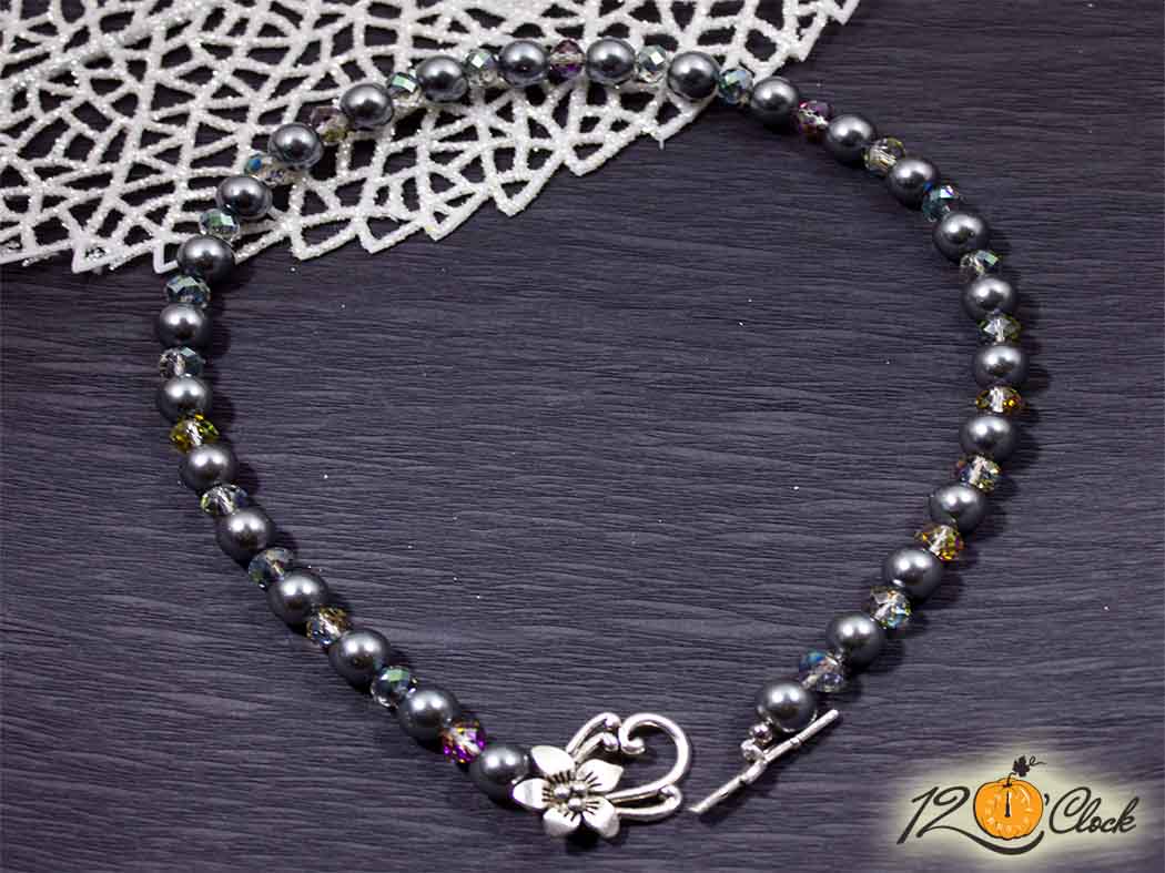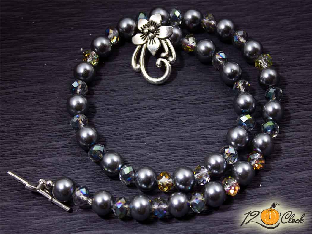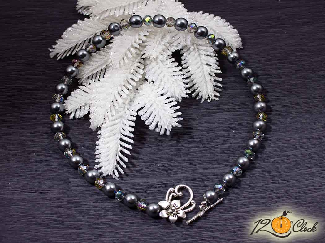 Колие от стъклени перли 10 мм, с цвят графит, декорирани с разноцветни критали и атрактивна закопчалка