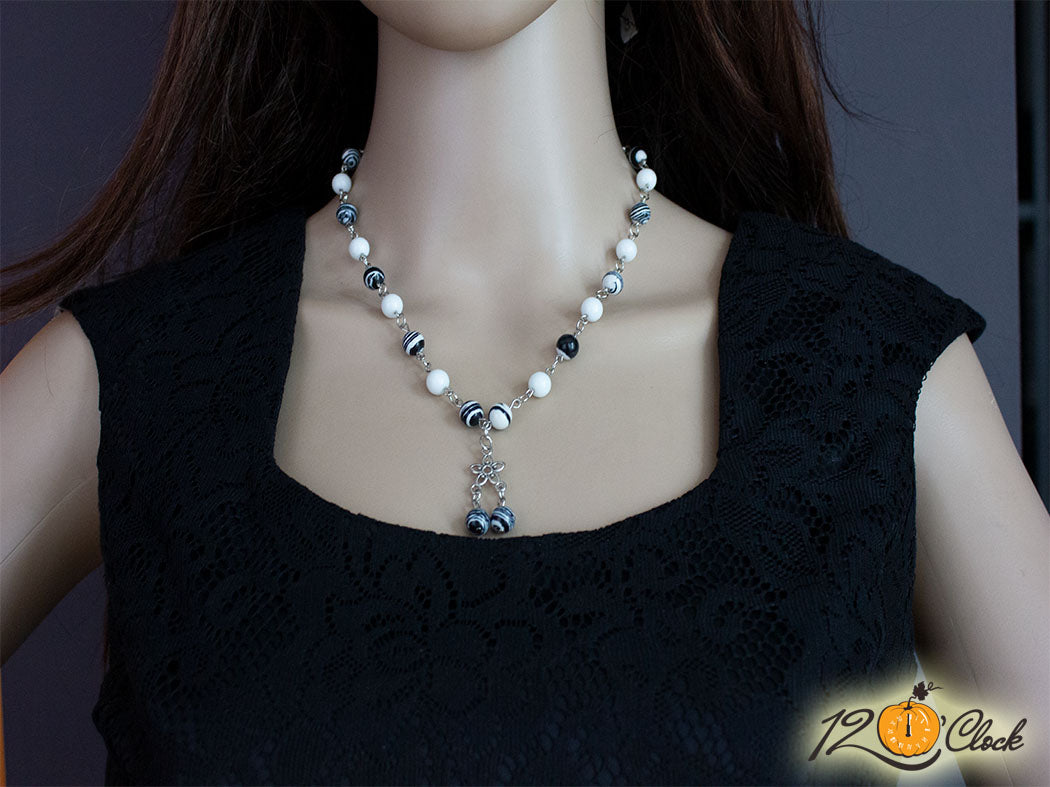 Колие от бяло-черен тюркоаз 8 мм, бял ахат 8 мм и висулка сребристо цвете