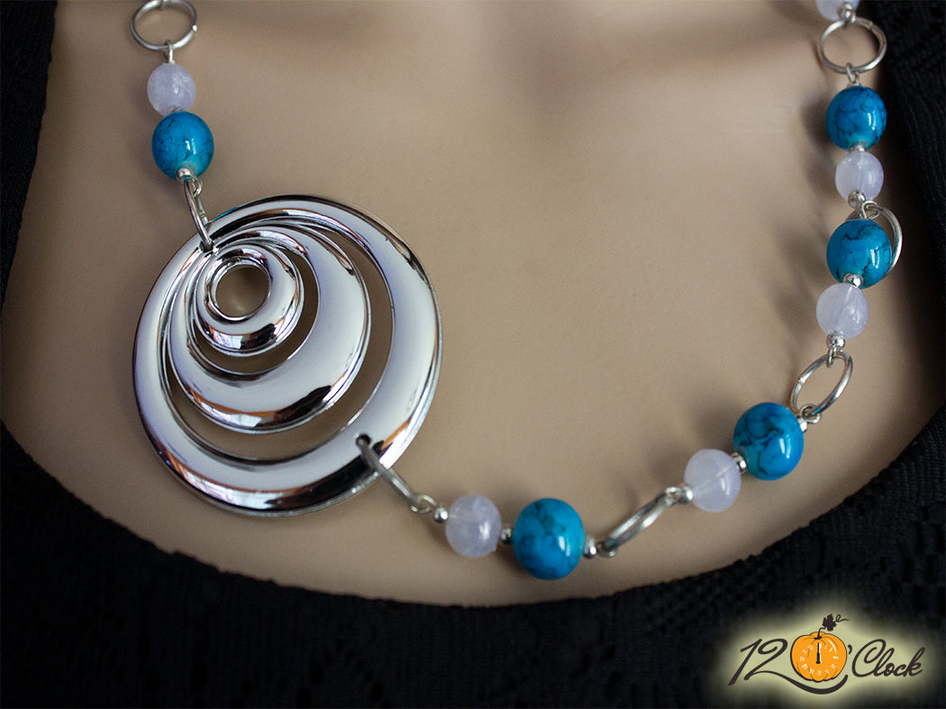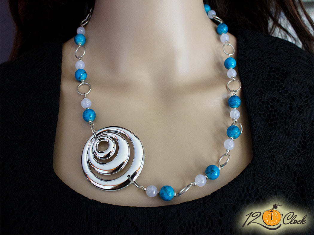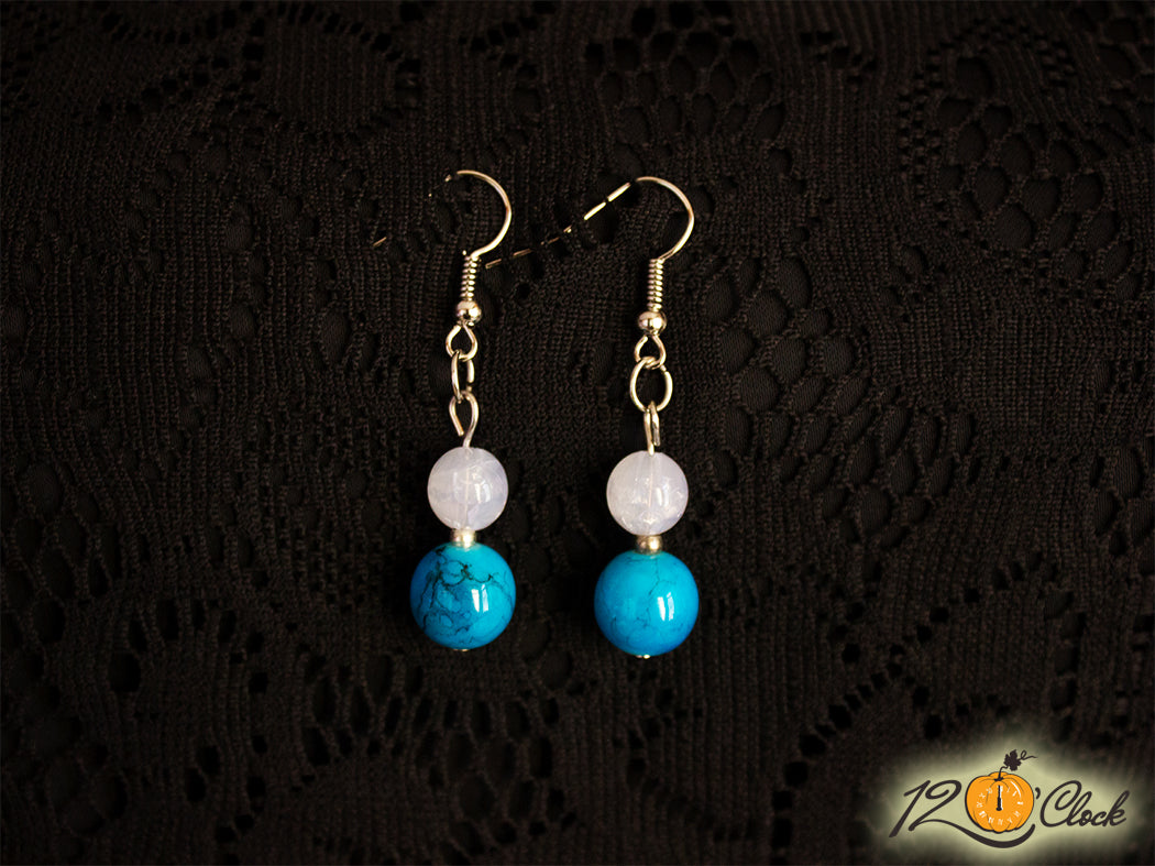Комплект от две част - колие и обици от сини стъклени мъниста 10 мм, бели кракъл мъниста 8мм и ефектни сребристи декорации.
