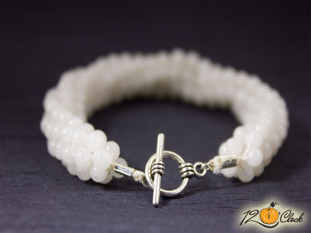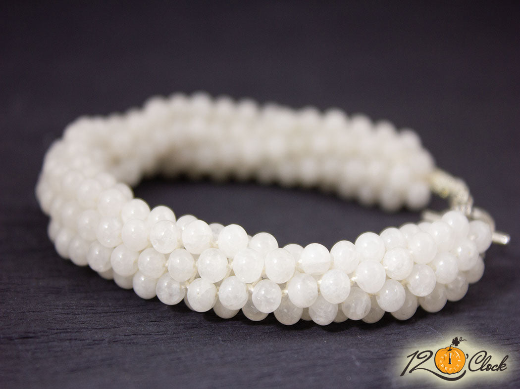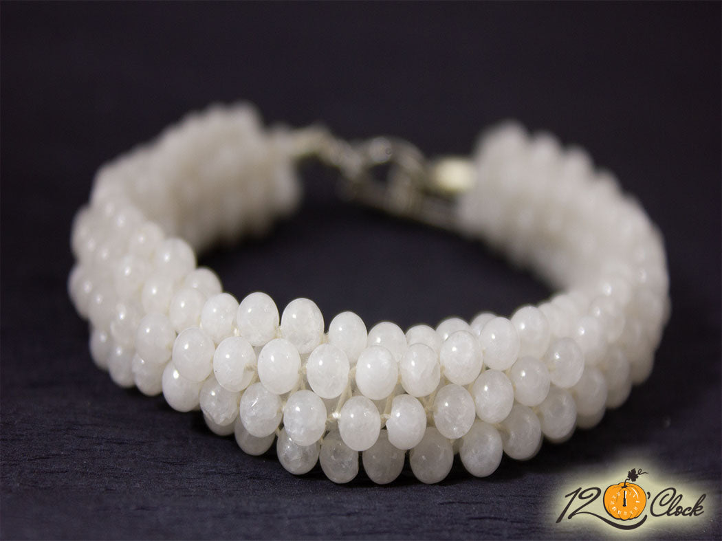 Ръчно изработена гривна от малко мъниста бял кварц в приятна плетка, завършени със сребриста закопчалка