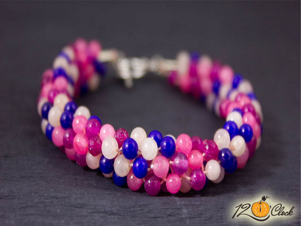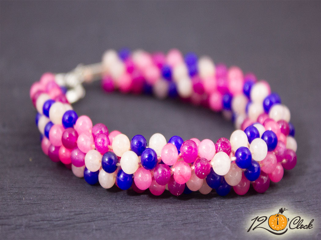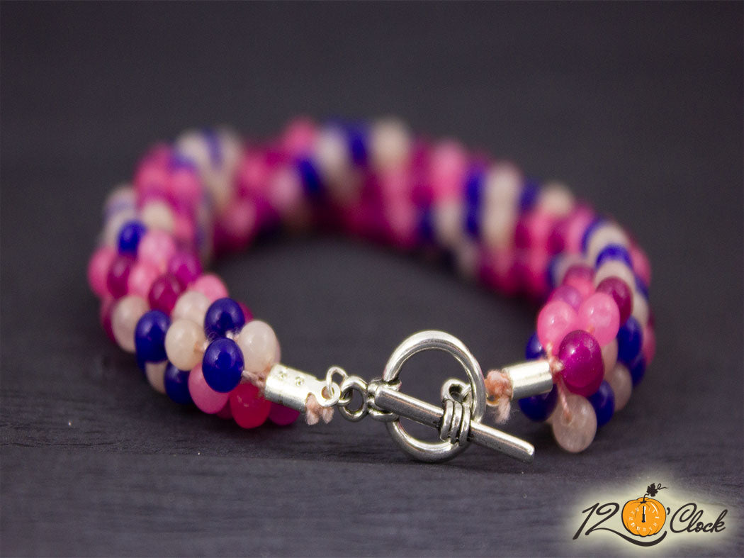 Ръчно изработена гривна от малки мъниста бял, розов, тъмно розов и лилав кварц, преплетени в цветна игра и завършени със сребриста закопчалка