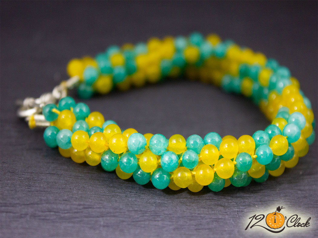 Ръчно изработена гривна от малки мъниста жълт ахат и аквамарин, преплетени в закачлива гривна и завършени от сребриста закопчалка