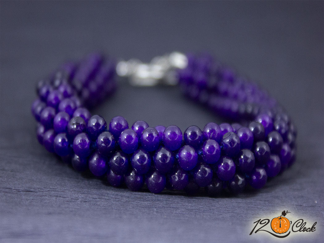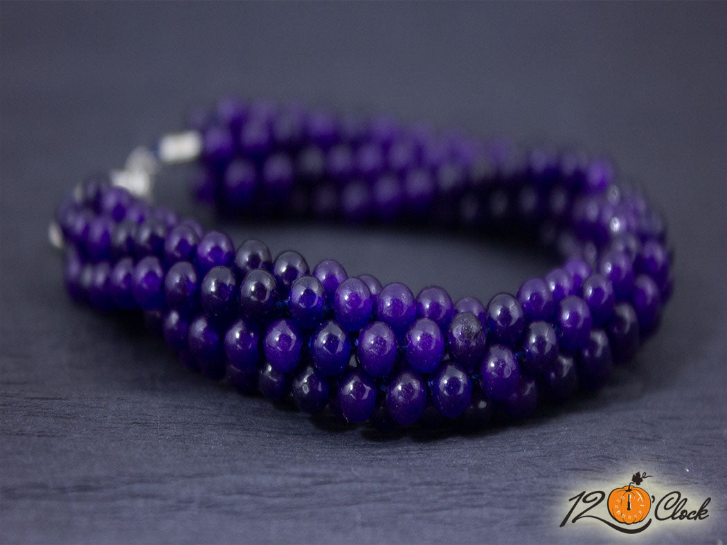 Ръчно изработена гривна от малки мъниста тъмно лилав ахат, преплетени в закачлива плетка и завършени със сребриста закопчалка