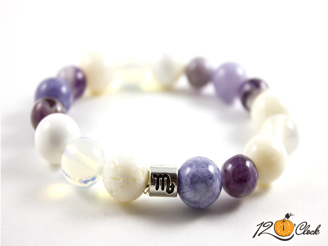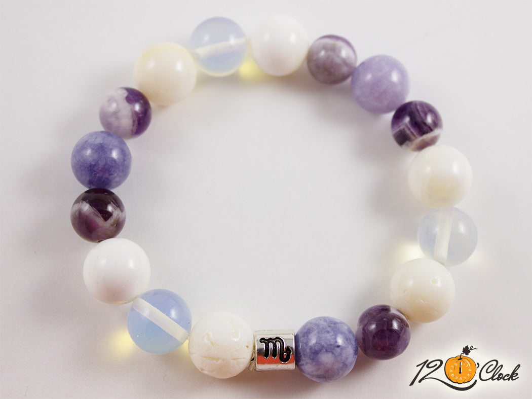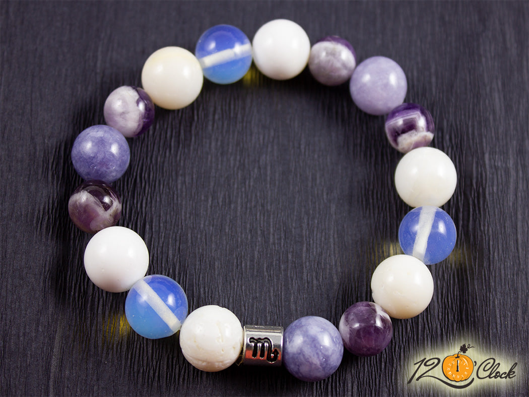 Ръчно изработена гривна от еластична корда и зодия, в комбинация от седеф 12 мм, аметист 10 мм и аквамарин 12 мм.