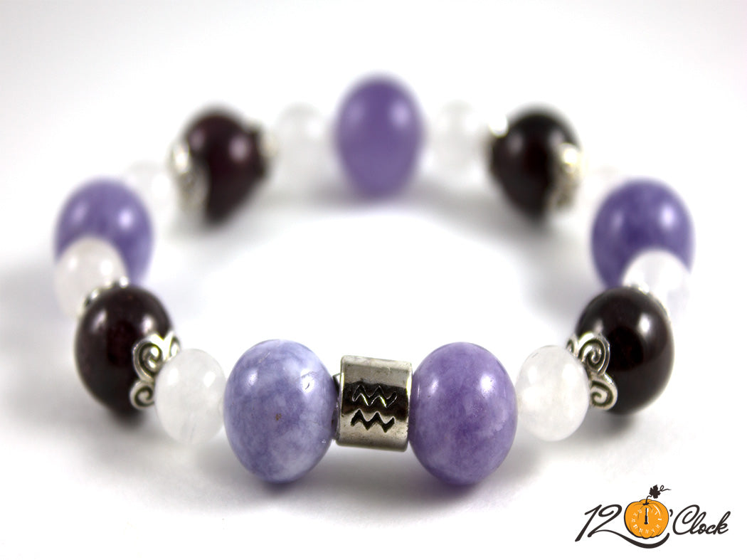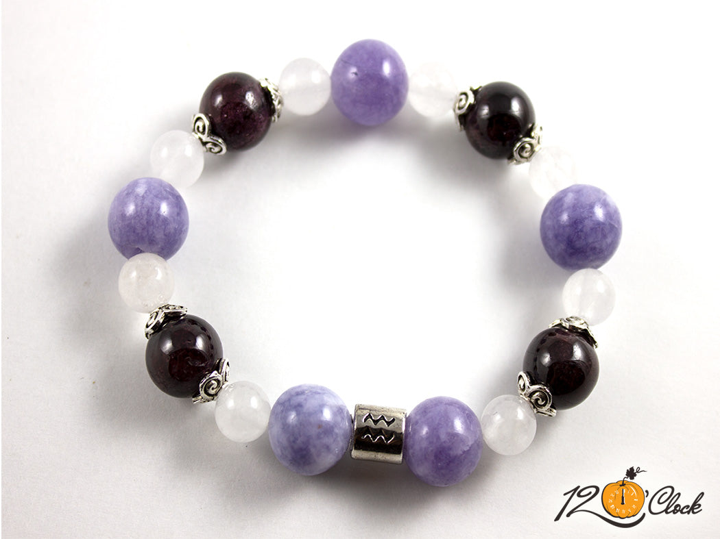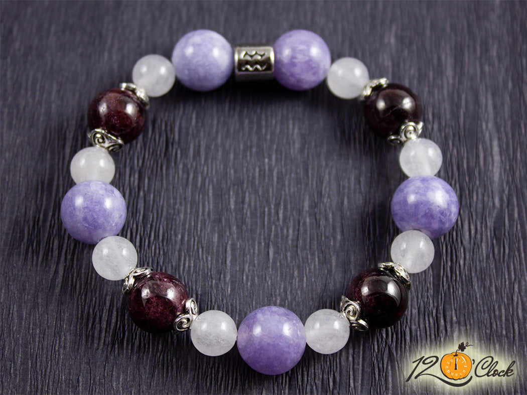 Ръчно изработена гривна от еластична корда, шапки и зодия, в комбинация от аквамарин 12 мм, гранат 10 мм и халцедон 8 мм.