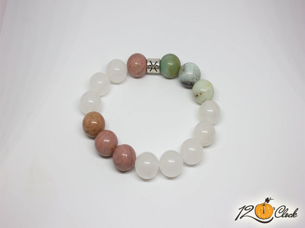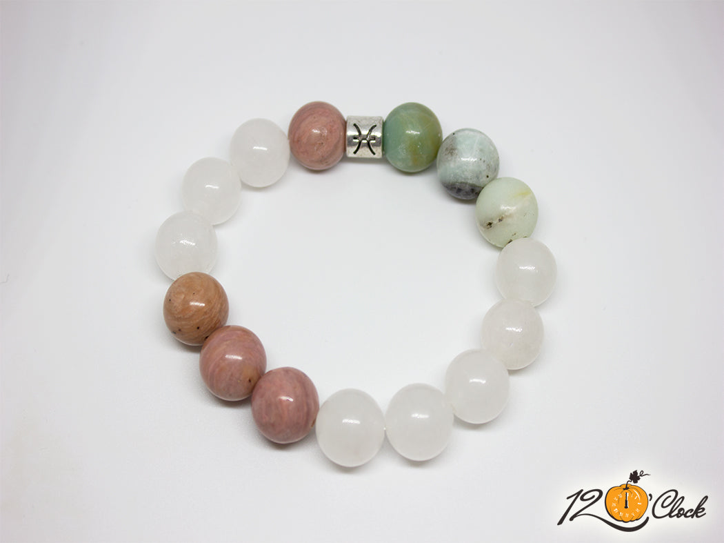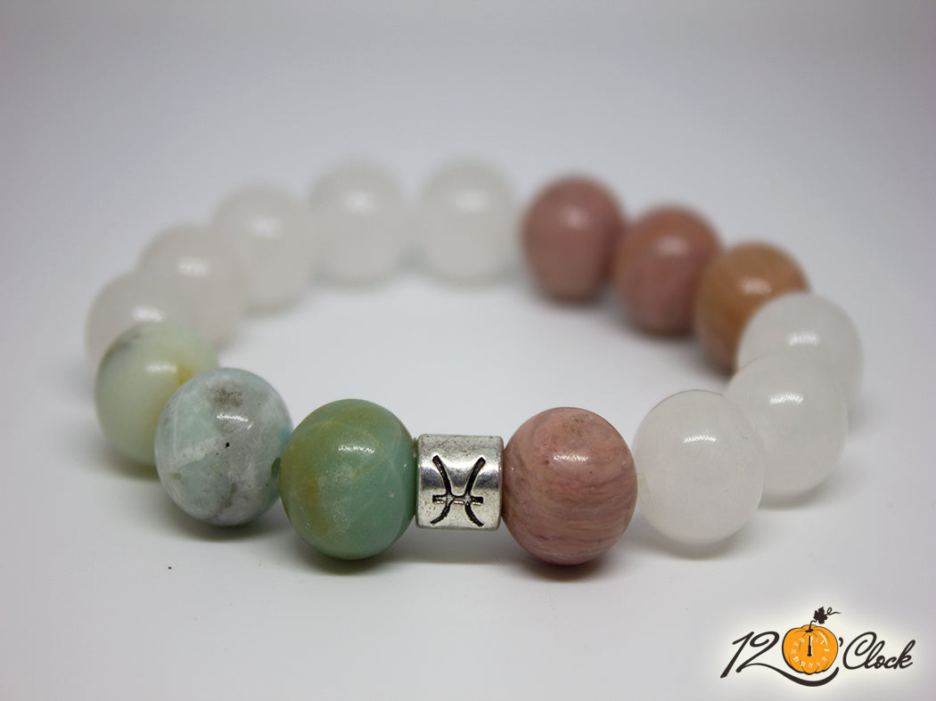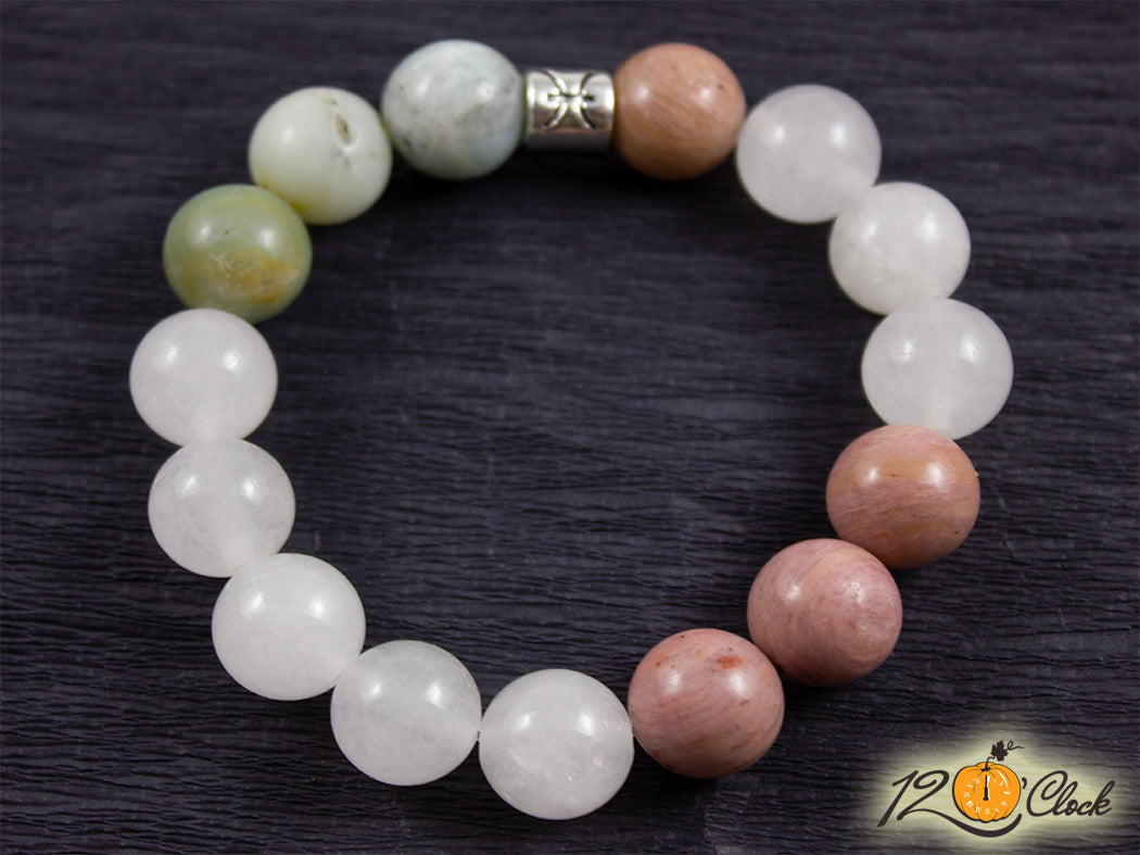 Ръчно изработена гривна от еластична корда и зодия, в комбинация от родонит 12 мм, амазонит 12 мм и халцедон 12 мм..
