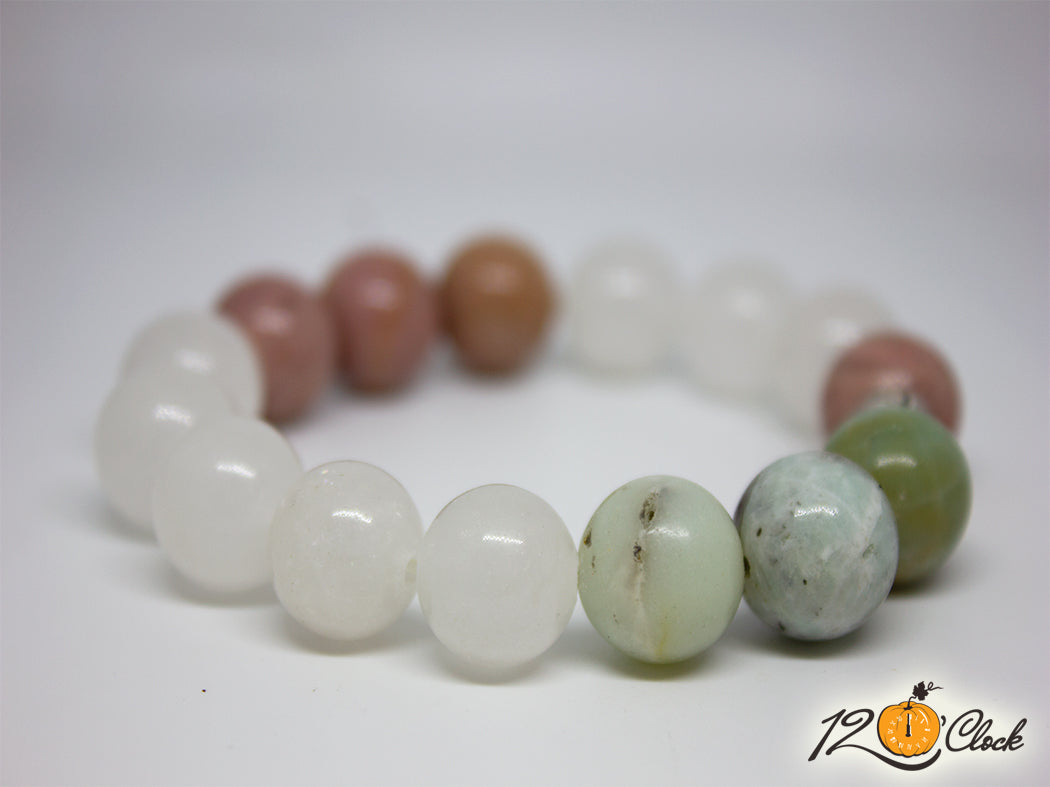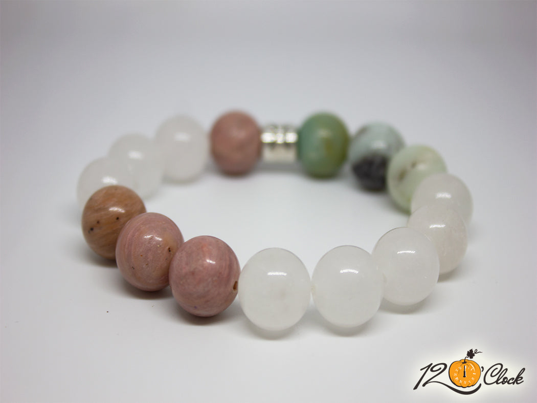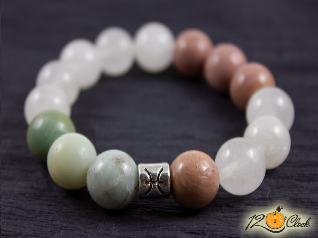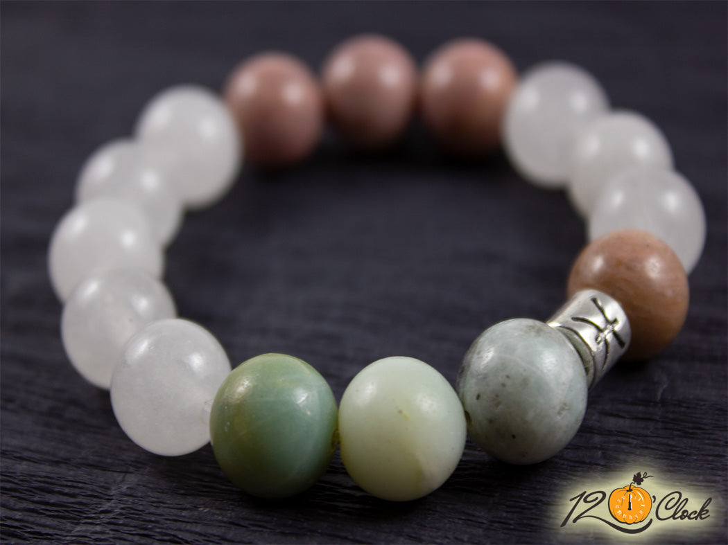 Ръчно изработена гривна от еластична корда и зодия, в комбинация от родонит 12 мм, амазонит 12 мм и халцедон 12 мм..