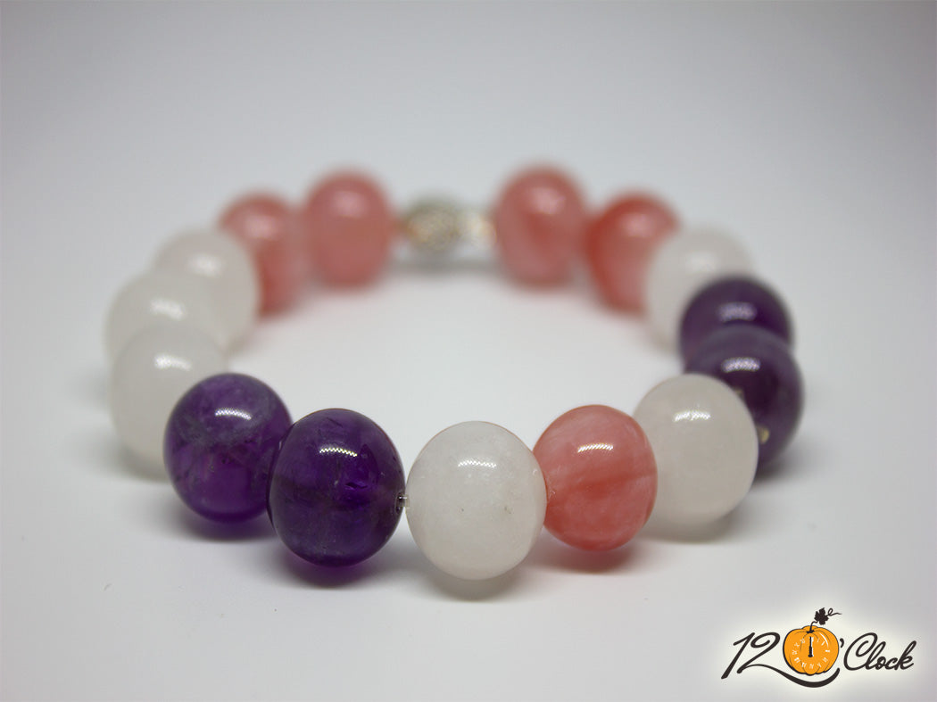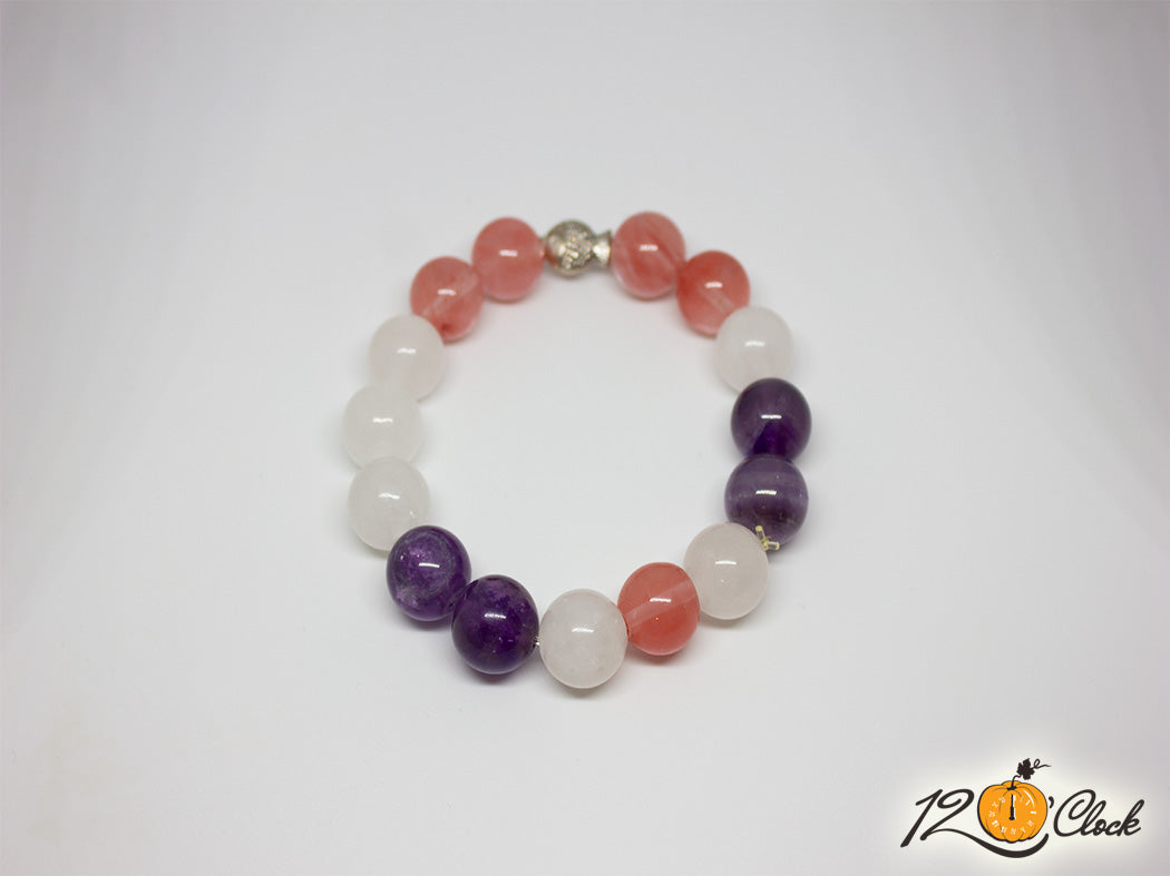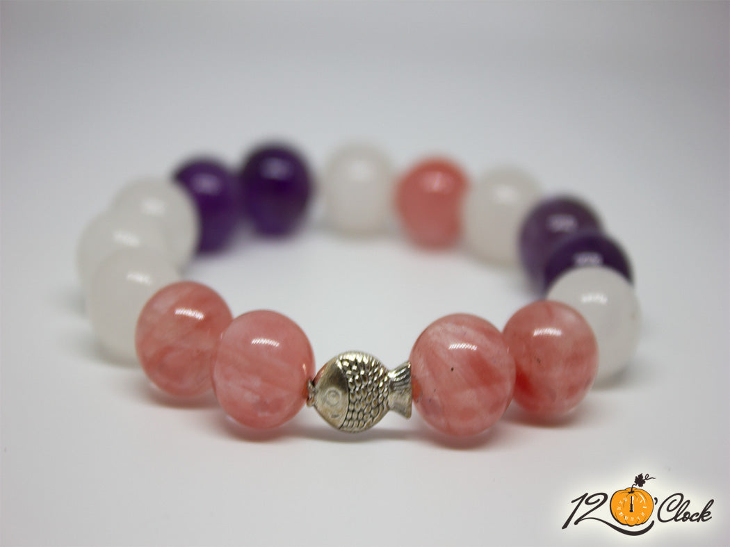 Ръчно изработена гривна от еластична корда и зодия, в комбинация от халцедон 12 мм, аметист 12 мм и черешов кварц 12 мм.