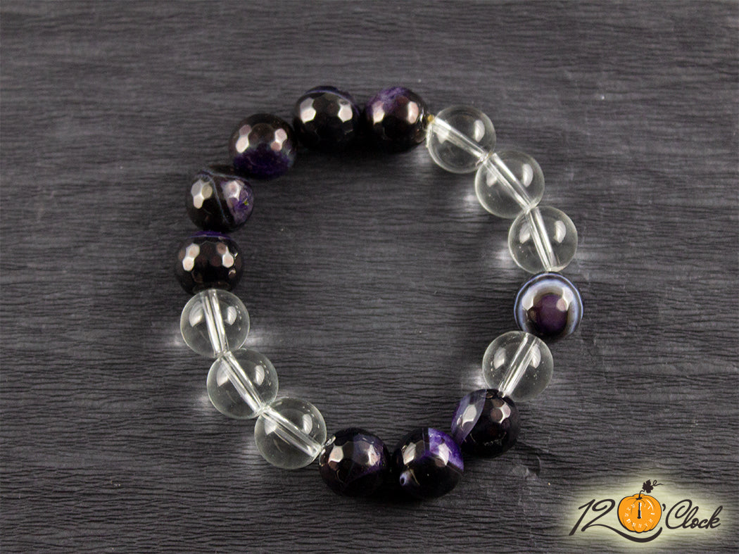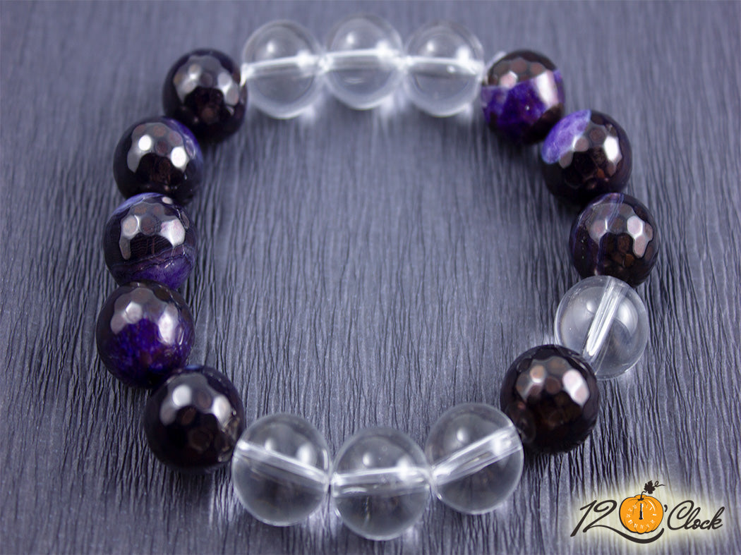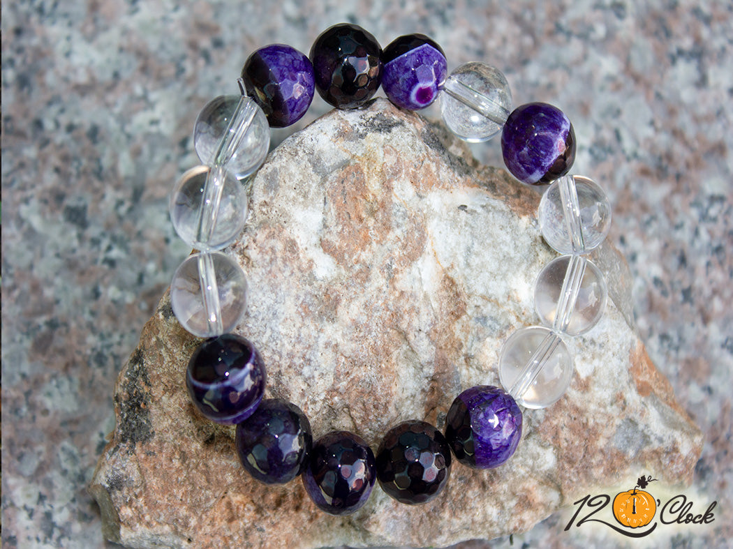 Ръчно изработена гривна от еластична корда, в комбинация от тъмно лилав фасетиран драконов ахат 12 мм и планински кристал 12 мм.