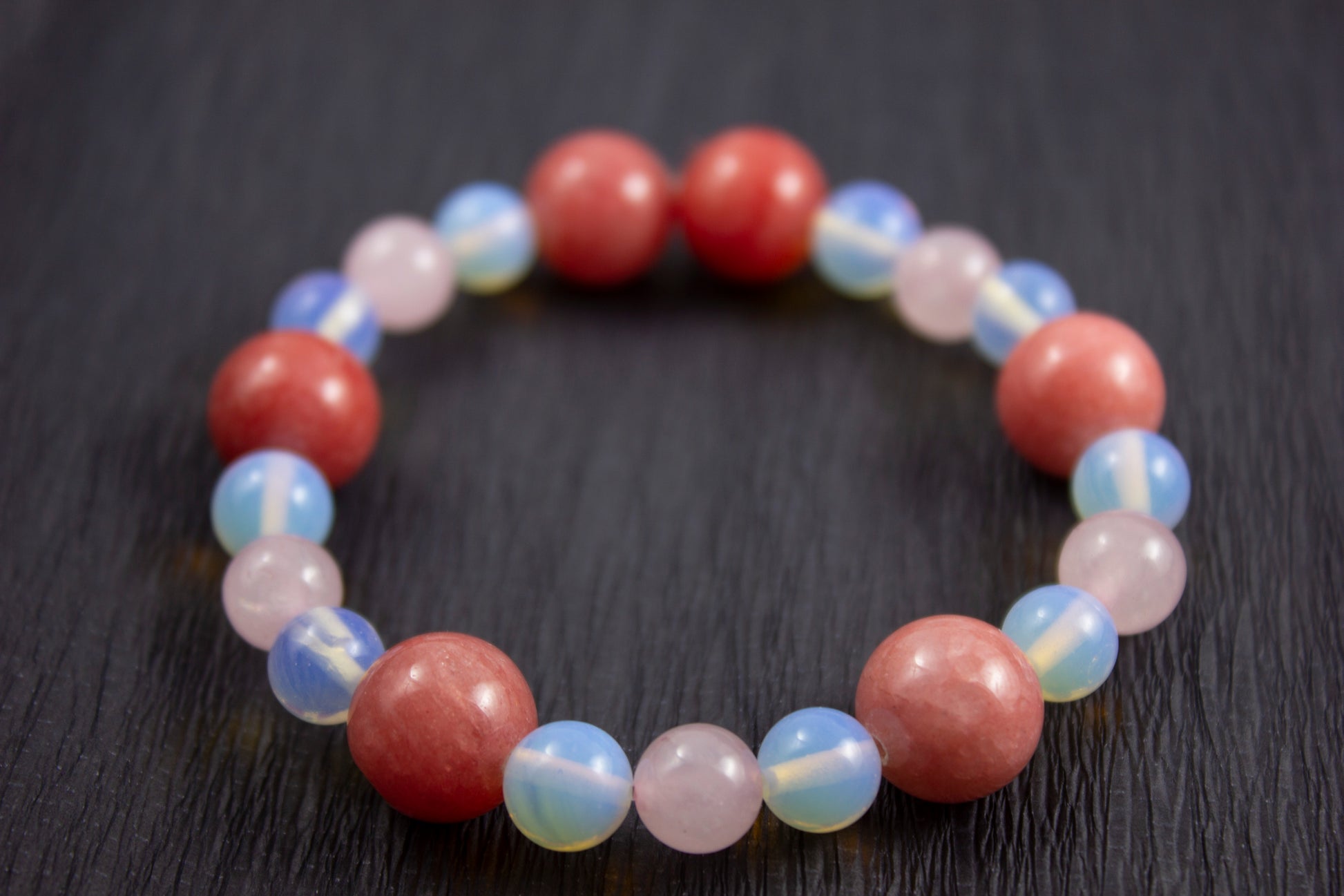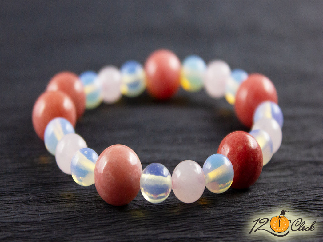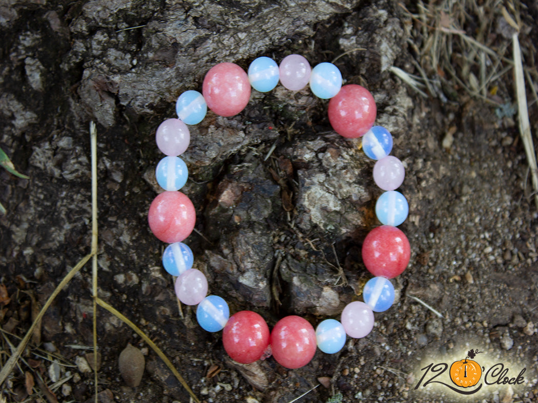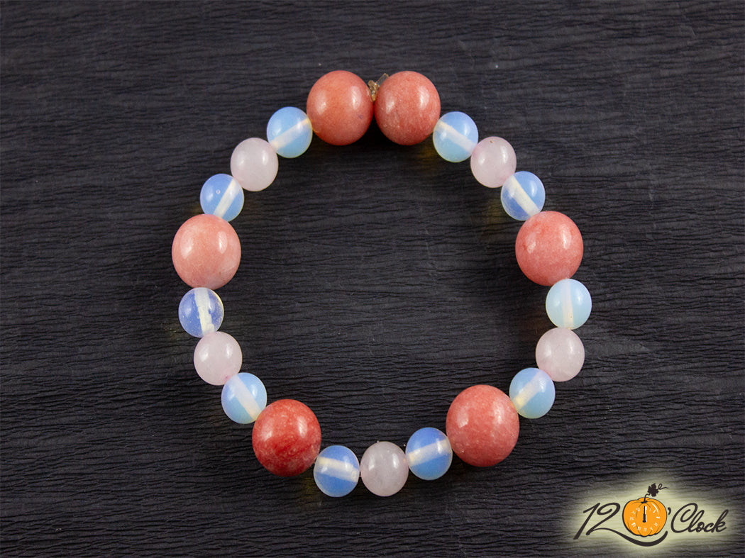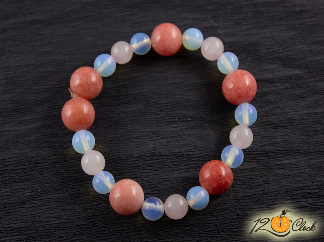 Ръчно изработена гривна от еластична корда, в комбинация от розов кварц 10 мм, ягодов кварц 10 мм и лунен камък 8 мм.