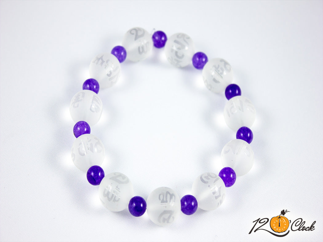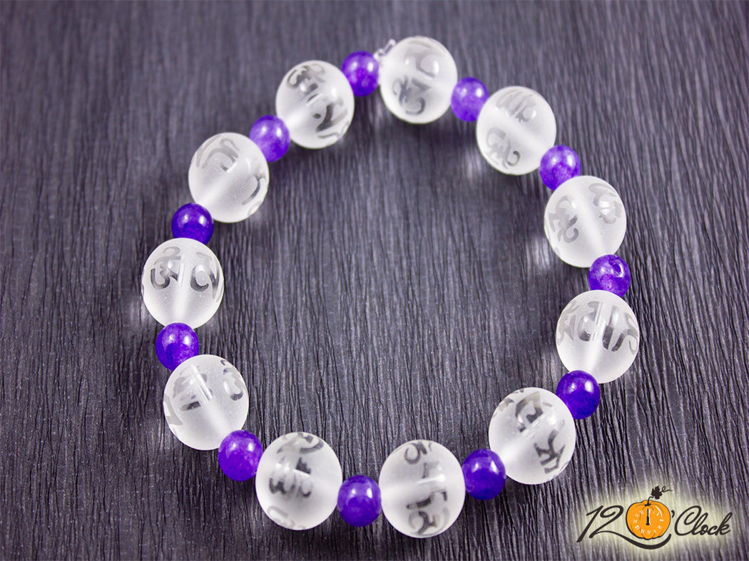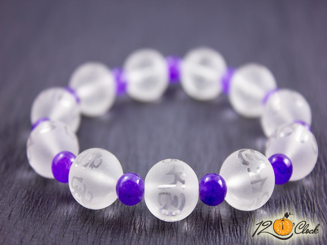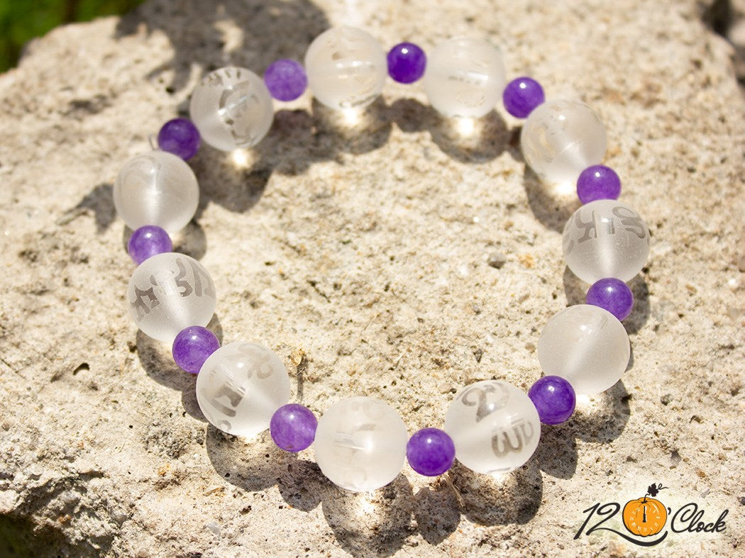 Ръчно изработена гривна от еластична корда, в комбинация от планински кристал мат с китайски йероглифи 12 мм и лилав ахат 6 мм.