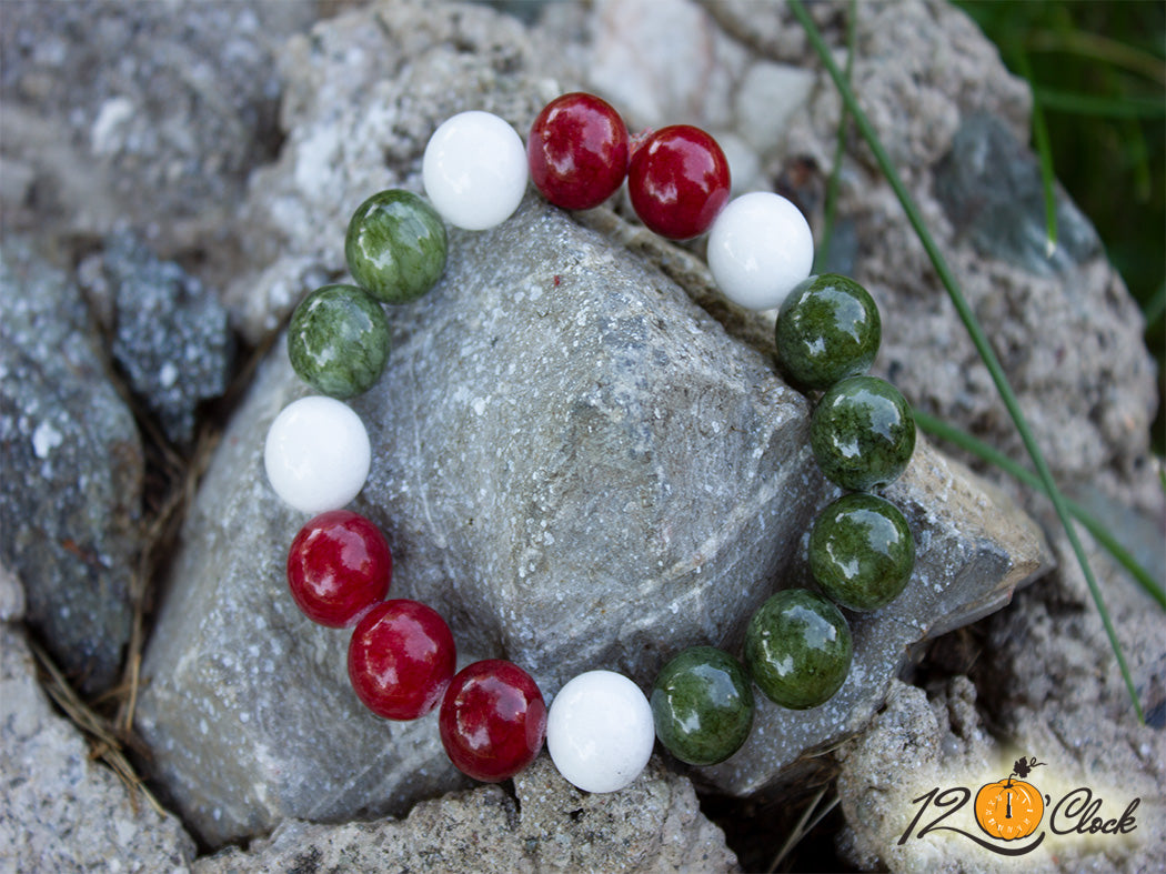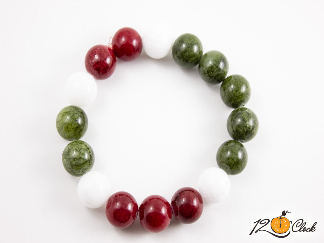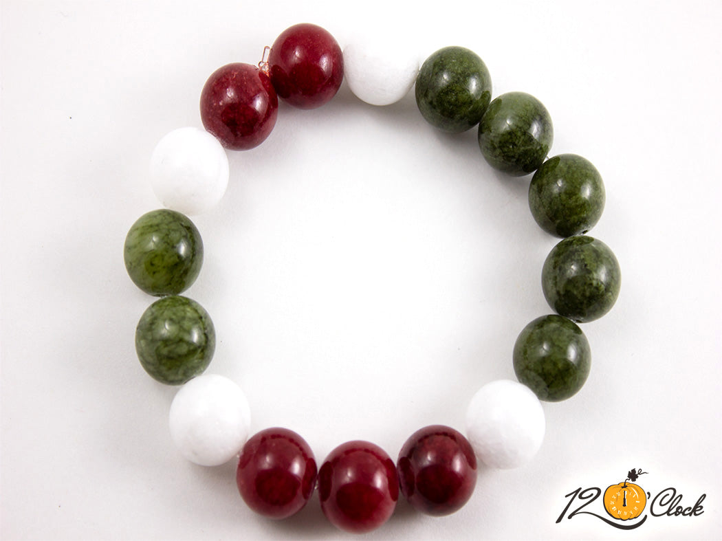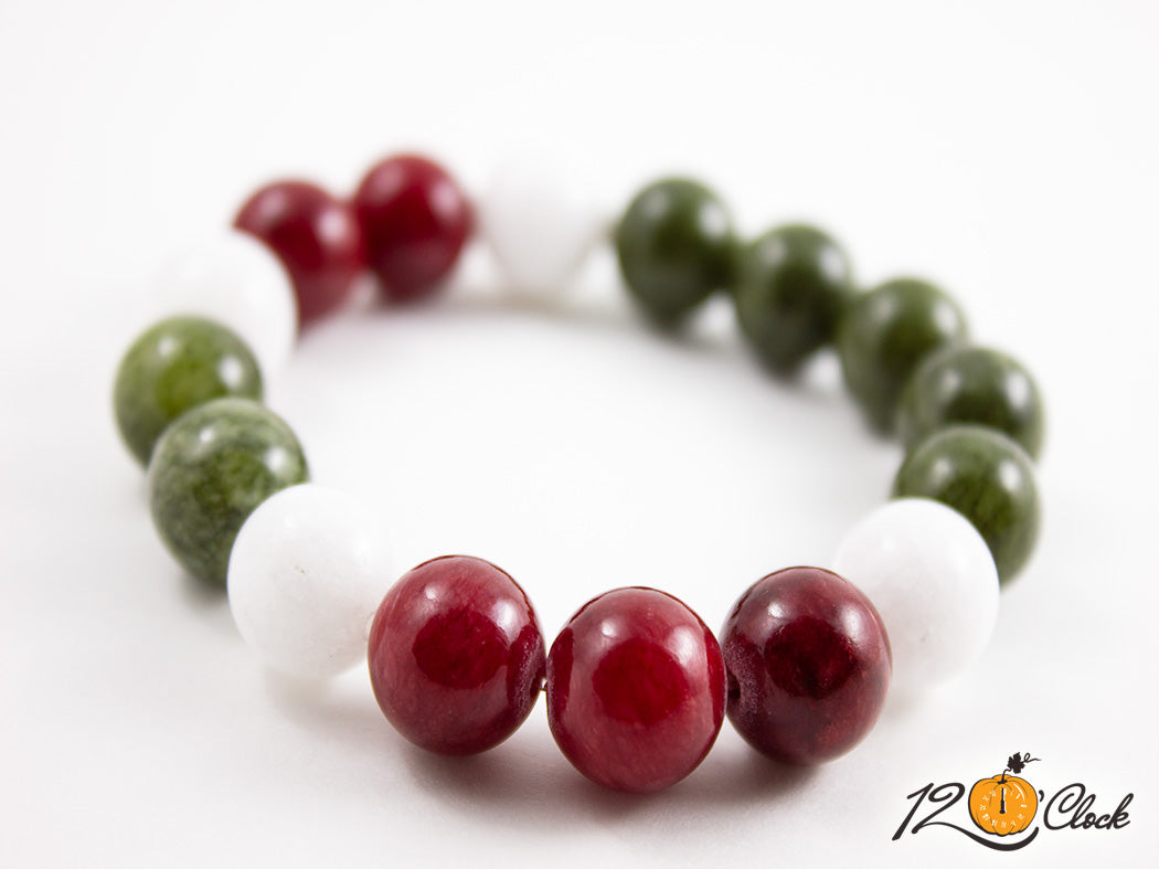 Ръчно изработена гривна от еластична корда, в комбинация от бял кварц 12мм, тъмно червен жадеит 12 мм и тъмно зелен жадеит 12 мм.