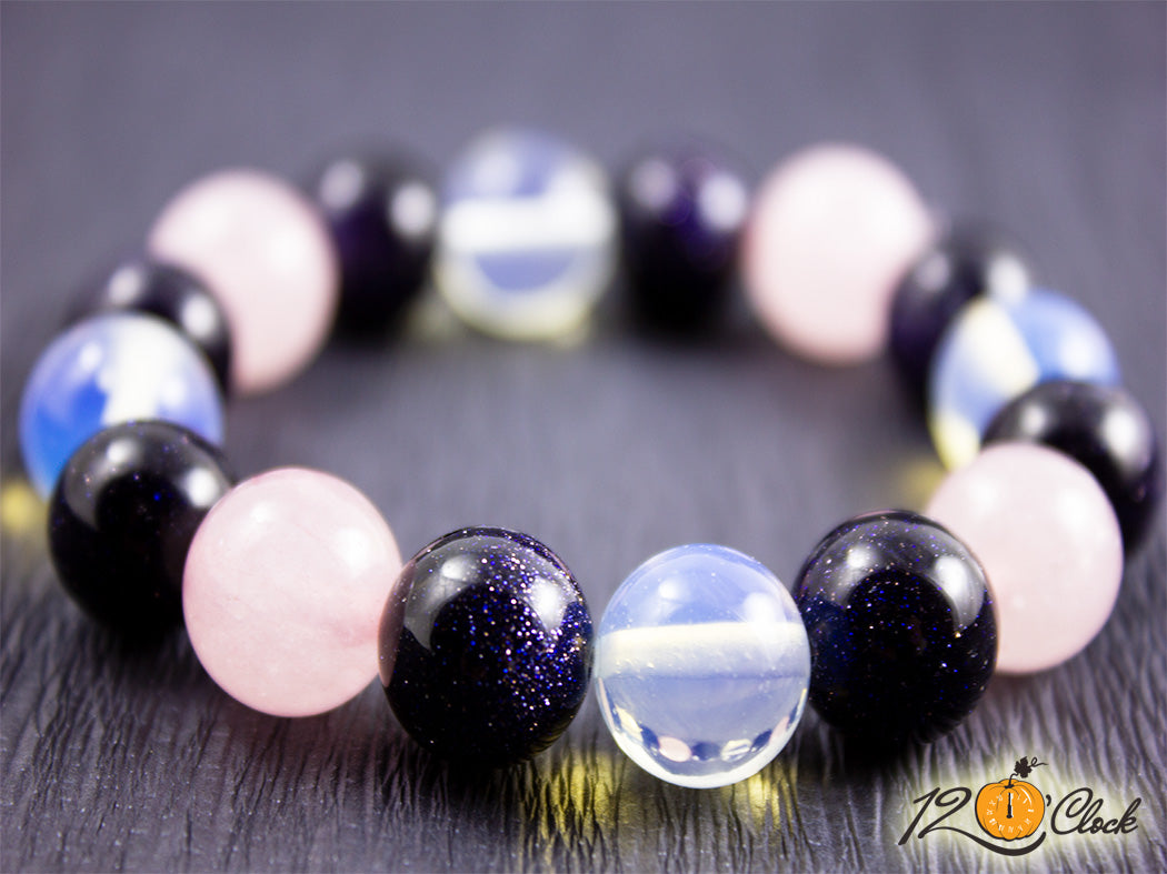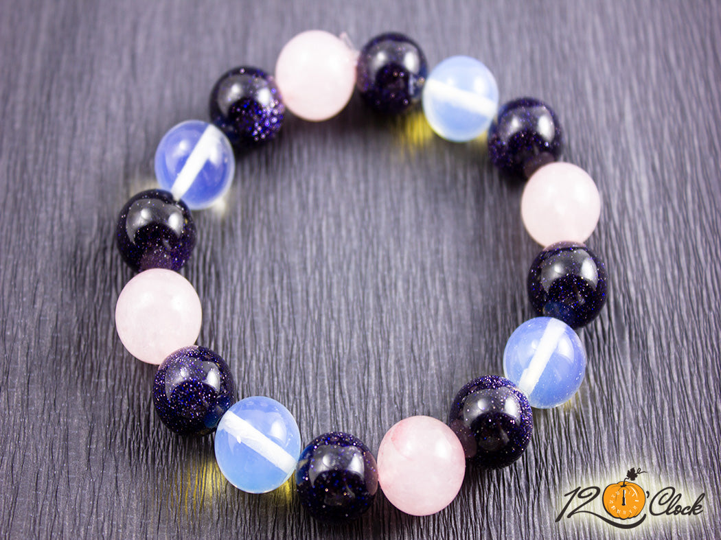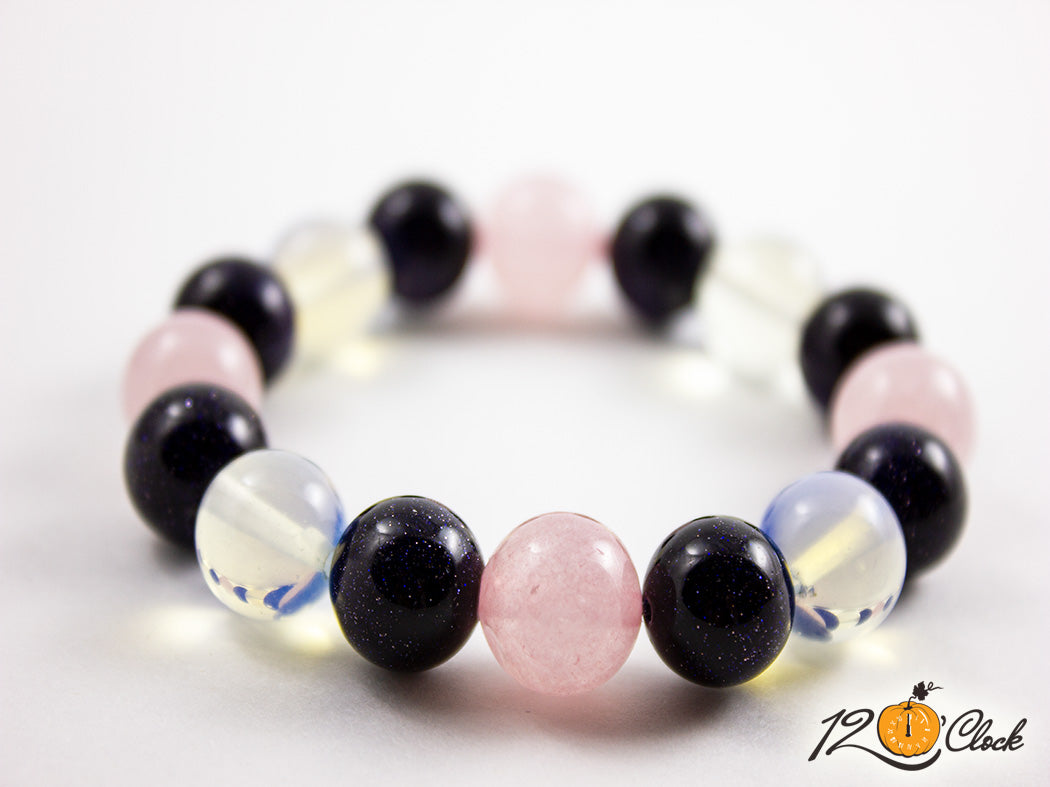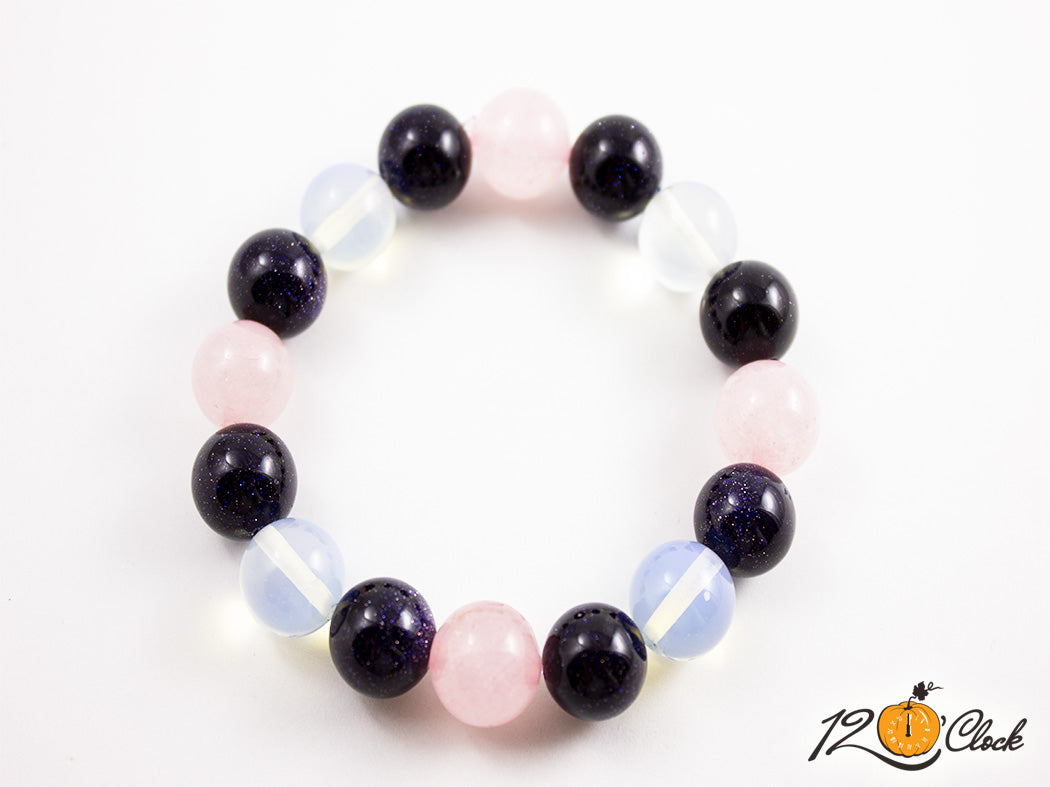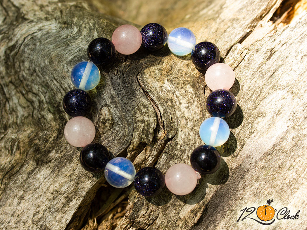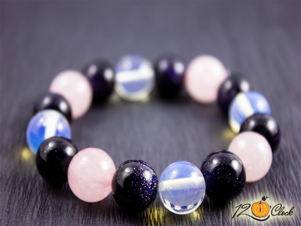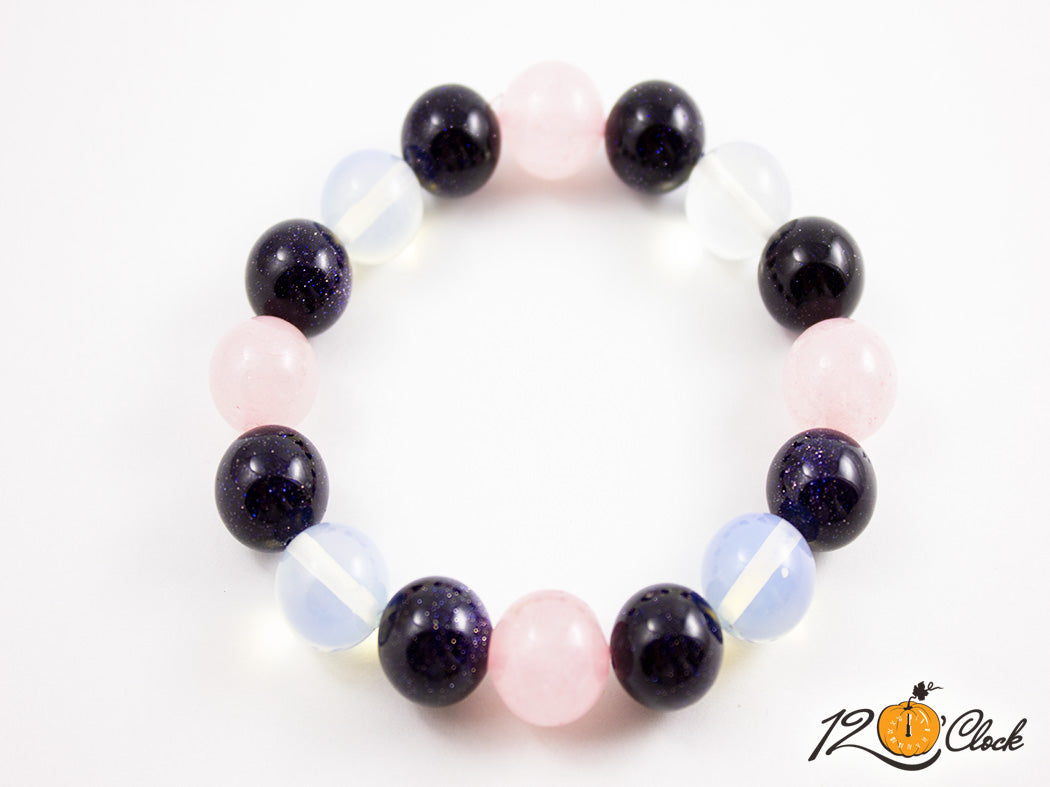Ръчно изработена гривна от еластична корда, в комбинация от слънчев камък 12 мм, розов кварц 12 мм и лунен камък 12 мм.