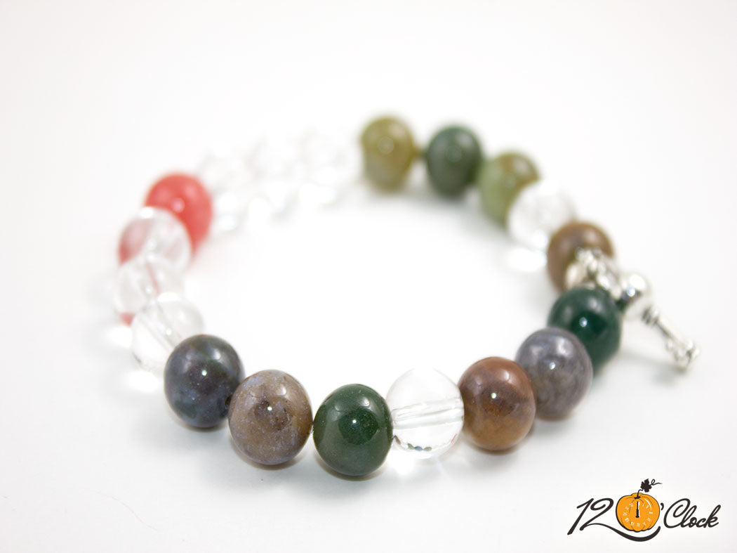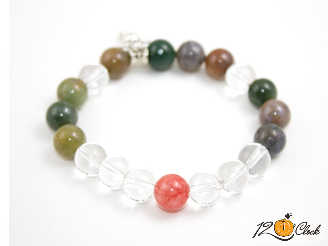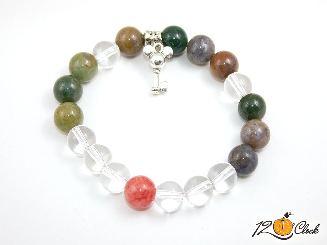 Ръчно изработена гривна с основа еластична корда и камъни в комбинация от планински кристал 10 мм, зелен ахат 10 мм и ягодов кварц 10 мм. Към камъните има добавена висулка мишка.