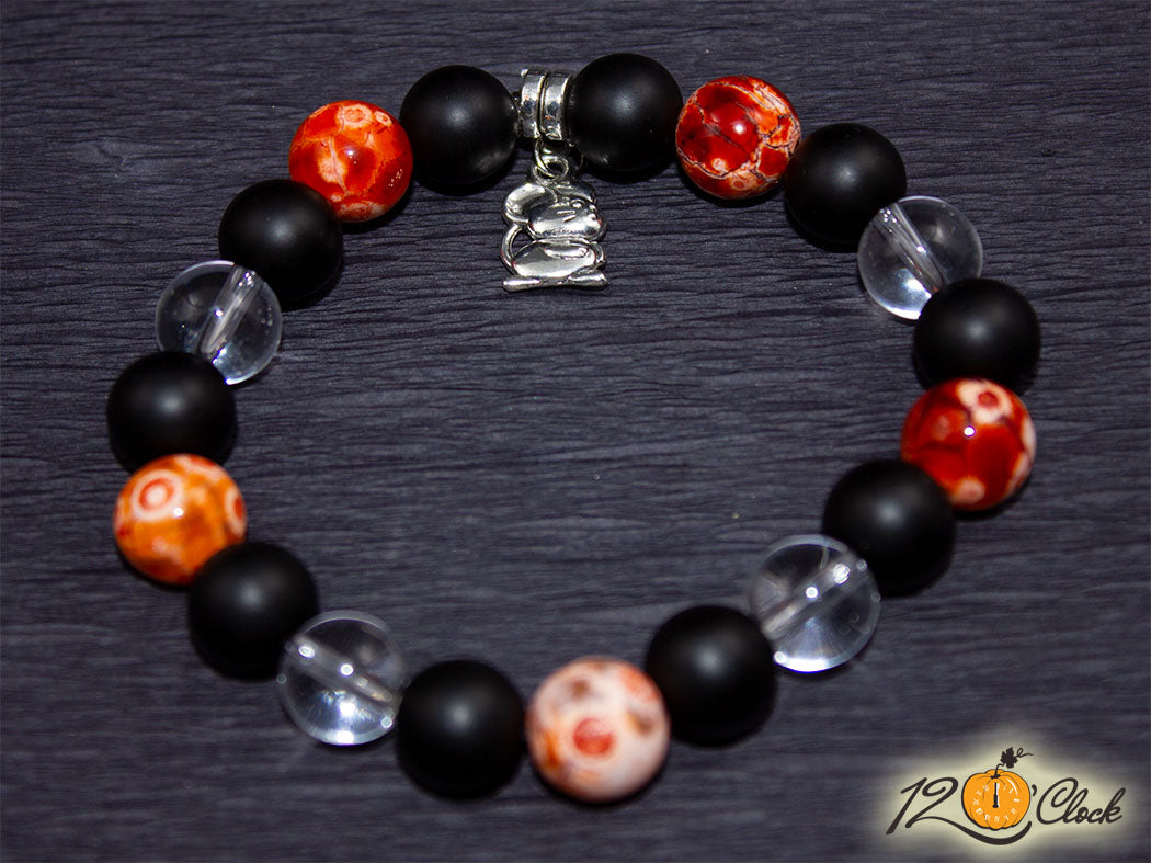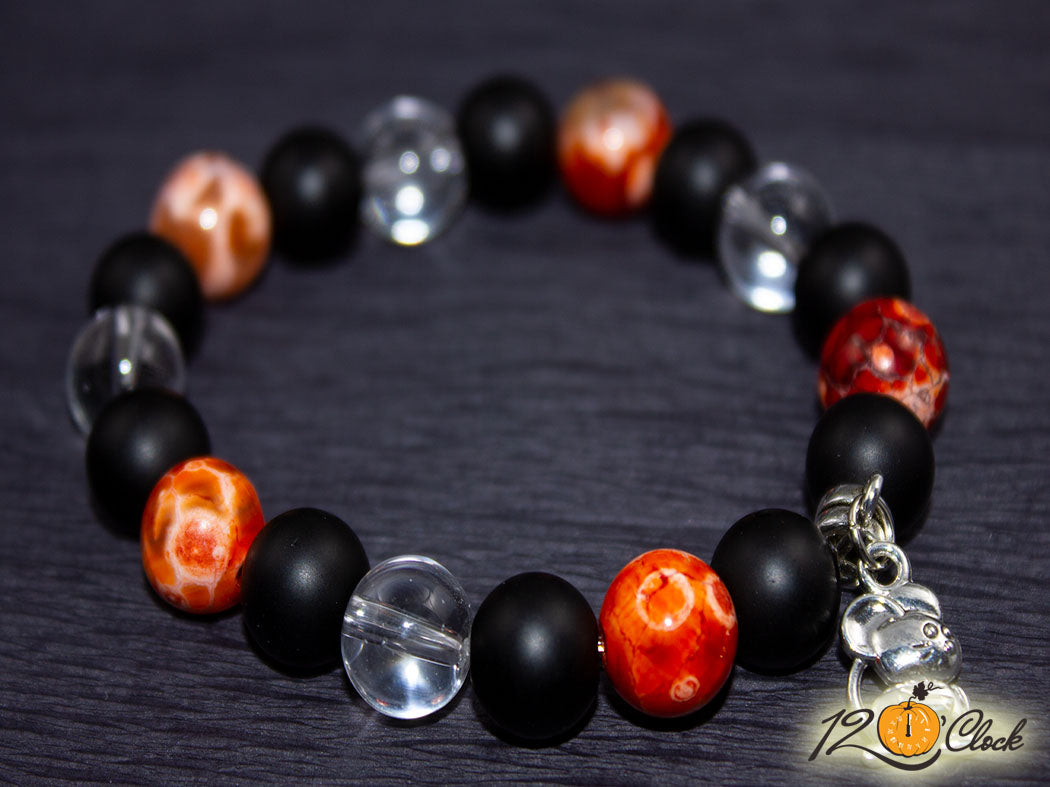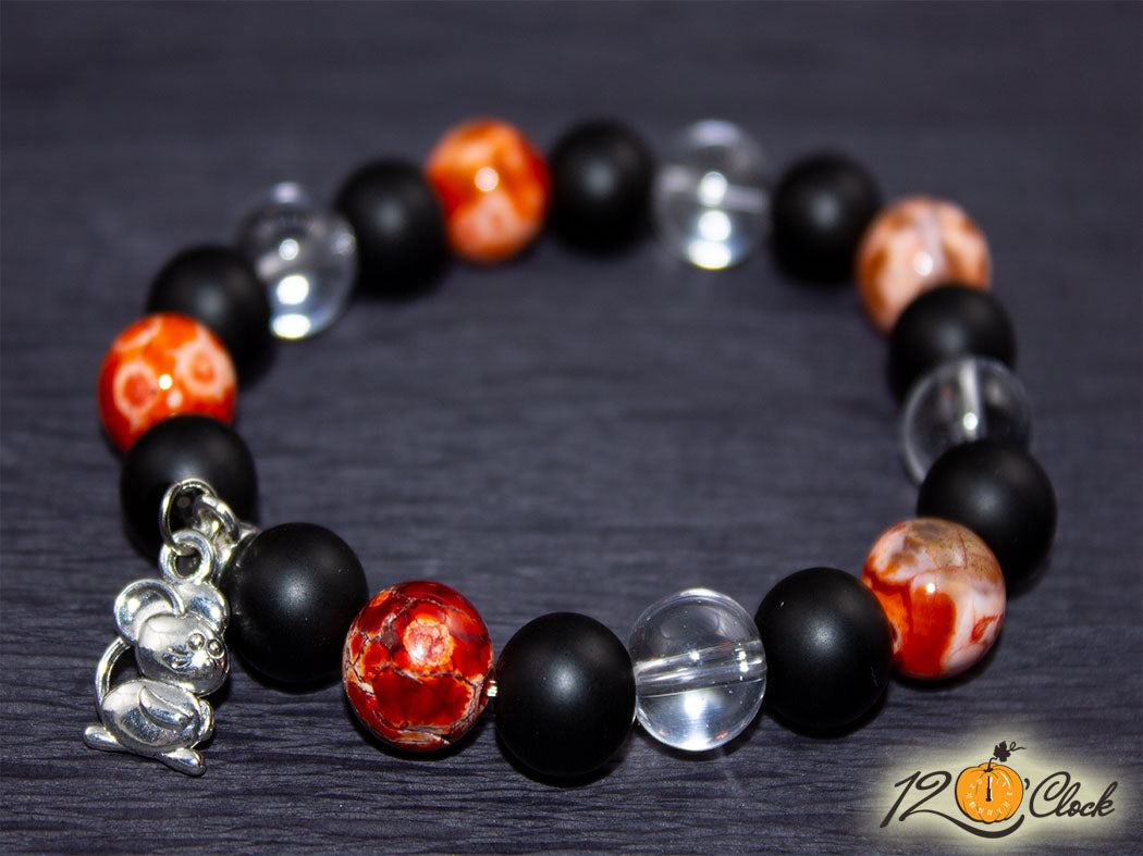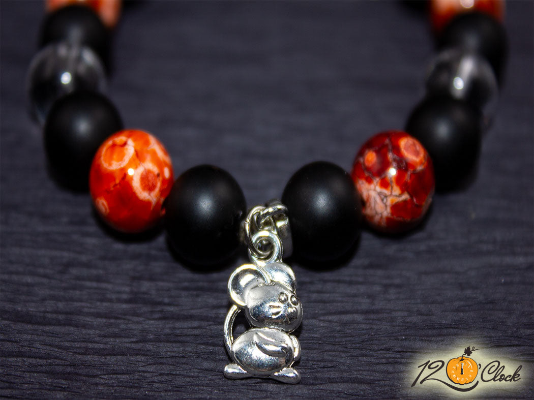 Ръчно изработена гривна с основа еластична корда и камъни в комбинация от планински кристал 10 мм, оранжев ахат 10 мм и оникс 10 мм. Към камъните има добавена висулка мишка.