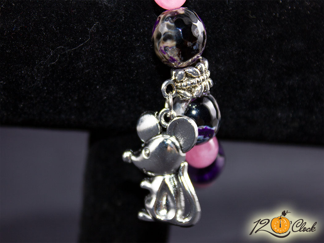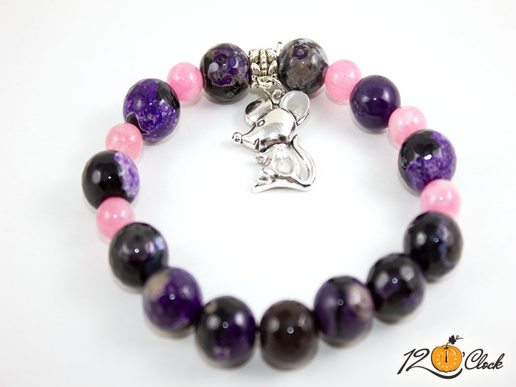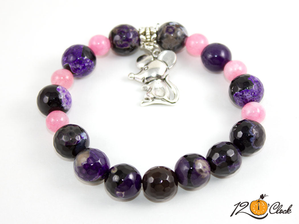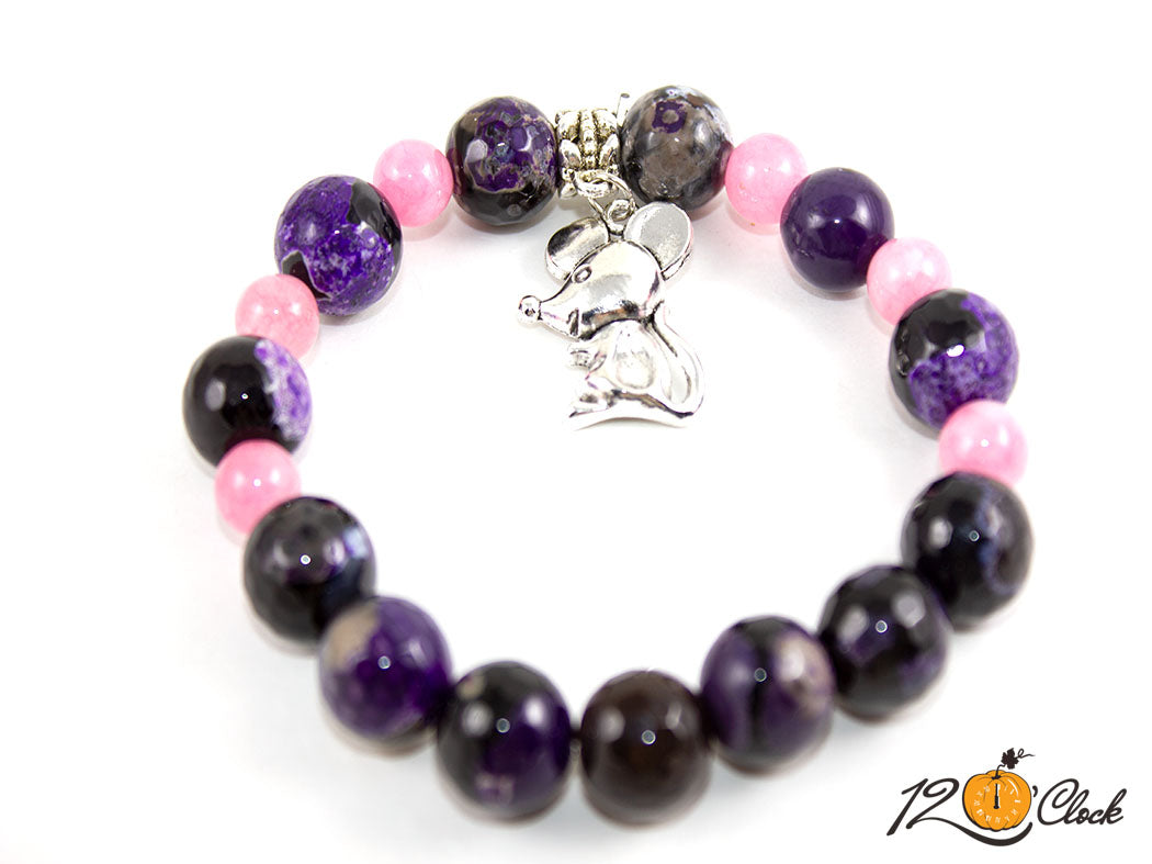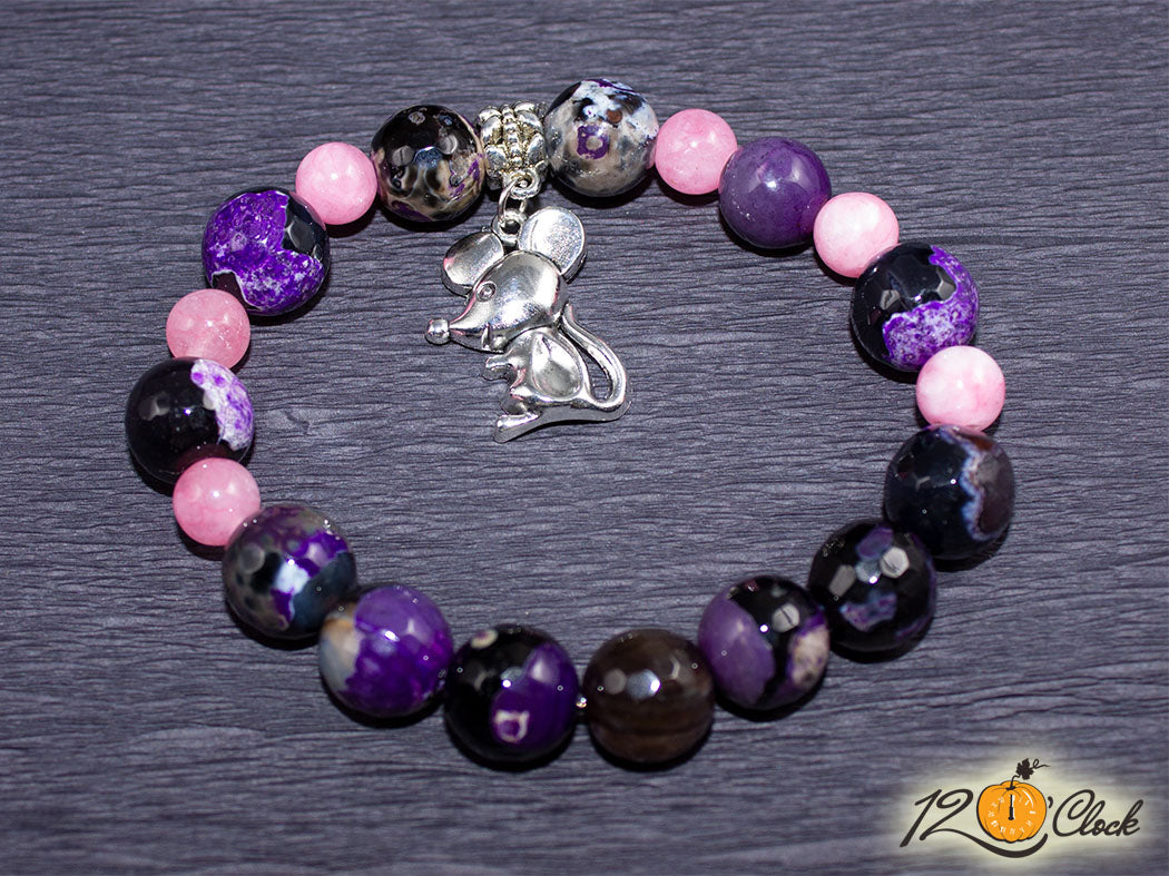 Ръчно изработена гривна с основа еластична корда и камъни в комбинация от лилав ивчест ахат 12 мм и ягодов кварц 10 мм. Към камъните има добавена висулка мишка.