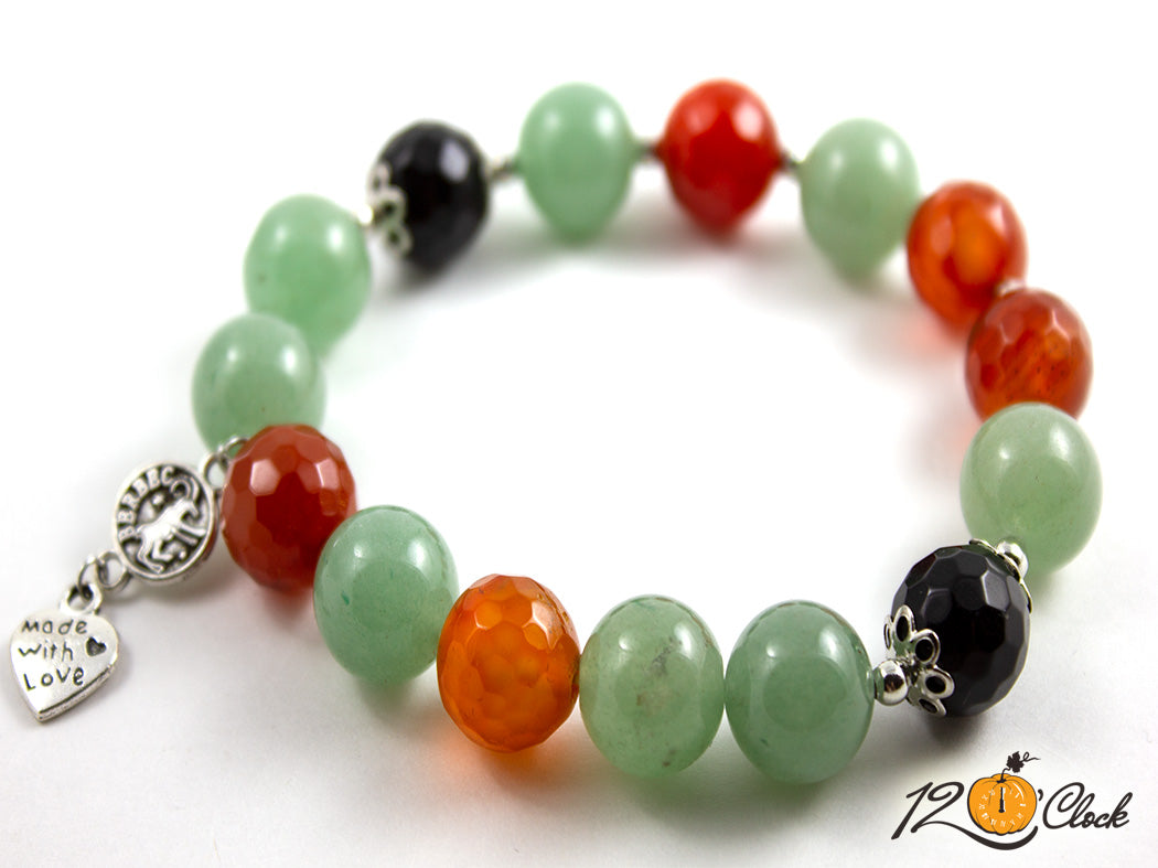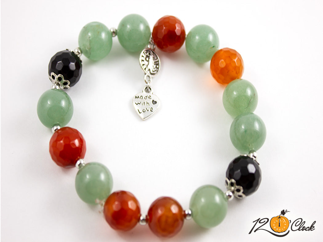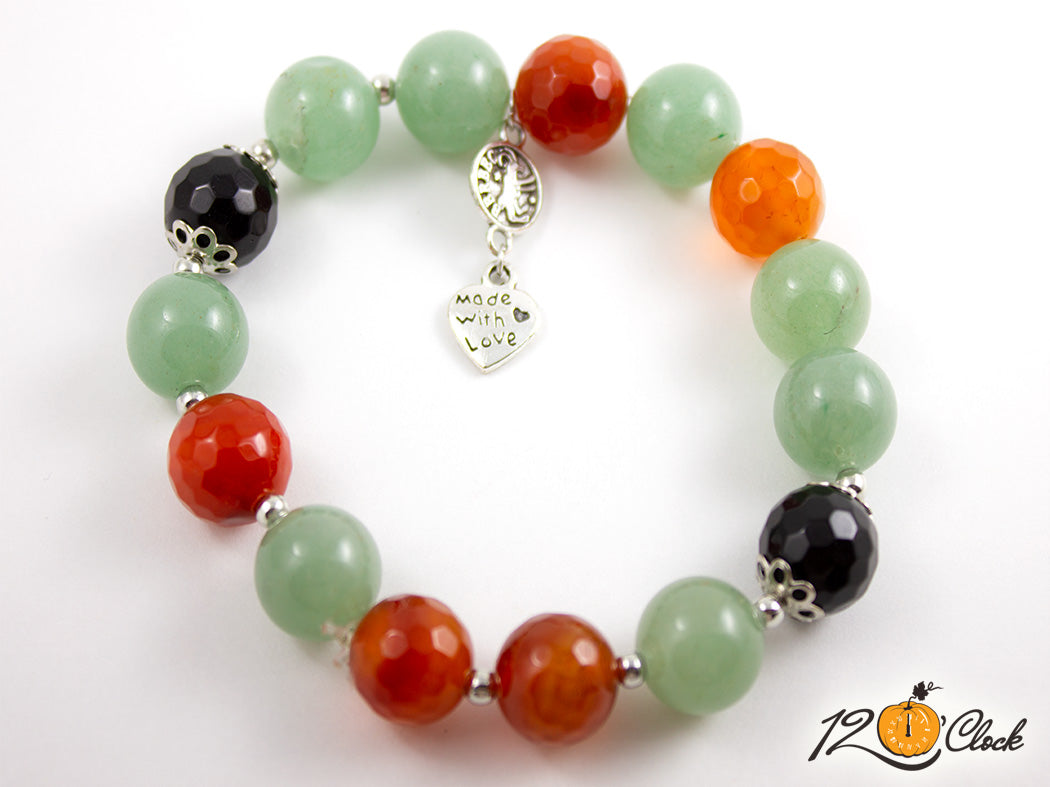 Ръчно изработена гривна от еластична корда, метални топчета,шапки, халки, зодия и сърце, в комбинация от авантюрин 12 мм, фасетиран оникс 12 мм и фасетиран оранжев ахат 12 мм.