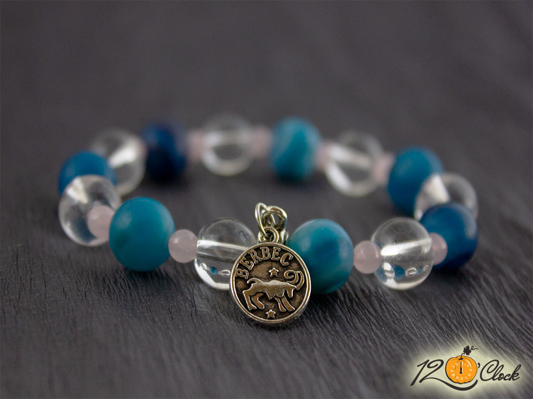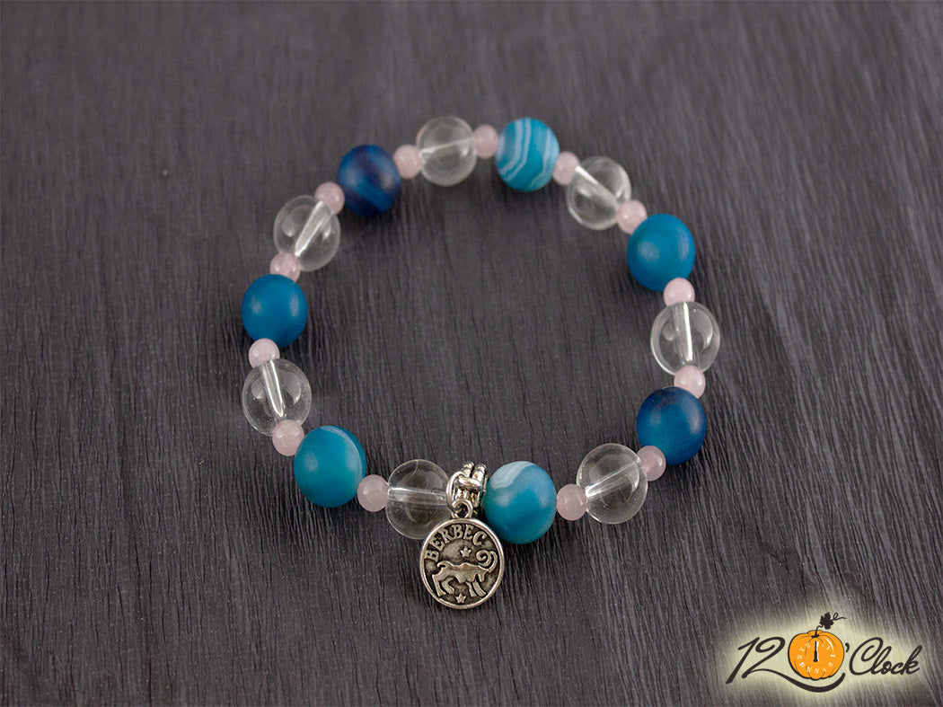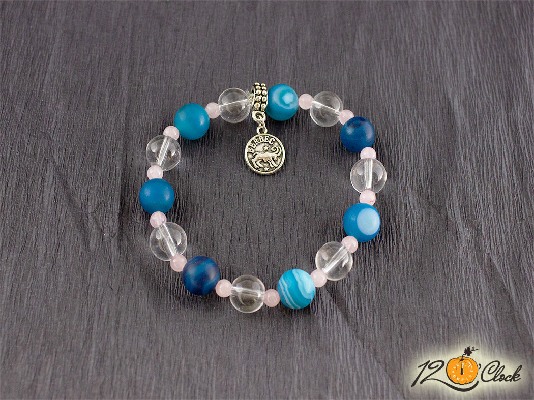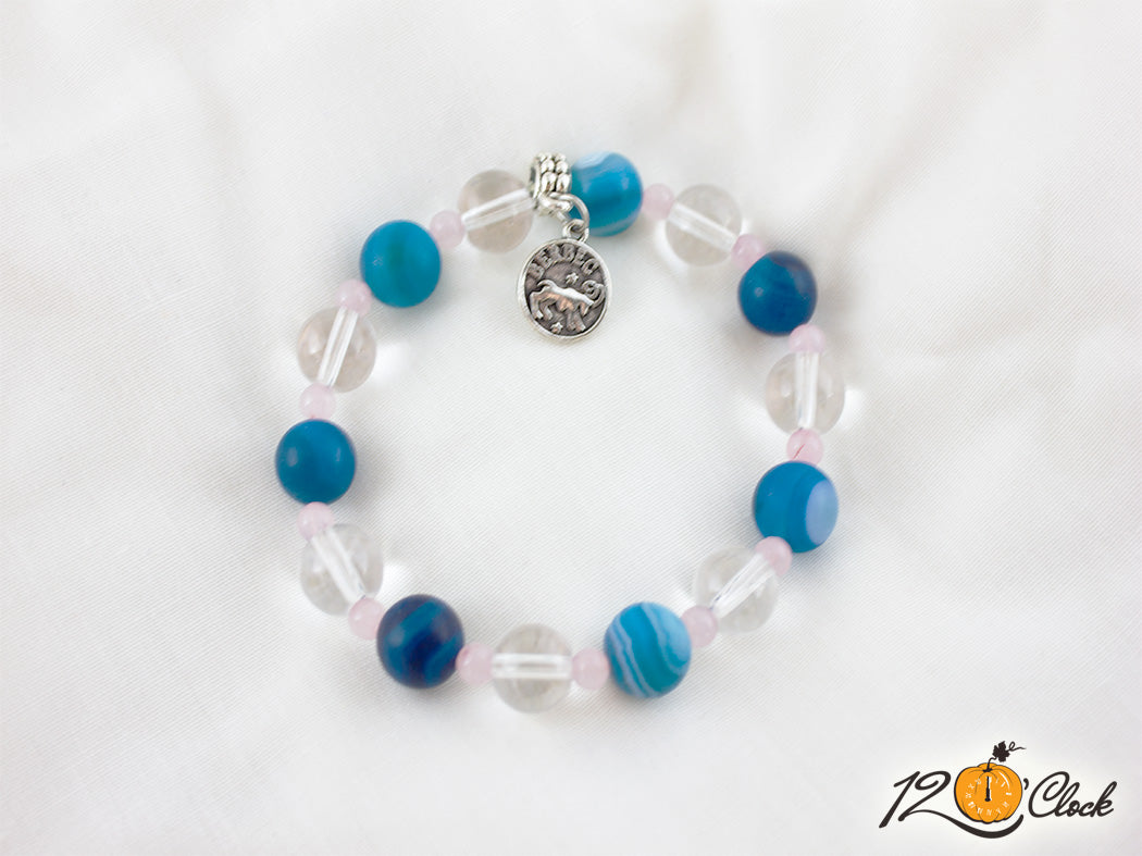 Ръчно изработена гривна от еластична корда, зодиакална висулка и уникална комбинация от син ивчест ахат мат 10мм, планински кристал 10мм и розов кварц 4мм.