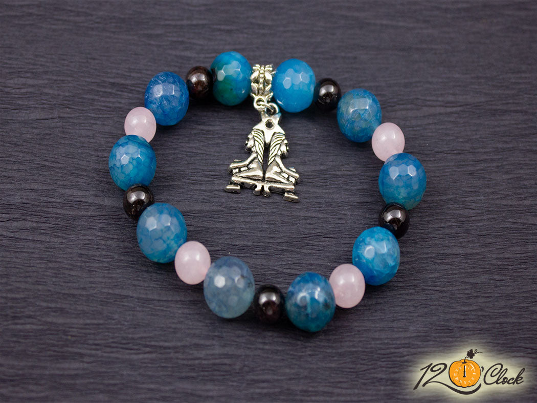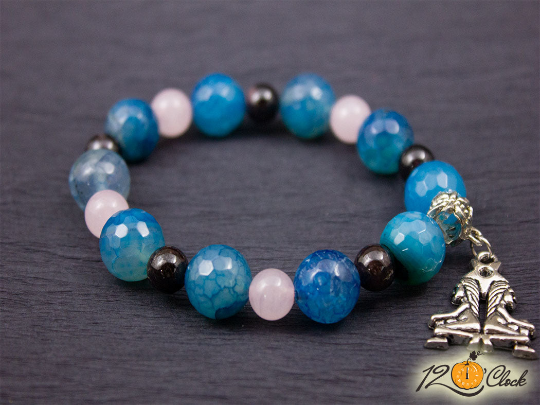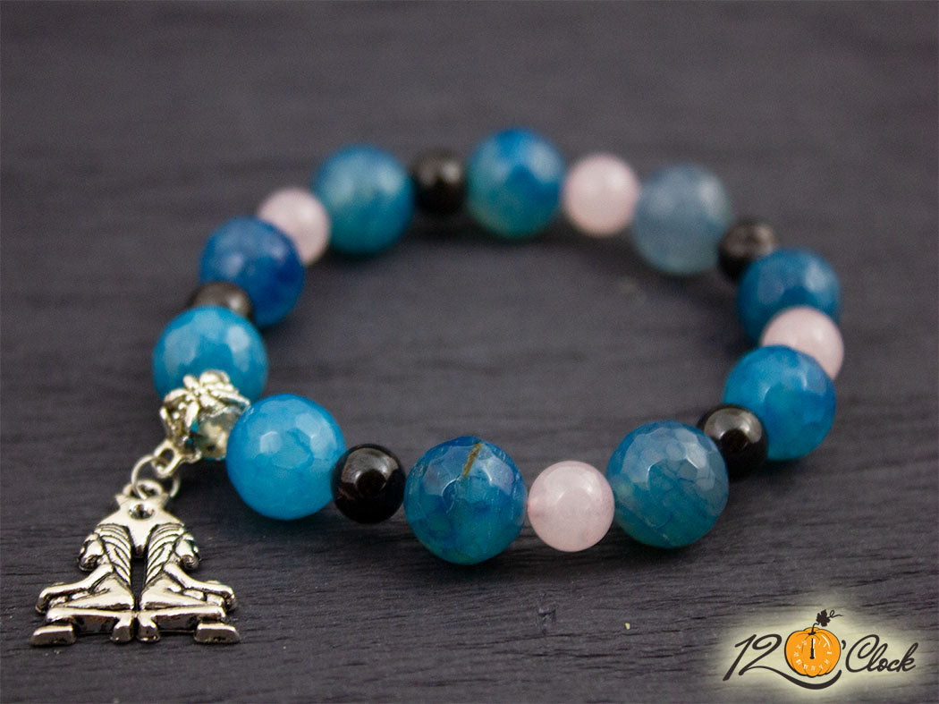 Ръчно изработена гривна от еластична корда, метална зодиакална висулка и камъни от фасетиран драконов ахат 12мм, гранат 8мм и розов кварц 8мм.