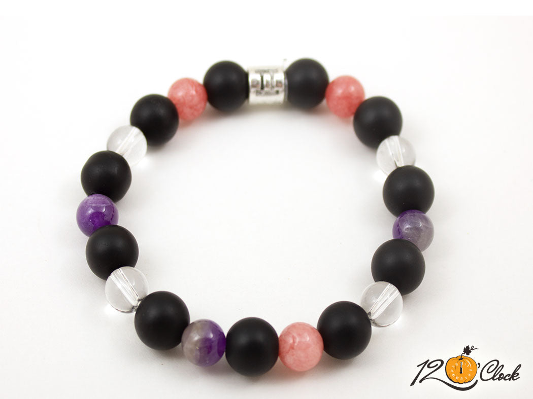 Ръчно изработена гривна от еластична корда, зодиакален пръстен и камъни от оникс мат 10мм, ягодов кварц 8мм, планински кристал 8мм и аметист 8мм.