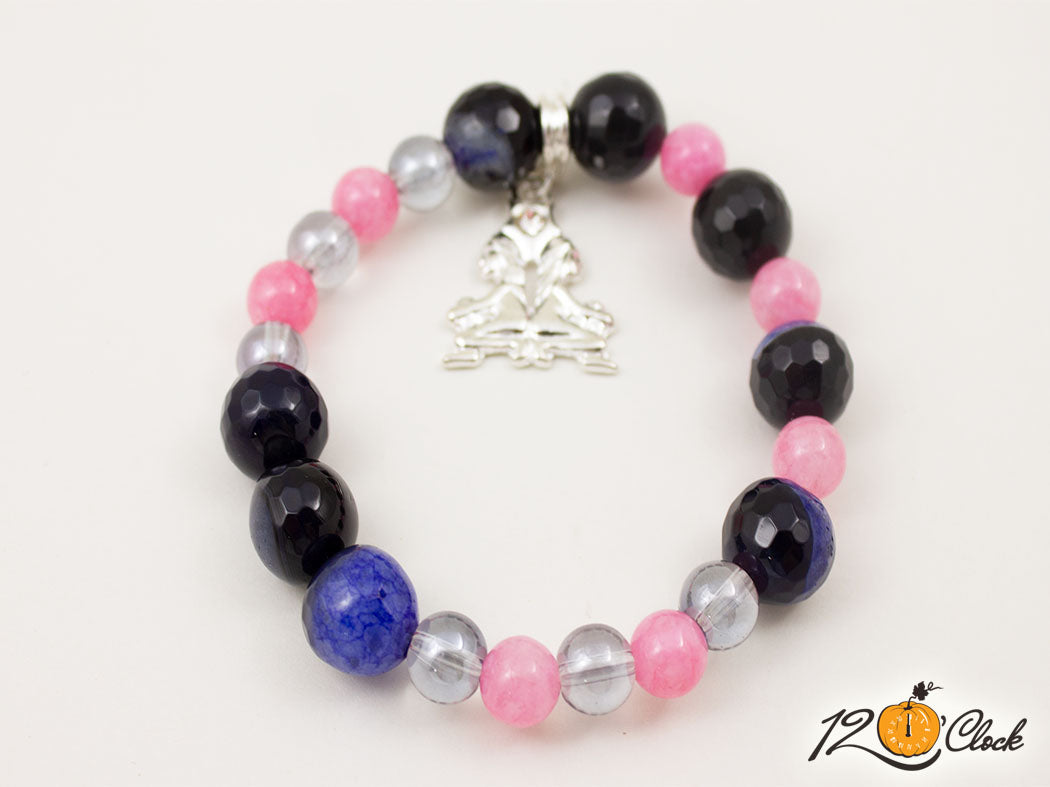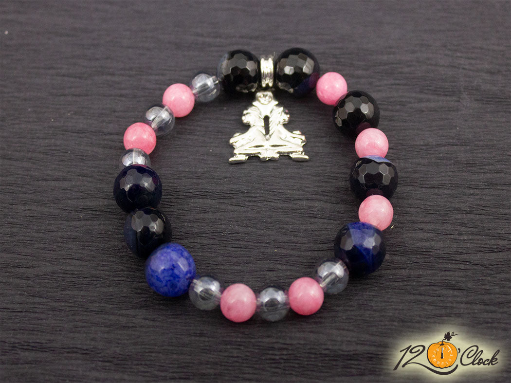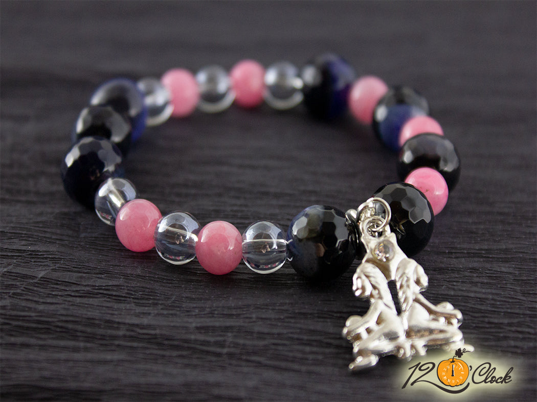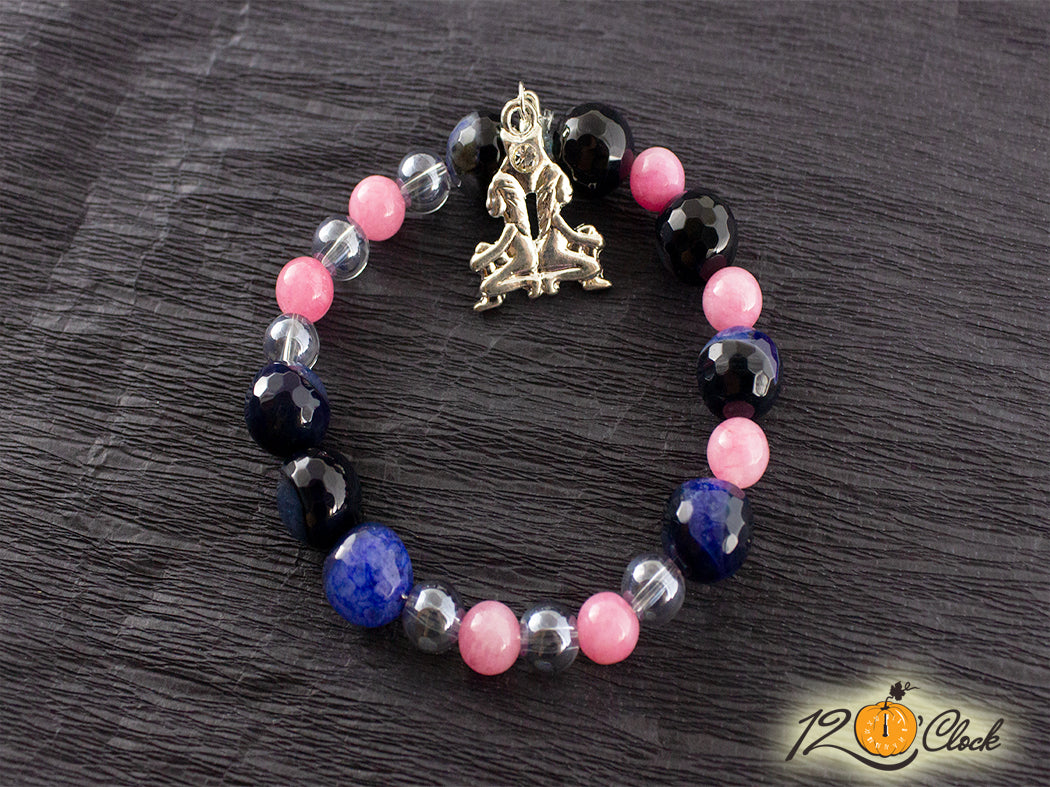 Ръчно изработена гривна с еластична корда, зодиакална висулка в комбинация от тъмно син ивчест,фасетиран ахат 12мм, ягодов кварц 8мм и кристал 8мм.