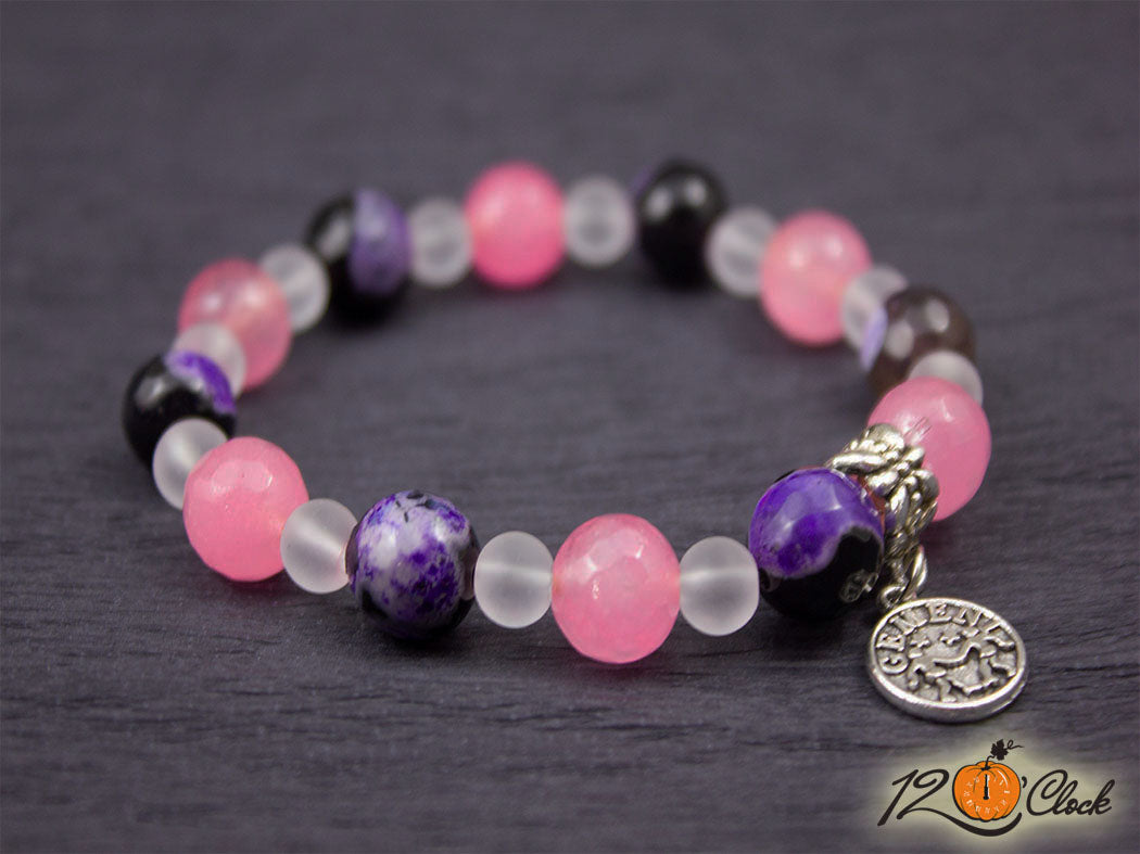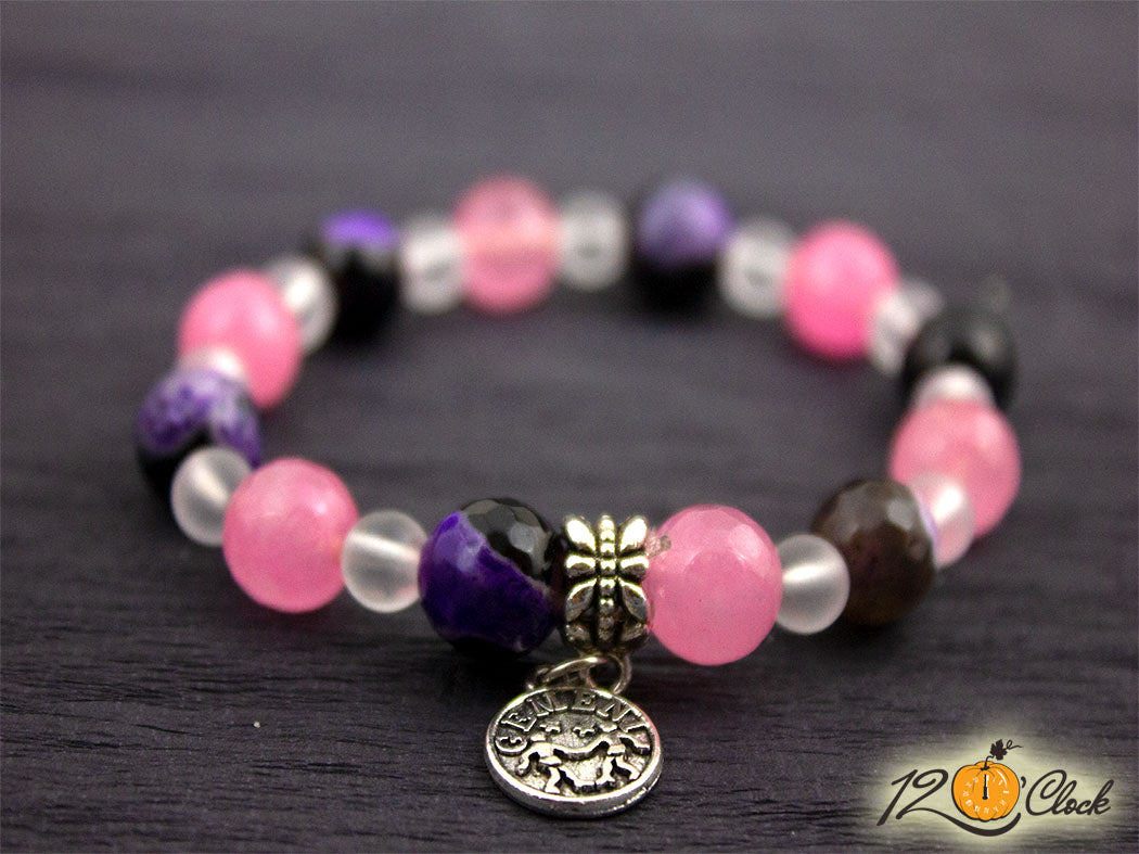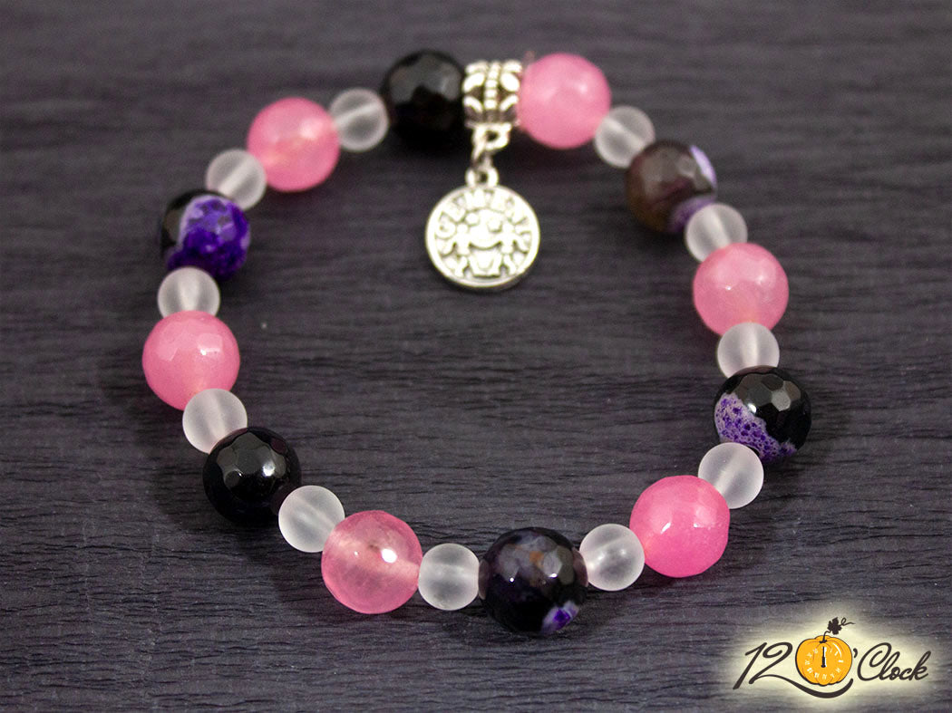 Ръчно изработена гривна от еластична корда, зодиакална висулка в нежно съчетание от лилав фасетиран драконов ахат 10мм, розов фасетиран кварц 10мм и планински кристал мат 6мм.