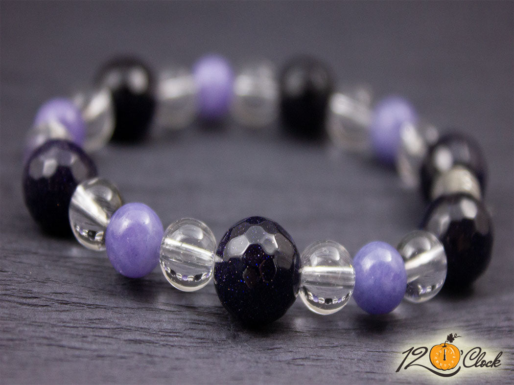 Ръчно изработена гривна от еластична корда, слънчев фасетиран камък 12мм, аквамарин 8мм и планински кристал 8мм.