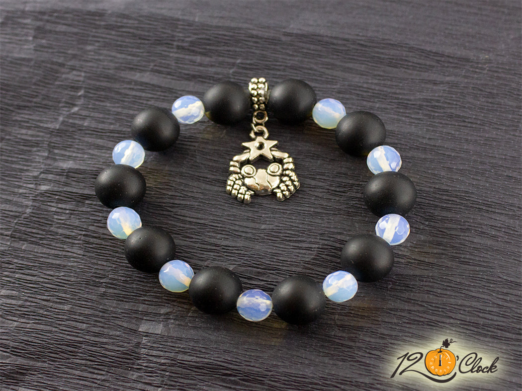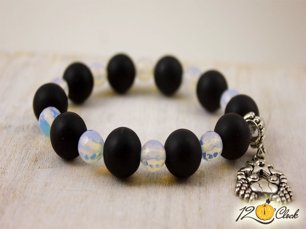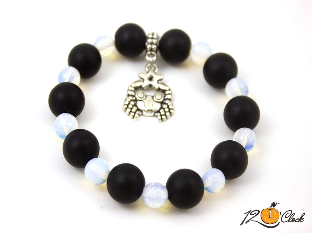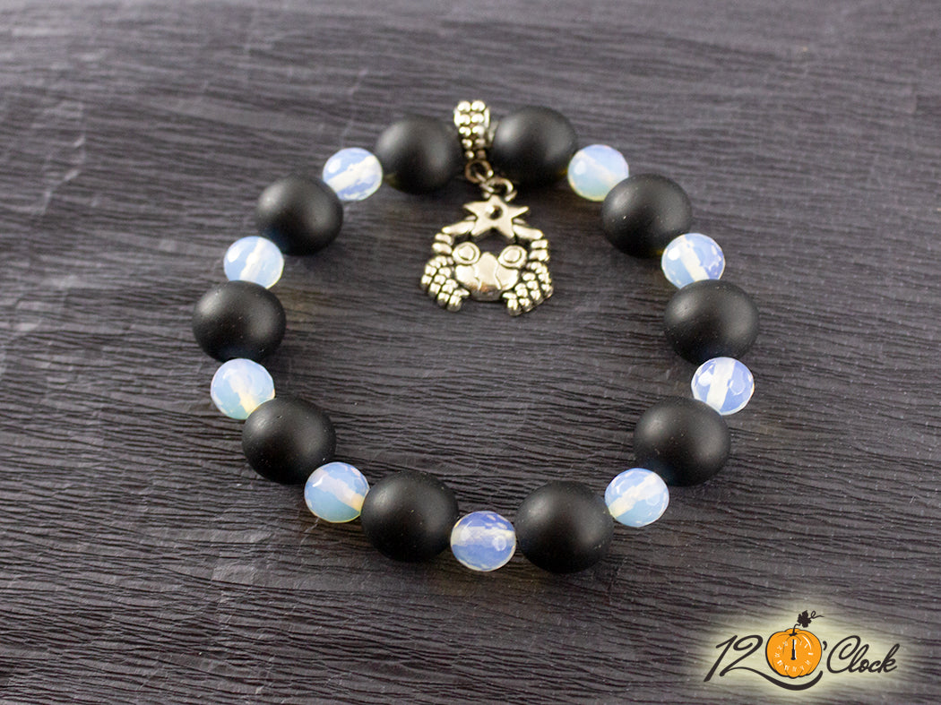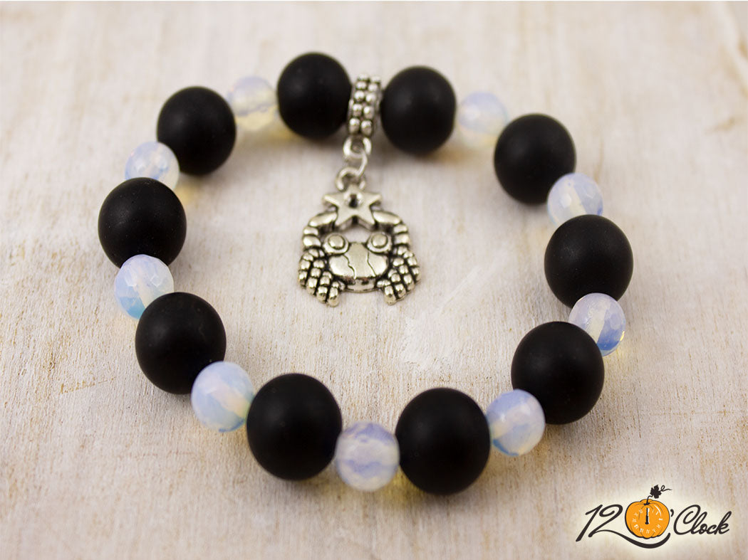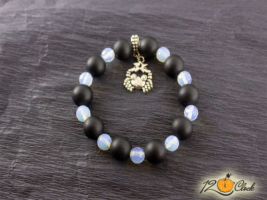 Ръчно изработена гривна с еластична корда, метален разделител с фигурка рак, в комбинация с оникс мат 12мм и фасетиран лунен камък 8мм.